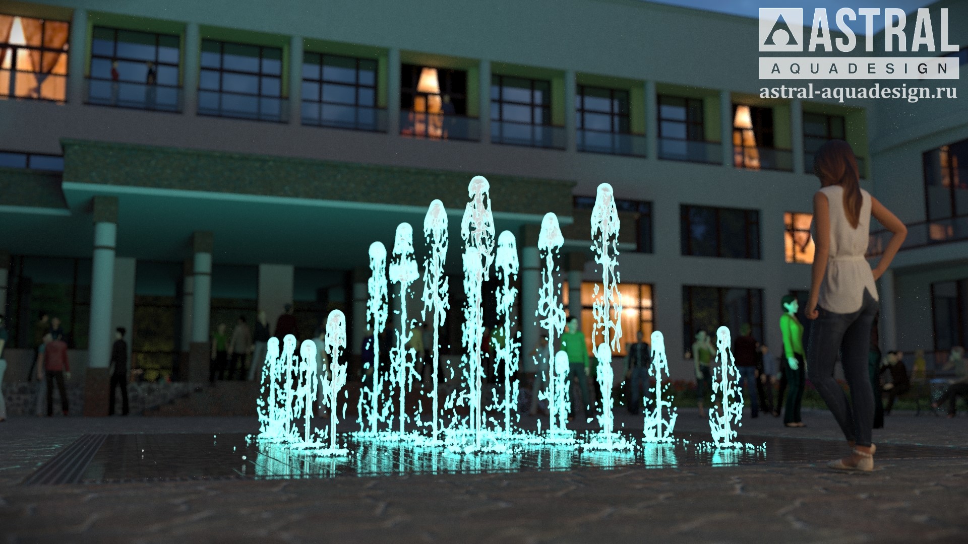 Здесь представлена концепция нового пешеходного фонтана из 16 струй. Плоскостной динамический фонтан "Мой район" оснащен подсветкой и работаем по 2-м контурам воды и 4-м контурам света.