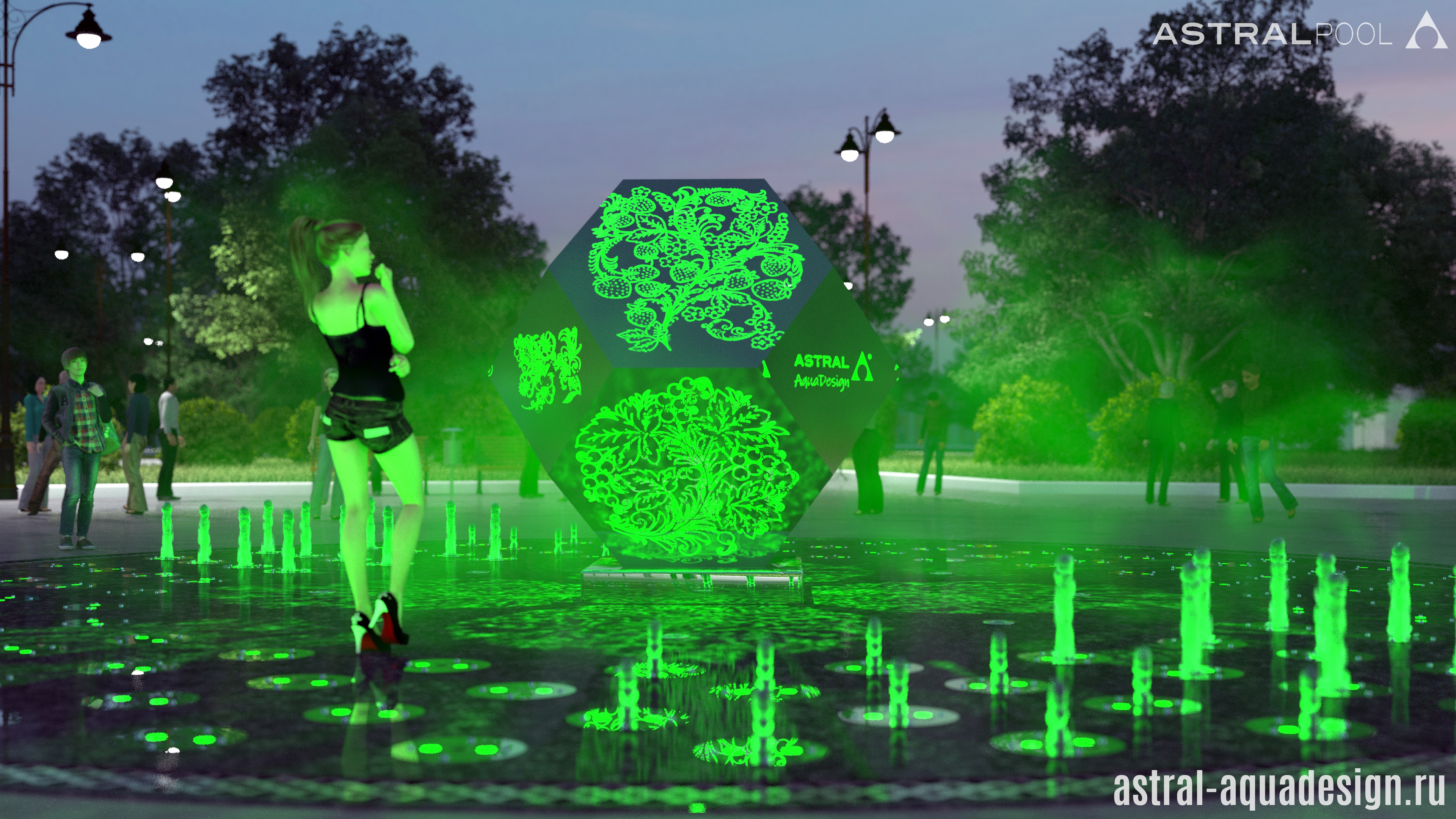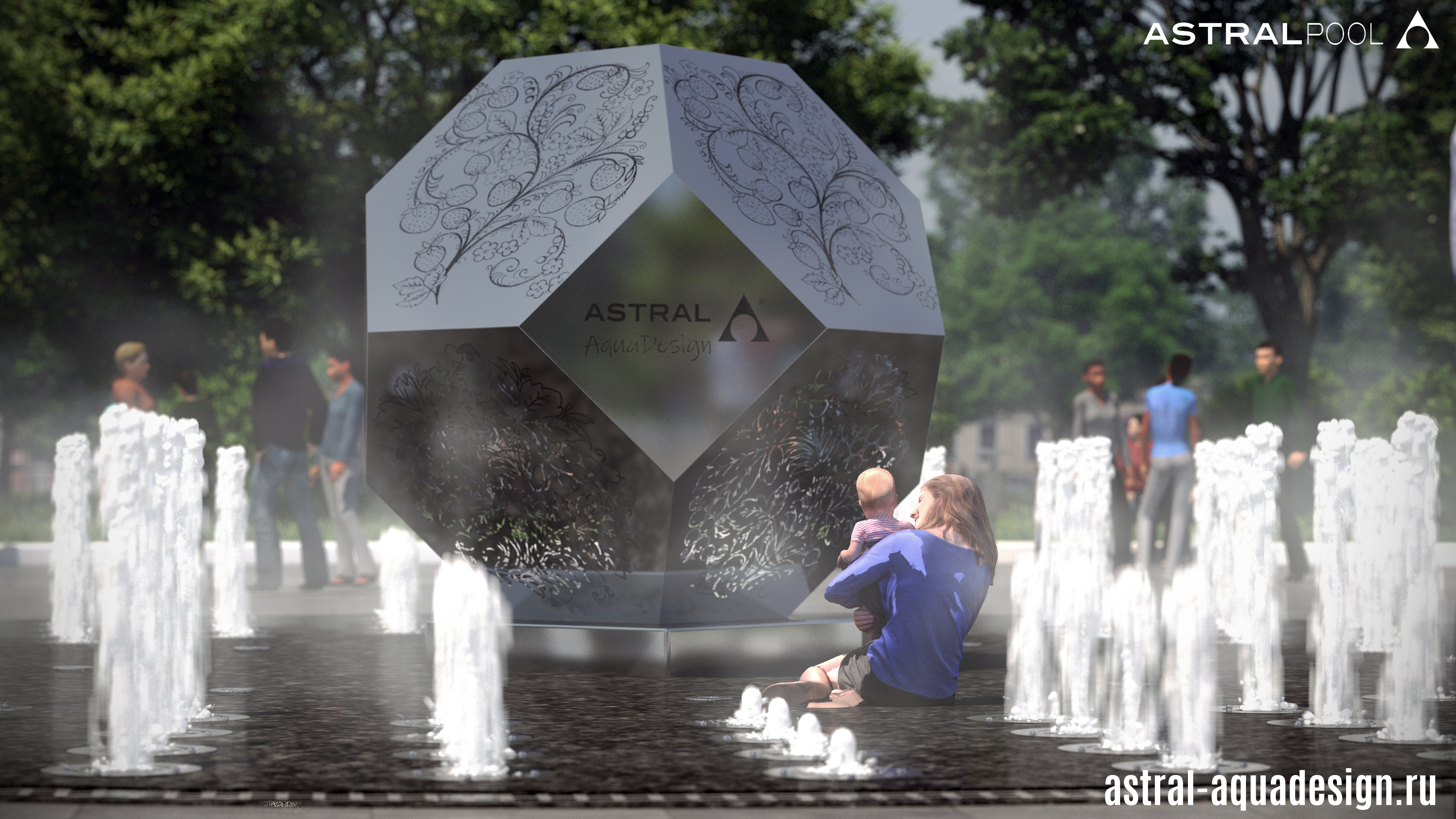 Для данного проекта предусмотрена чаша диаметром 12 метров с облицовкой материалом имитирующим серый гранит. Скульптурная композиция из полированной нержавеющей стали представляет собой усечённый кубооктаэдр (полуправильный многогранник). Часть его граней украшает узор в виде клубники. Фигура является полой а узор прорезан насквозь. Внутри установлен светильник свет от которого виден сквозь прорези. Отражаясь от поверхности чаши, он дает потрясающий оптический эффект.