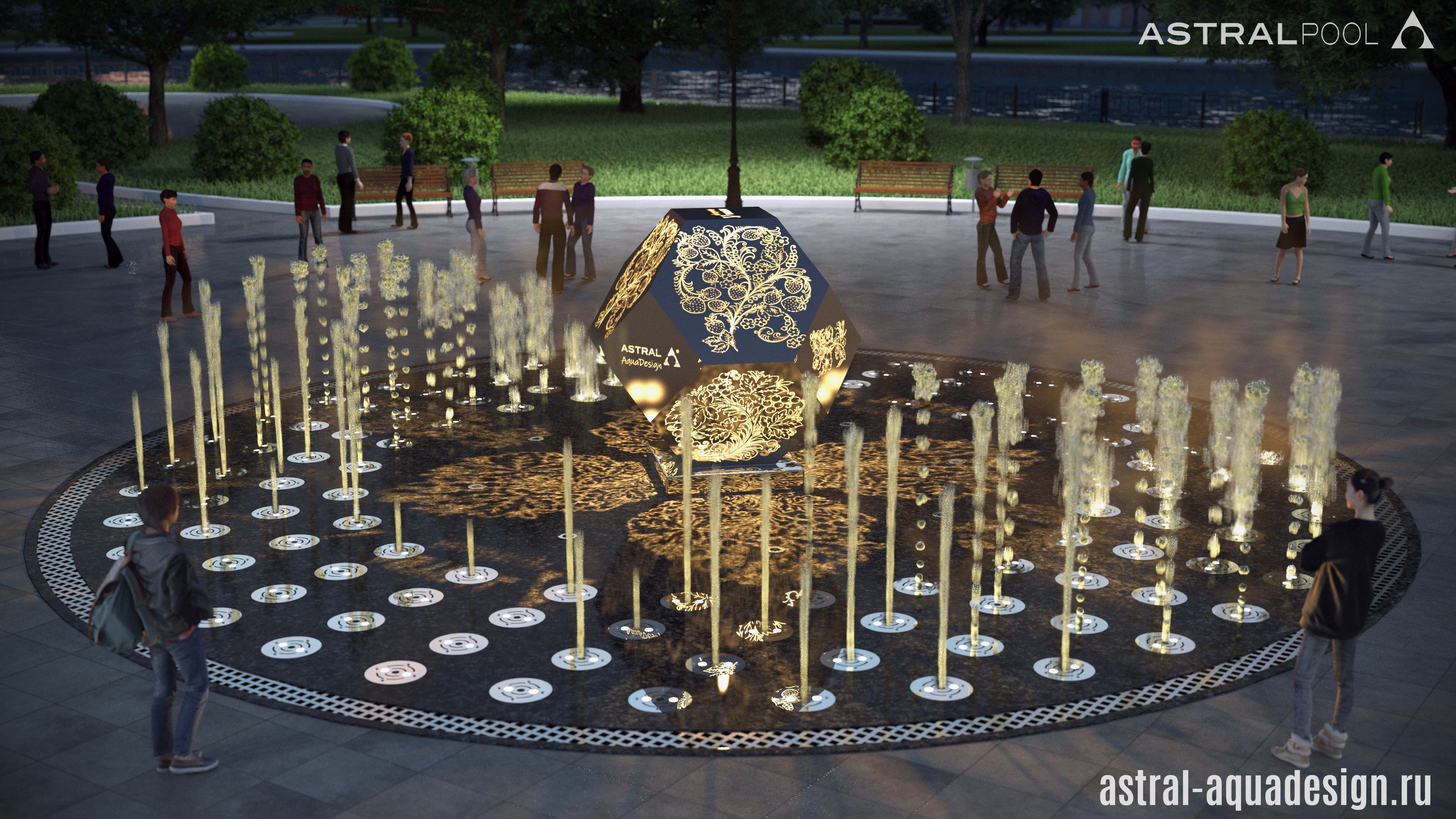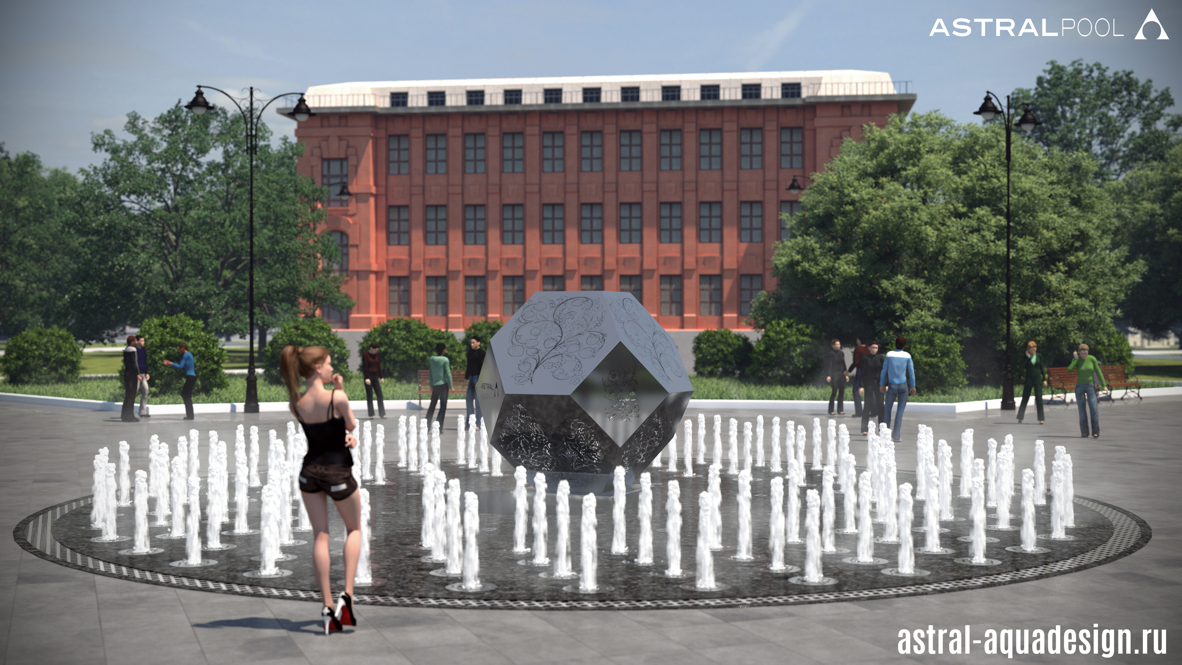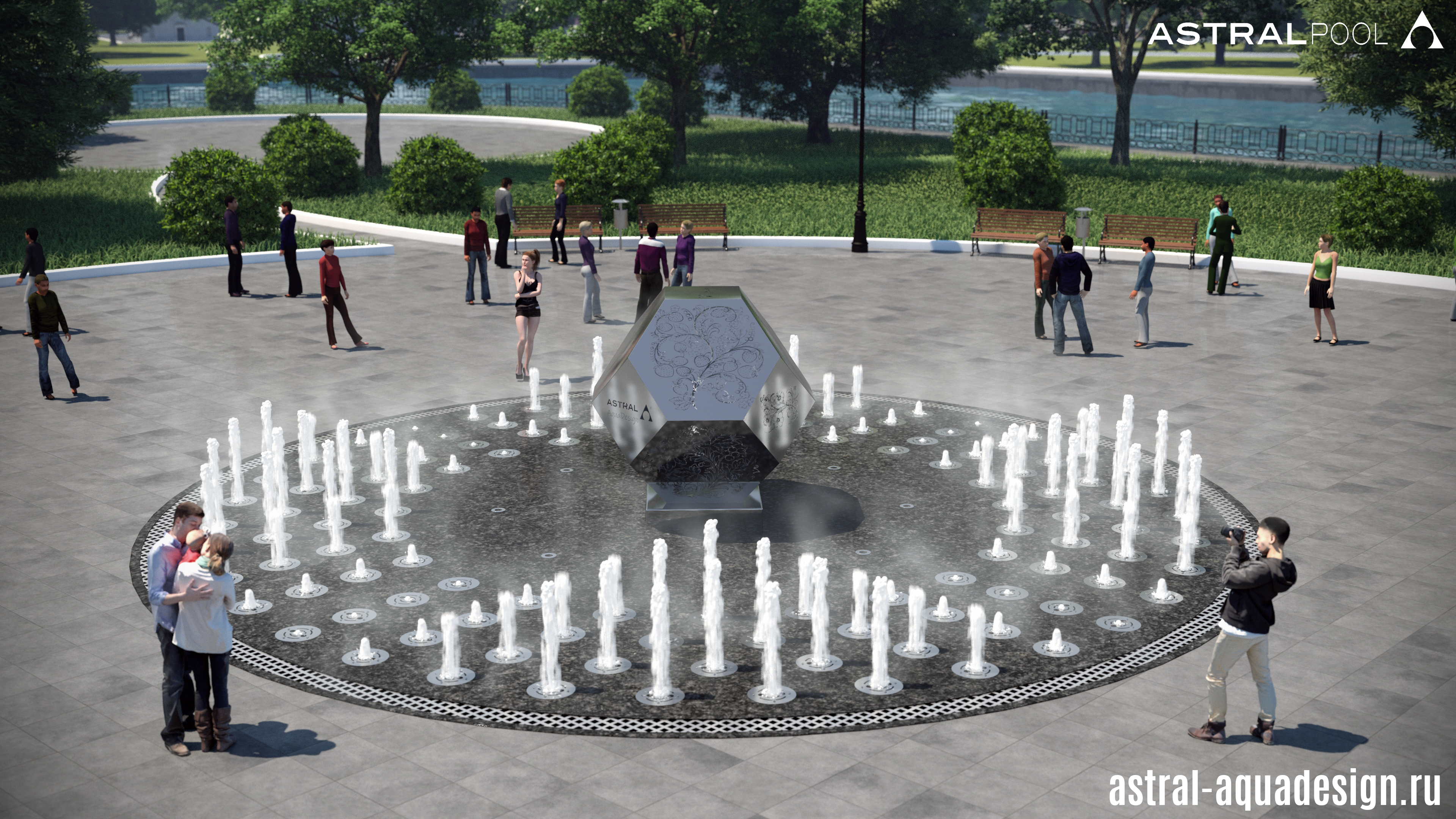 Мы разработали проект необычного пешеходного фонтана со скульптурой в центре. Водную картину создают три ряда пешеходных модулей. Каждый из которых оснащен двумя LED светильниками. Согласно заранее разработанному сценарию струи могут подниматься на различную высоту одновременно либо образовывать волну.
