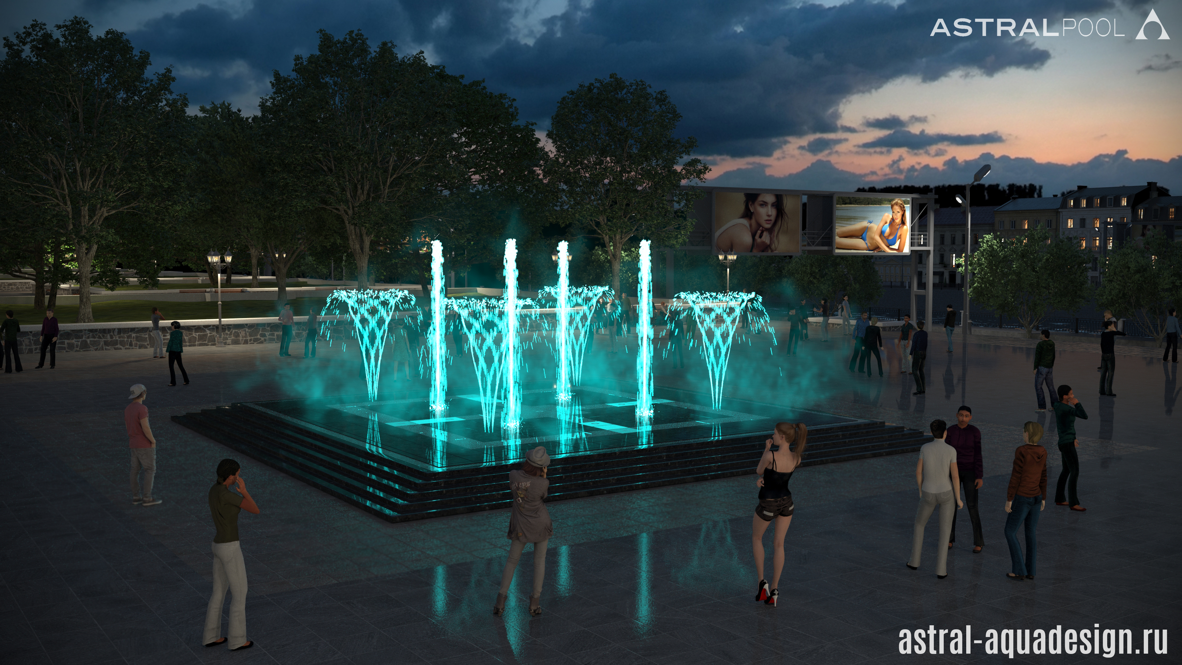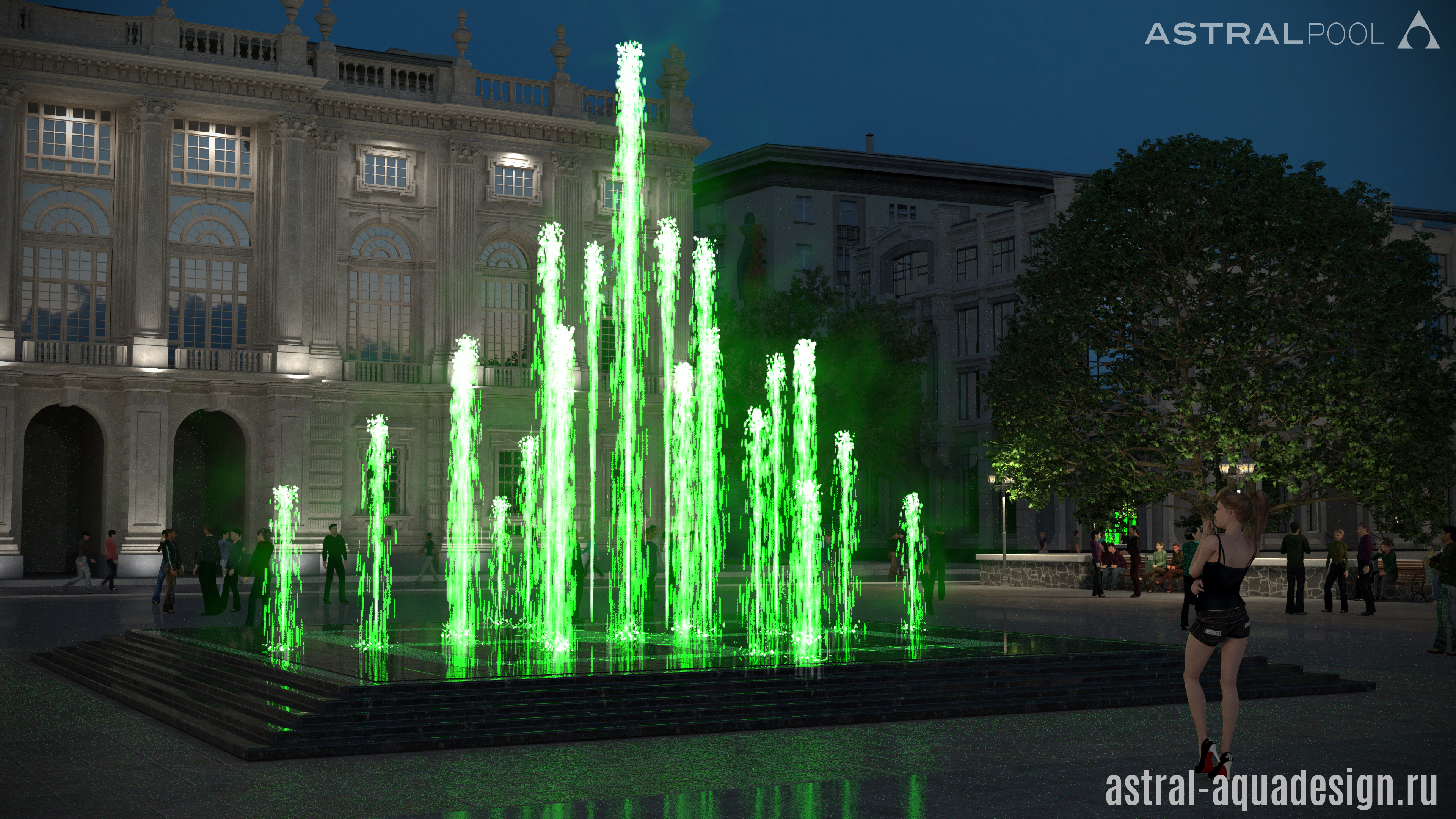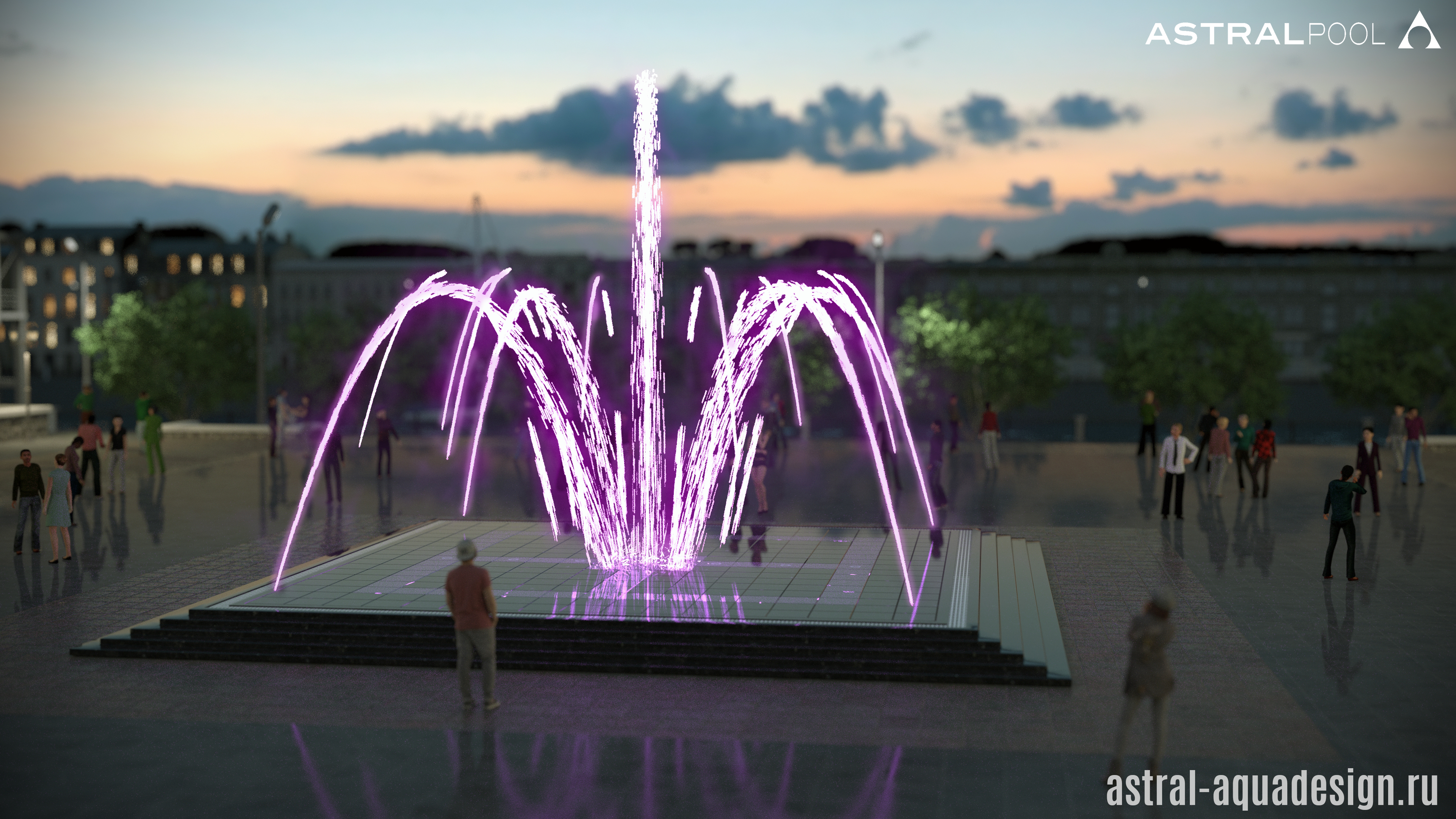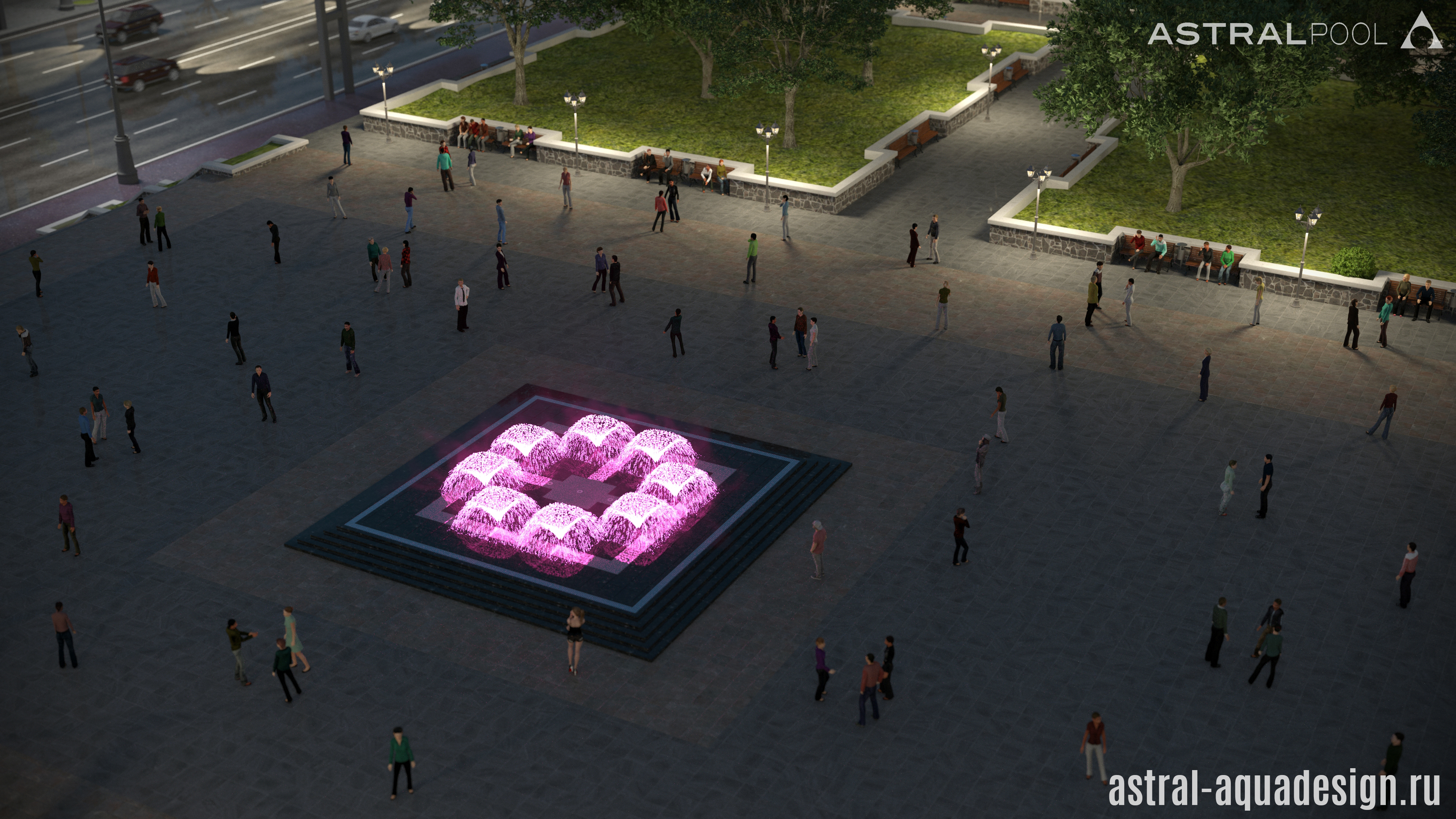 Проект пешеходного фонтана-подиума имеет оригинальную схему подсветки. Помимо струй, динамическая подсветка предусмотрена и для орнамента чаши. Разнообразные водные эффекты составляют затейливую водную картину. Основу композиции составляют разноуровневые пенные столбы. Их дополняют параболические, сходящиеся к центру. Ротационные насадки вкупе с многоструйными установлены по периметру чаши, а по краям располагаются туманные насадки.