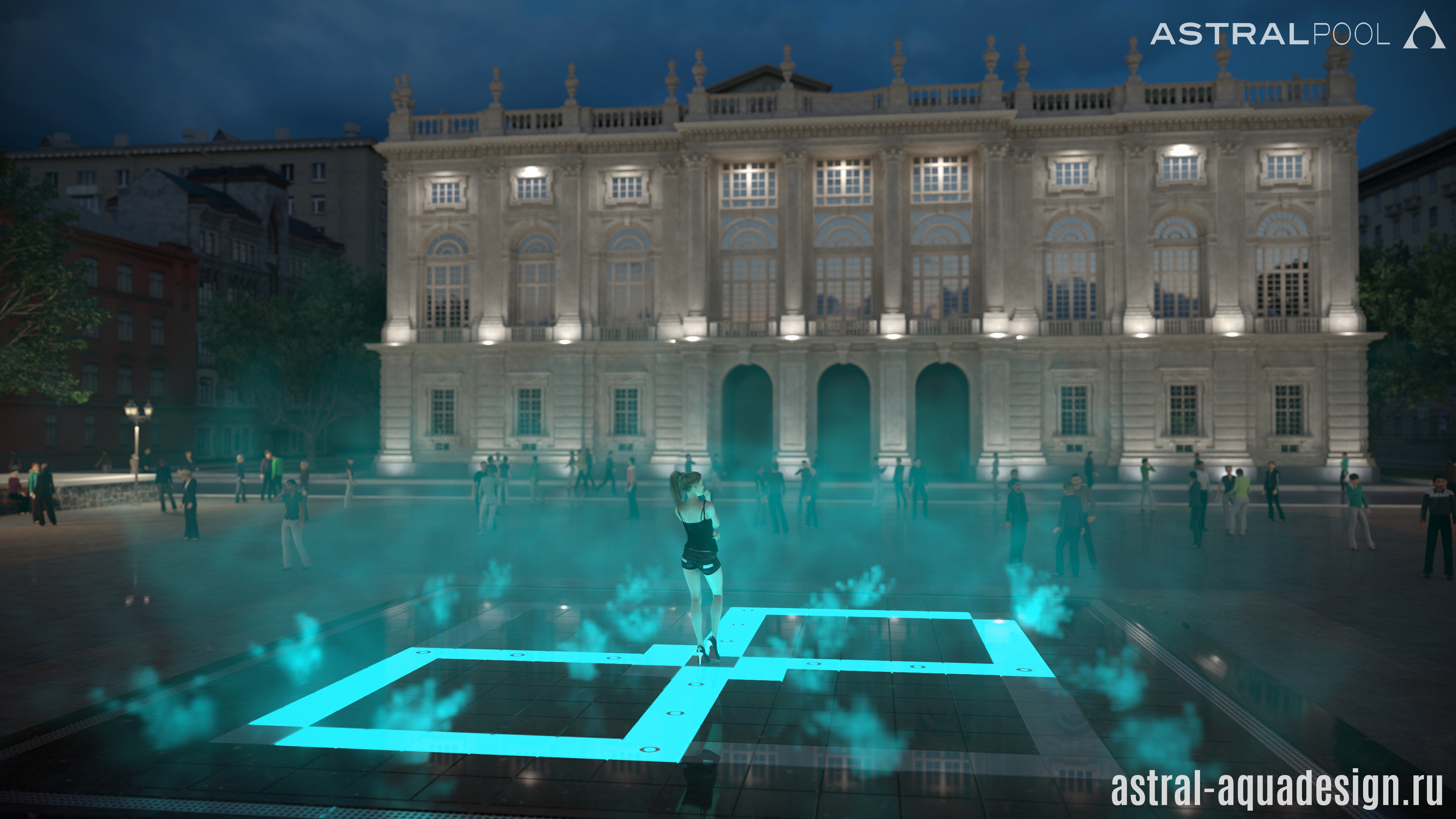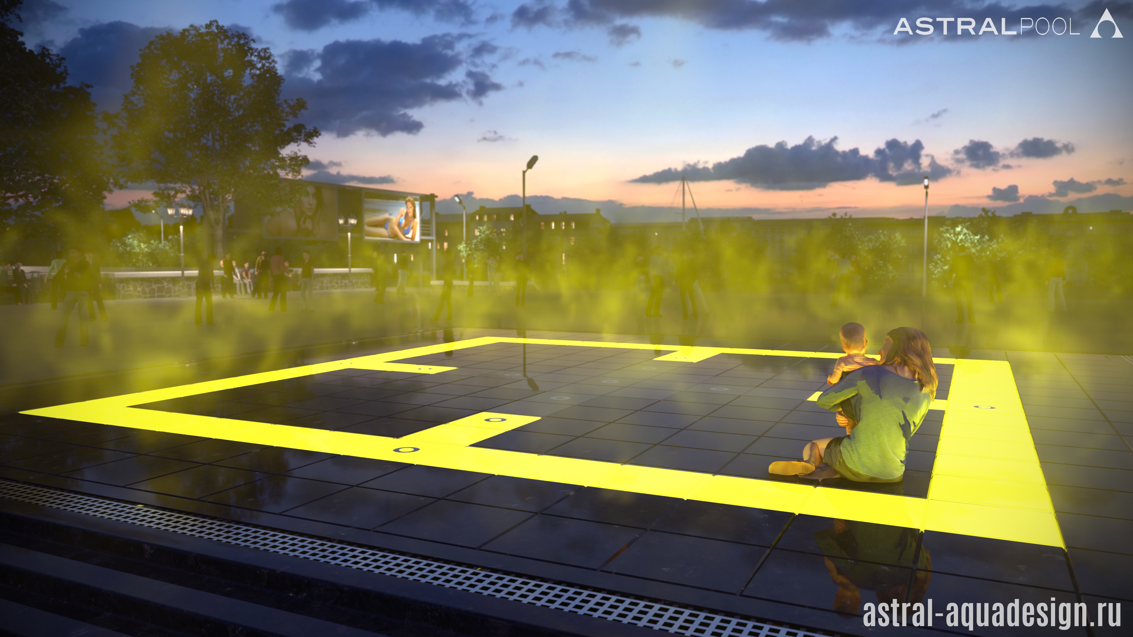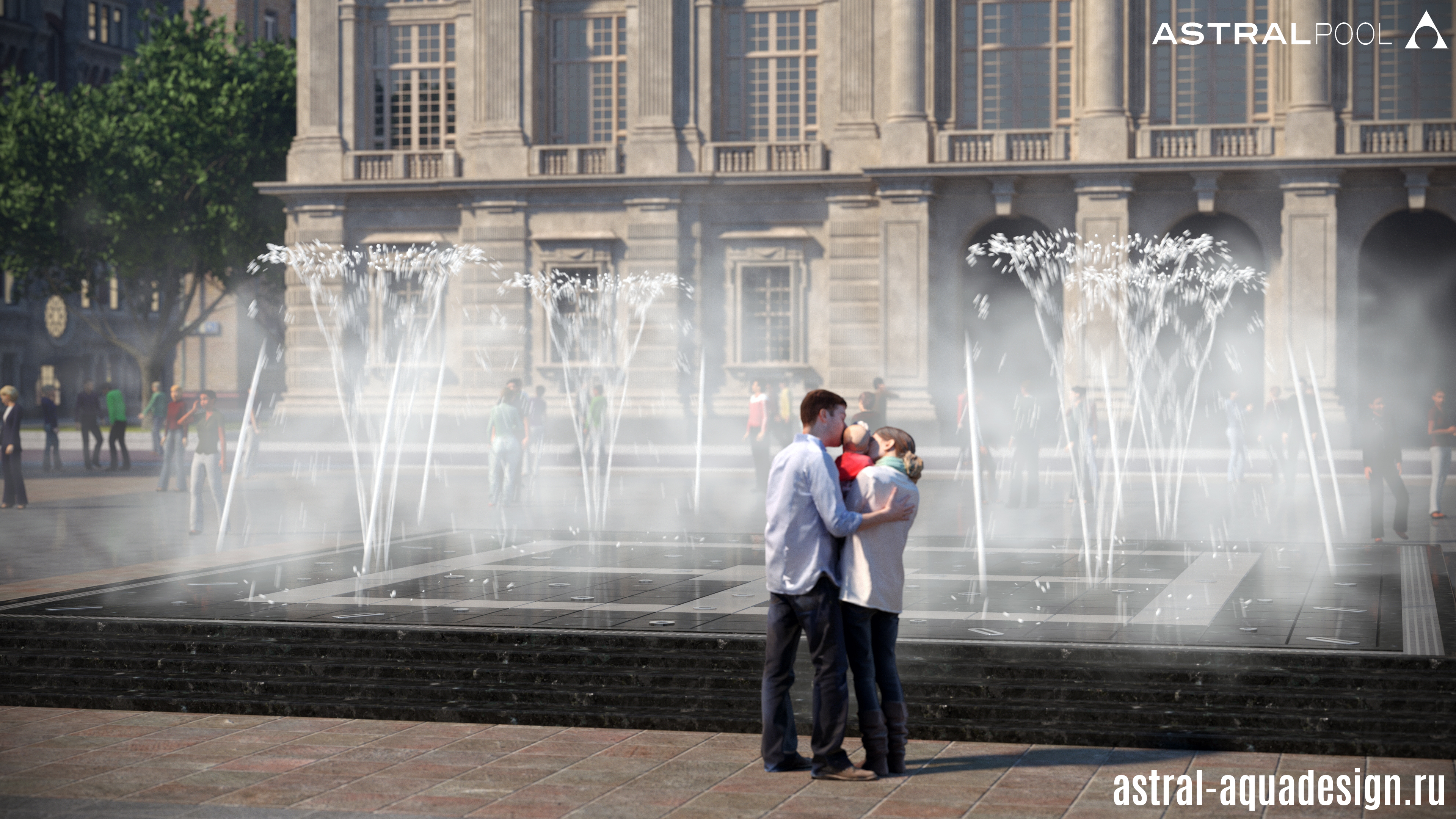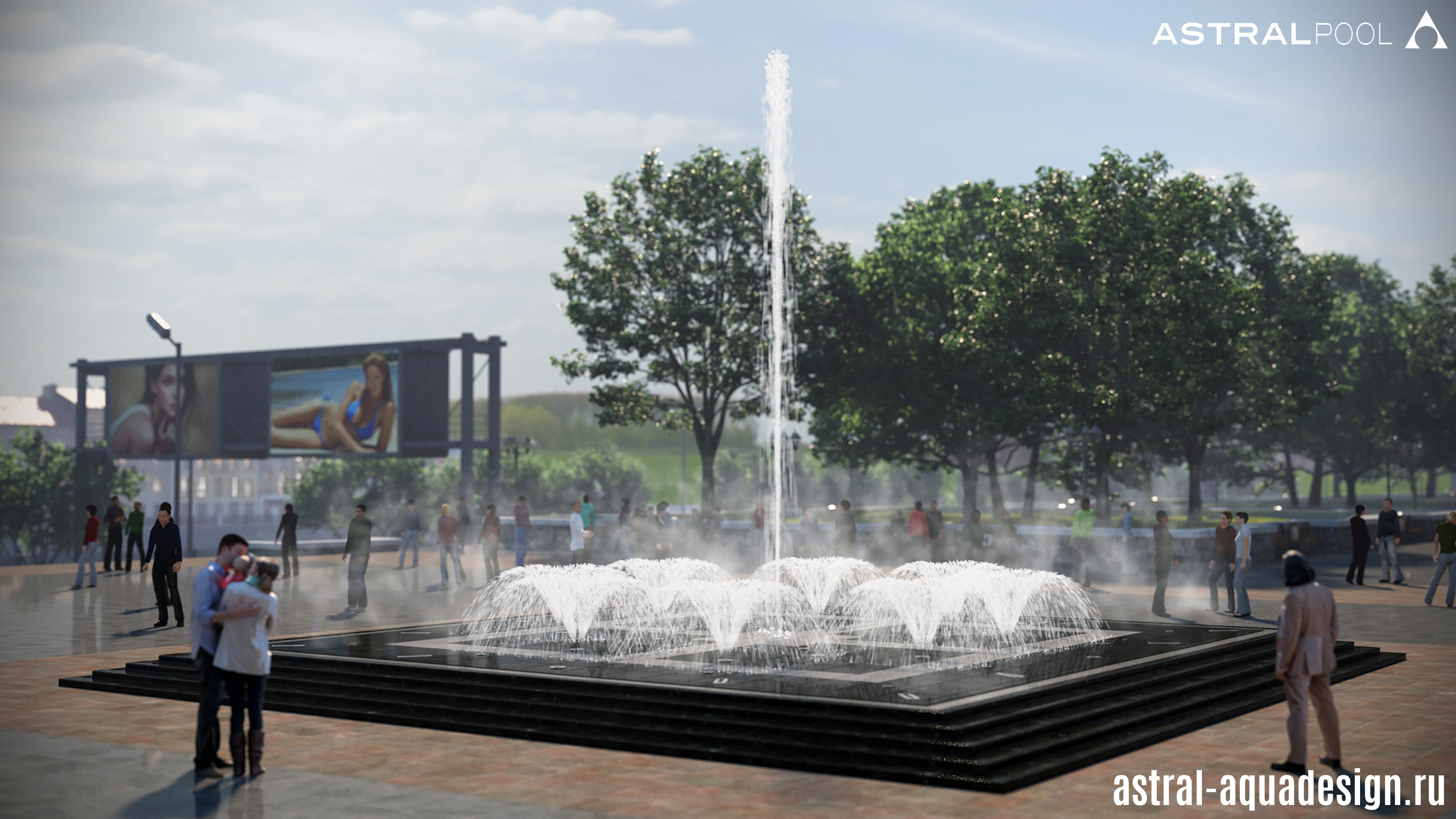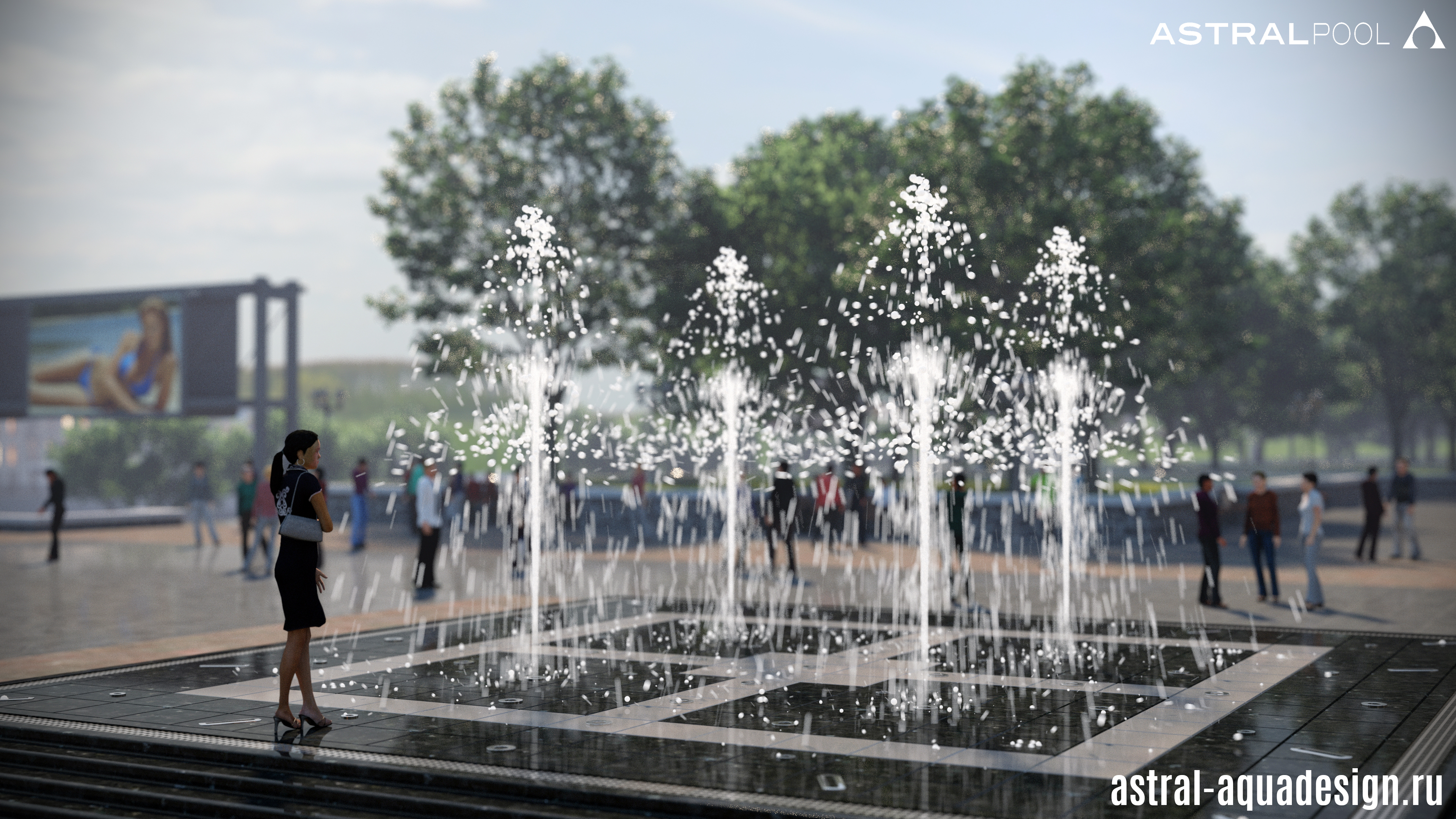 Проект пешеходного фонтана-подиума имеет оригинальную схему подсветки. Помимо струй, динамическая подсветка предусмотрена и для орнамента чаши. Разнообразные водные эффекты составляют затейливую водную картину. Основу композиции составляют разноуровневые пенные столбы. Их дополняют параболические, сходящиеся к центру. Ротационные насадки вкупе с многоструйными установлены по периметру чаши, а по краям располагаются туманные насадки.