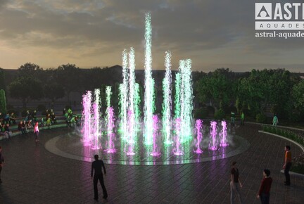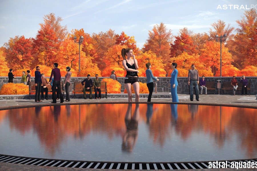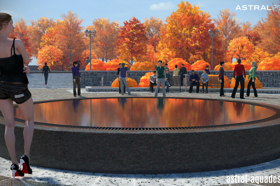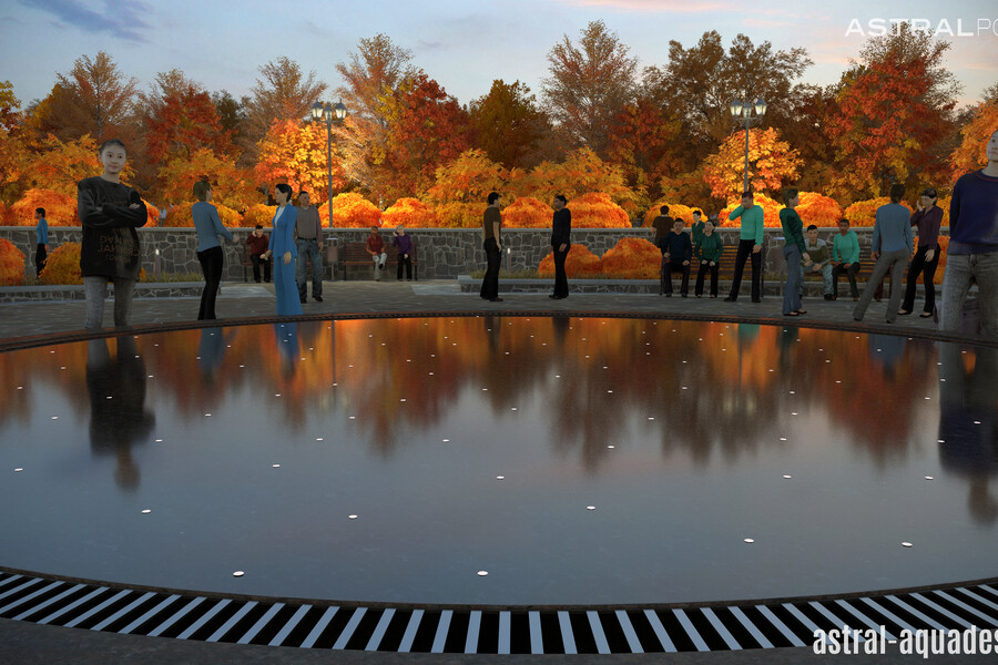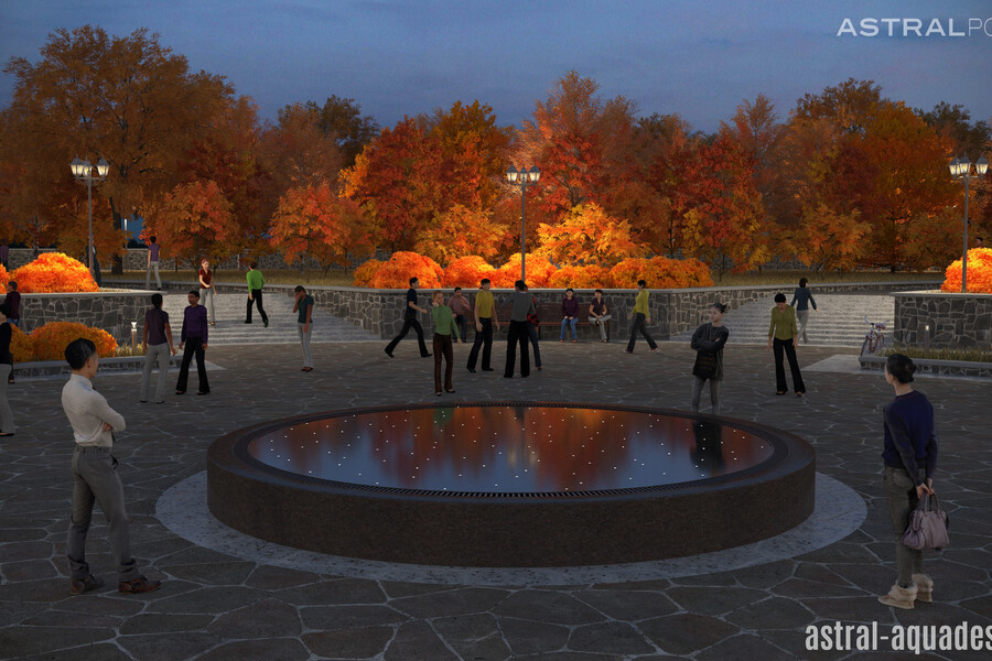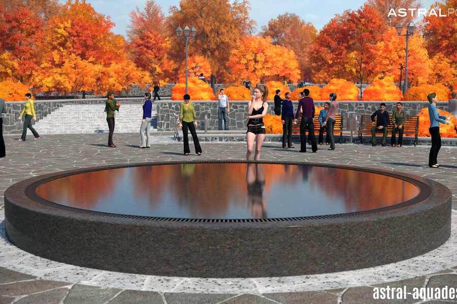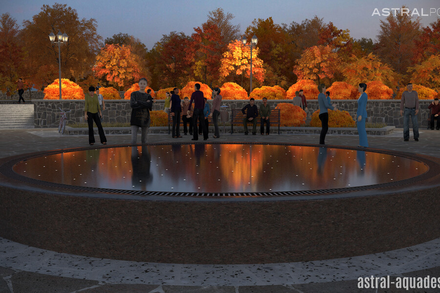 Проект переливного фонтана с круглой чашей может быть использован для строительства в парке Кургана. Предполагается использование высокого постамента из темного материала имитирующего гранит. Небольшая толщина водной глади, позволит использовать меньше воды, но при этом создаст идеальное зеркало, в котором будут отражаться элементы ландшафта.