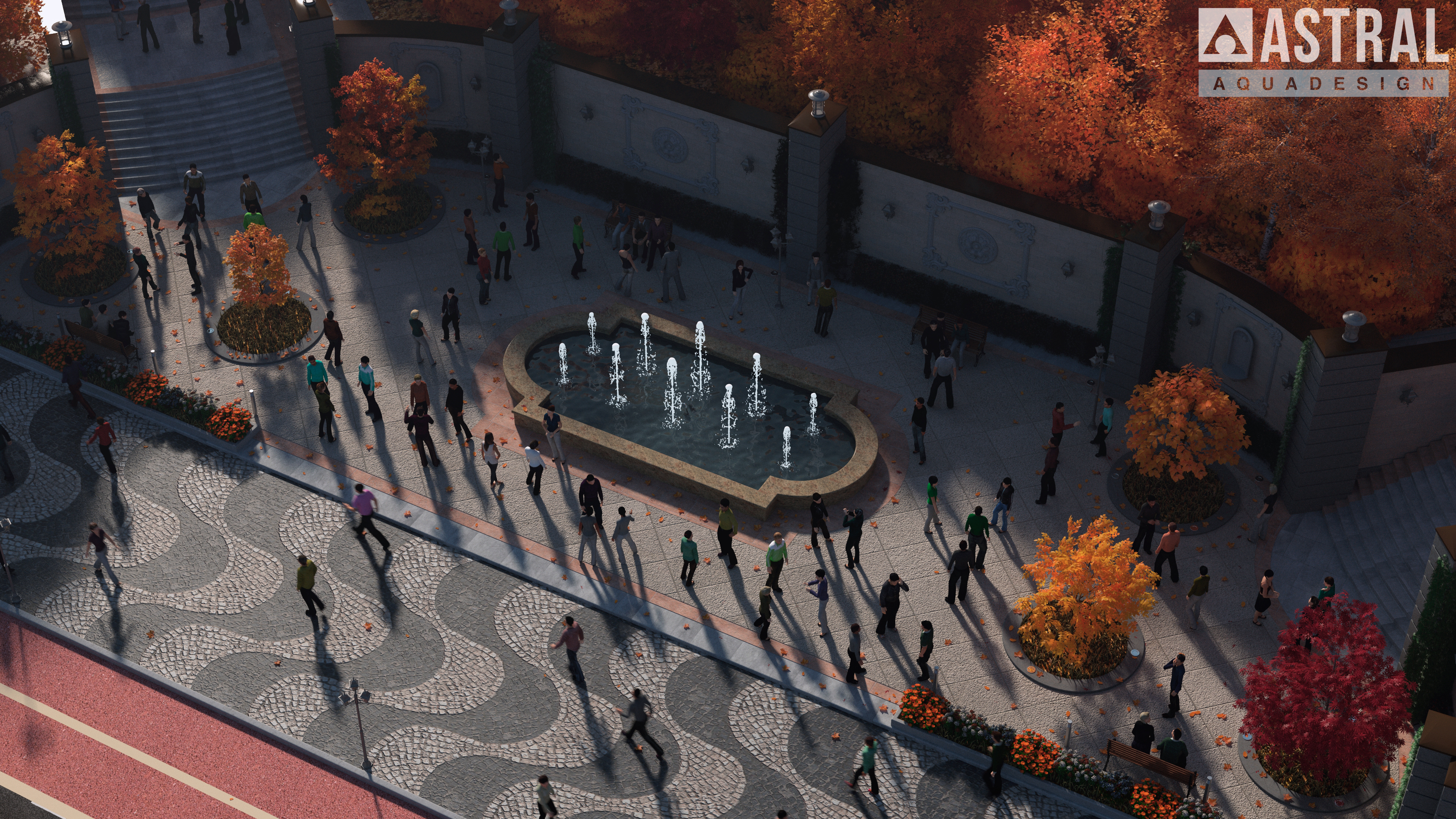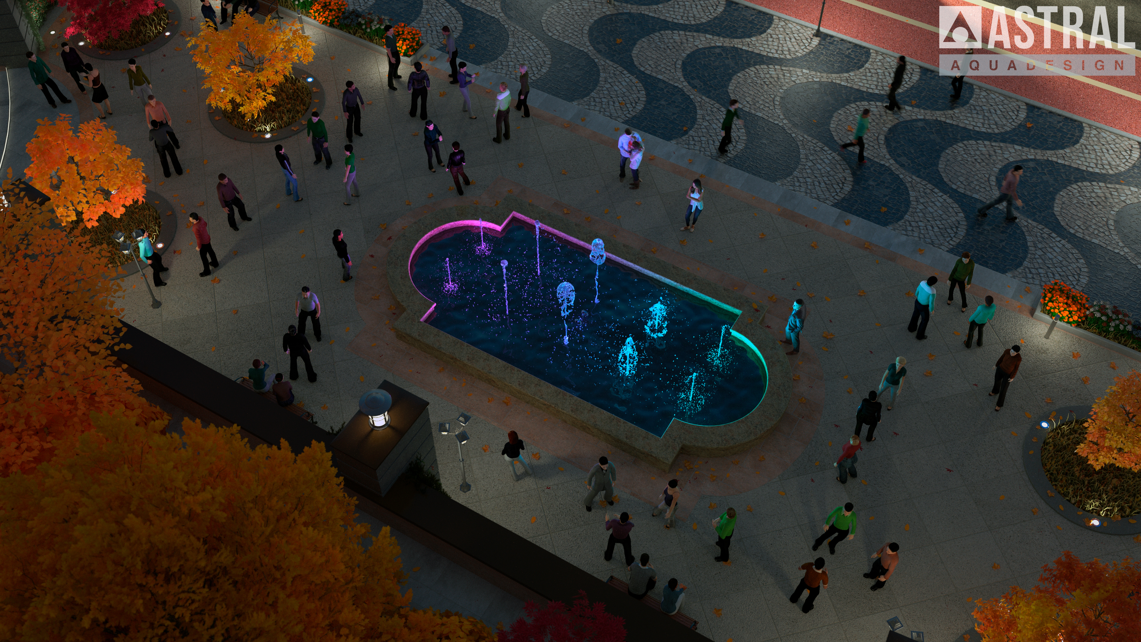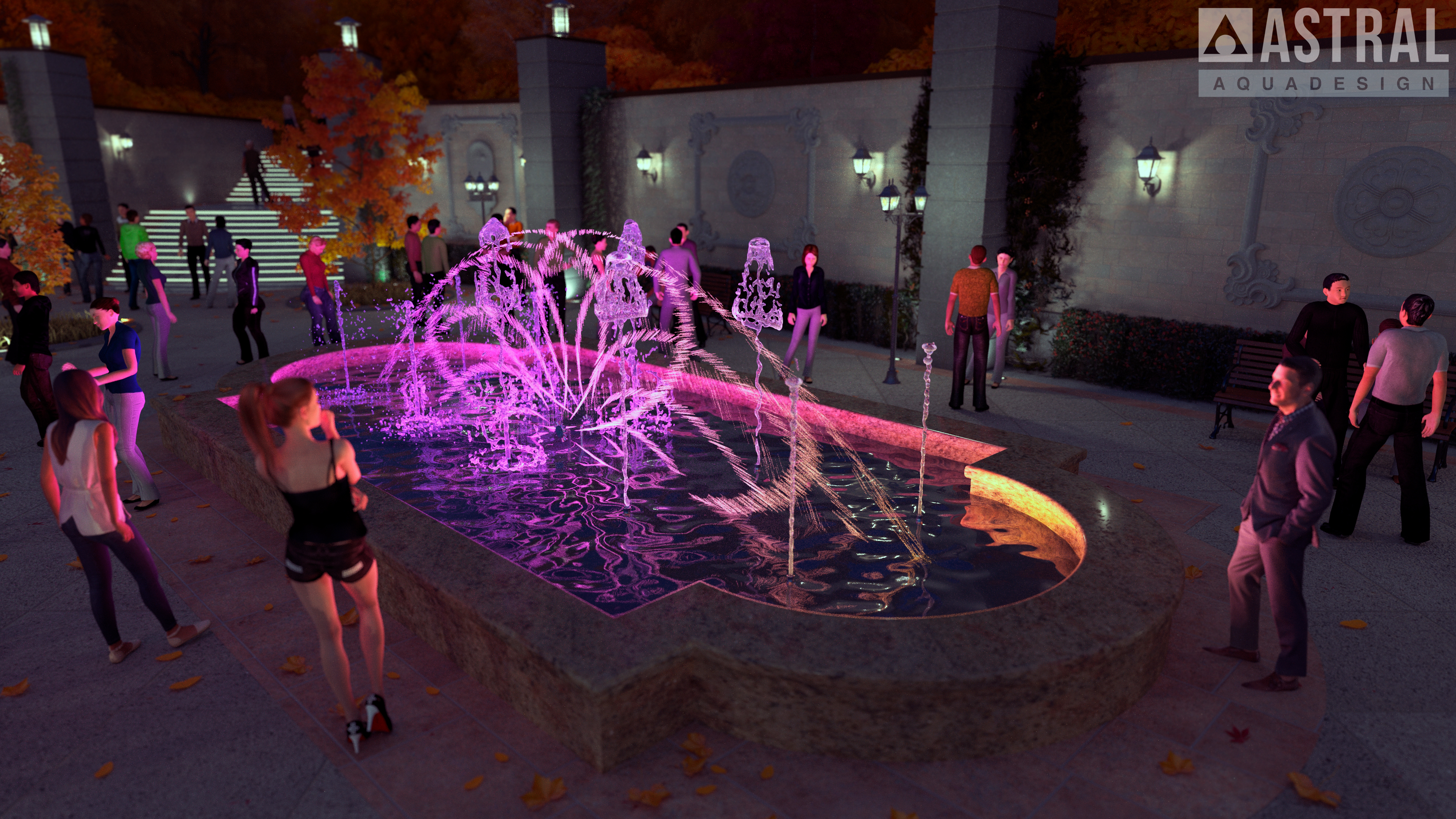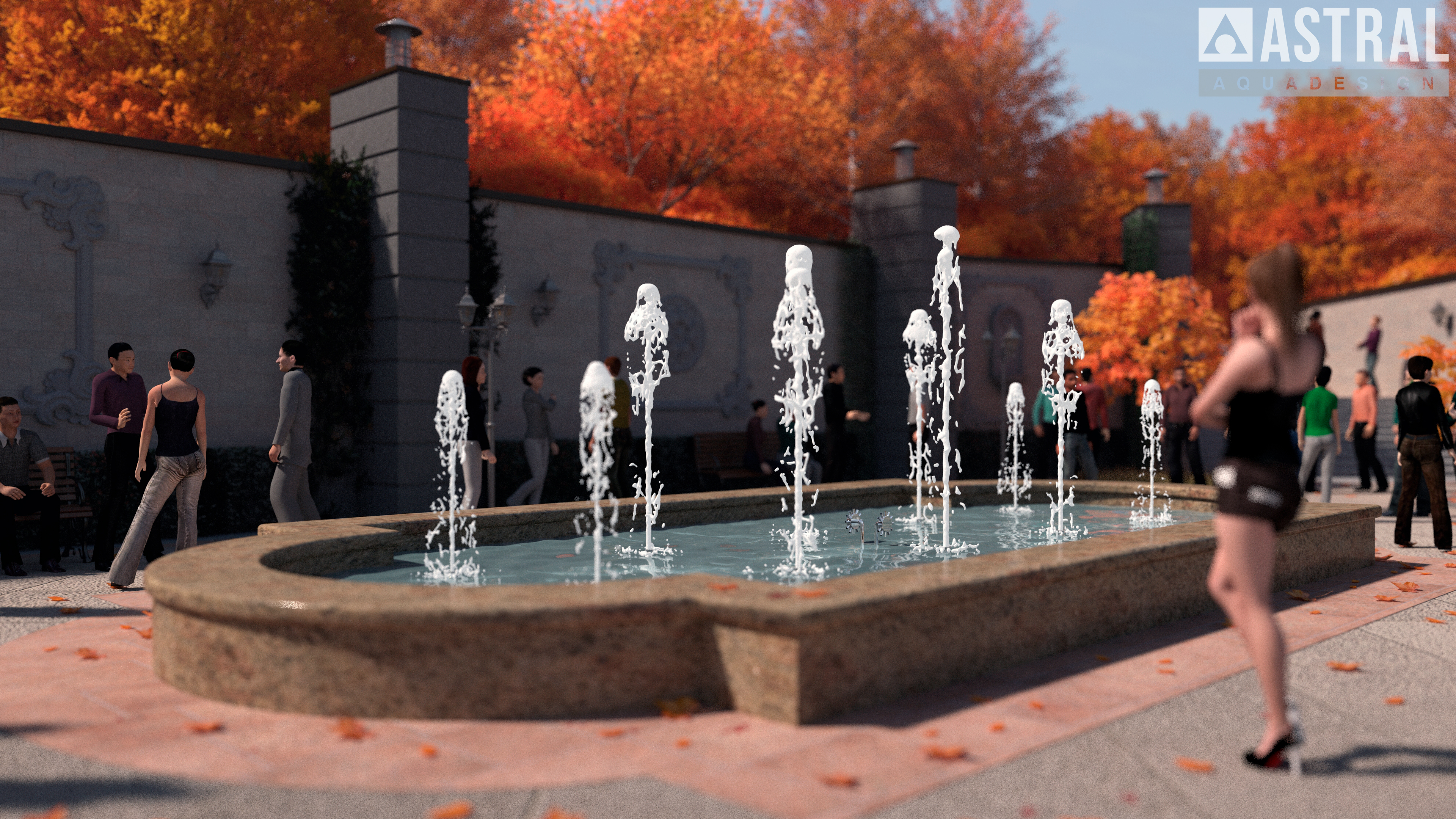 Ротационная фонтанная насадка создает удивительный узор, при котором большой объем воды находится в постоянном движении. Конструкция насадки монтируется в горизонтальном положении, при этом возникает оригинальный эффект «солнца», который прекрасно смотрится в музыкальных и динамических фонтанах. Габаритные размеры фонтана составляют 10 х 5 метров, высота "солнца" 2,5 метра, 10 пенных струй переменная от 1,5 до 2,5 метров.