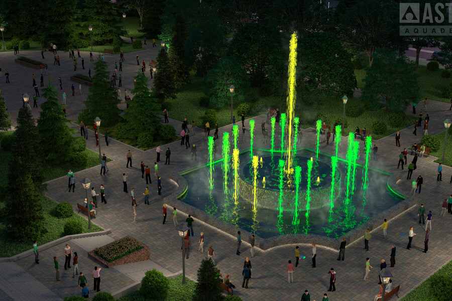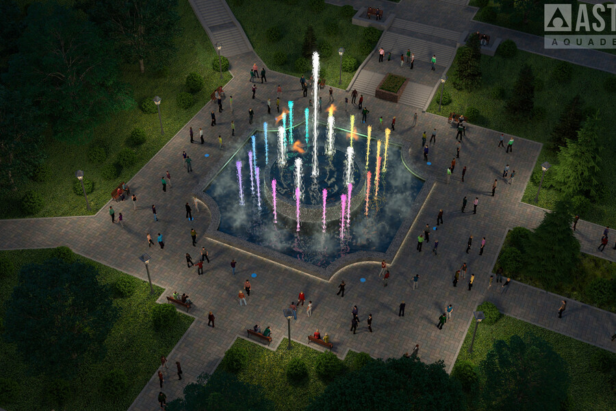 Базовое фонтанное оборудование в составе: насосы 36 шт., роботы 2D 4 шт., огненные форсунки 4 шт., водный экран с лазером и проектором, светильники RGBW 95 шт., светодиодная лента WW 110 погонных метров, сенсорные кнопки 8 шт.;