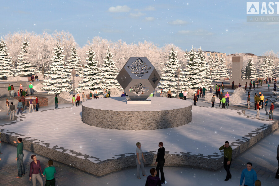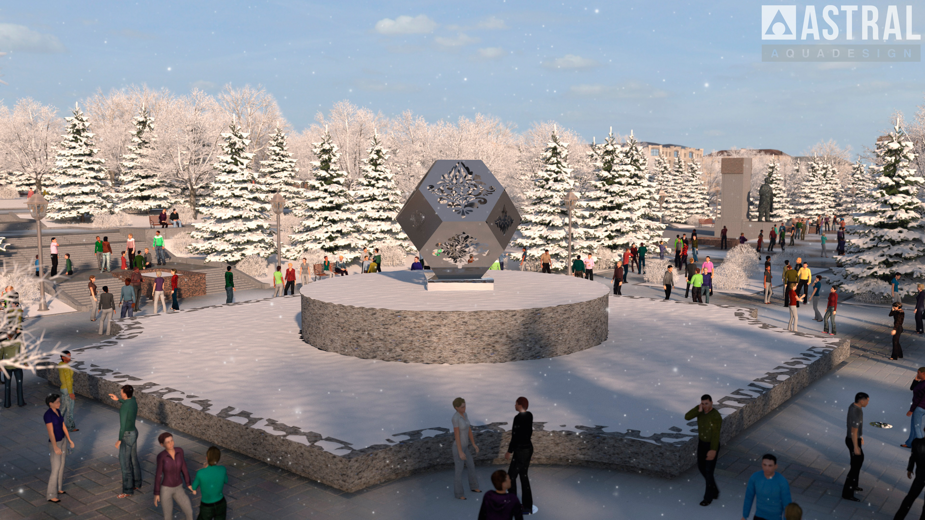 Арт-Инсталляция. Для украшения площади арт-инсталляция устанавливается как рядом с фонтаном в летный период времени, так и на самом фонтане зимой. Объект выполнен из нержавеющей стали в виде многогранника на подиуме общей высотой около 2,5 метров со светодиодной подсветкой. Благодаря изображениям на всех гранях скульптуры получаем как эффект отражения на поверхности фонтана, так и эффект свечения разными цветами по периметру. По выбору заказчика можно определить рисунки для каждой грани инсталляции.