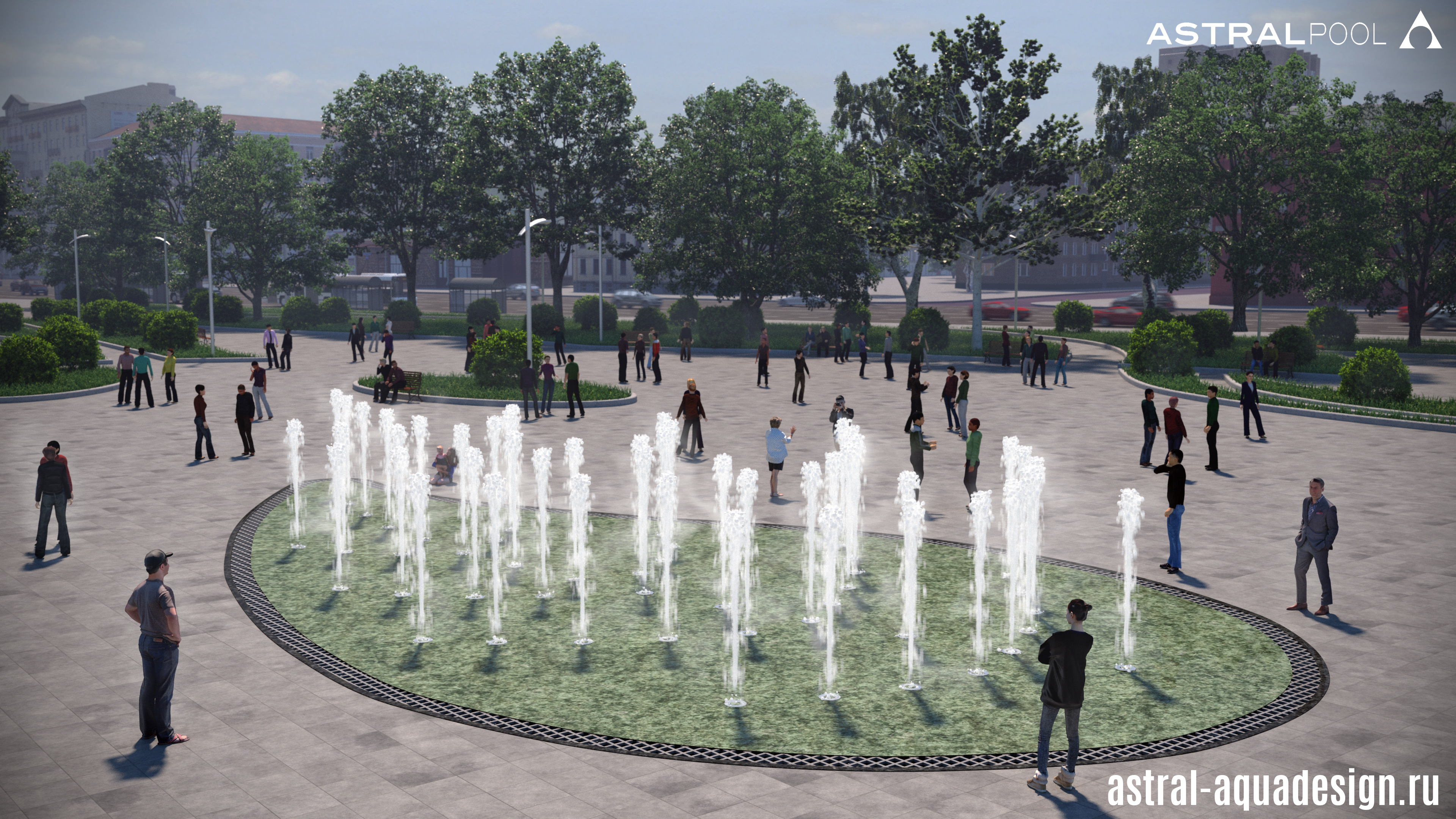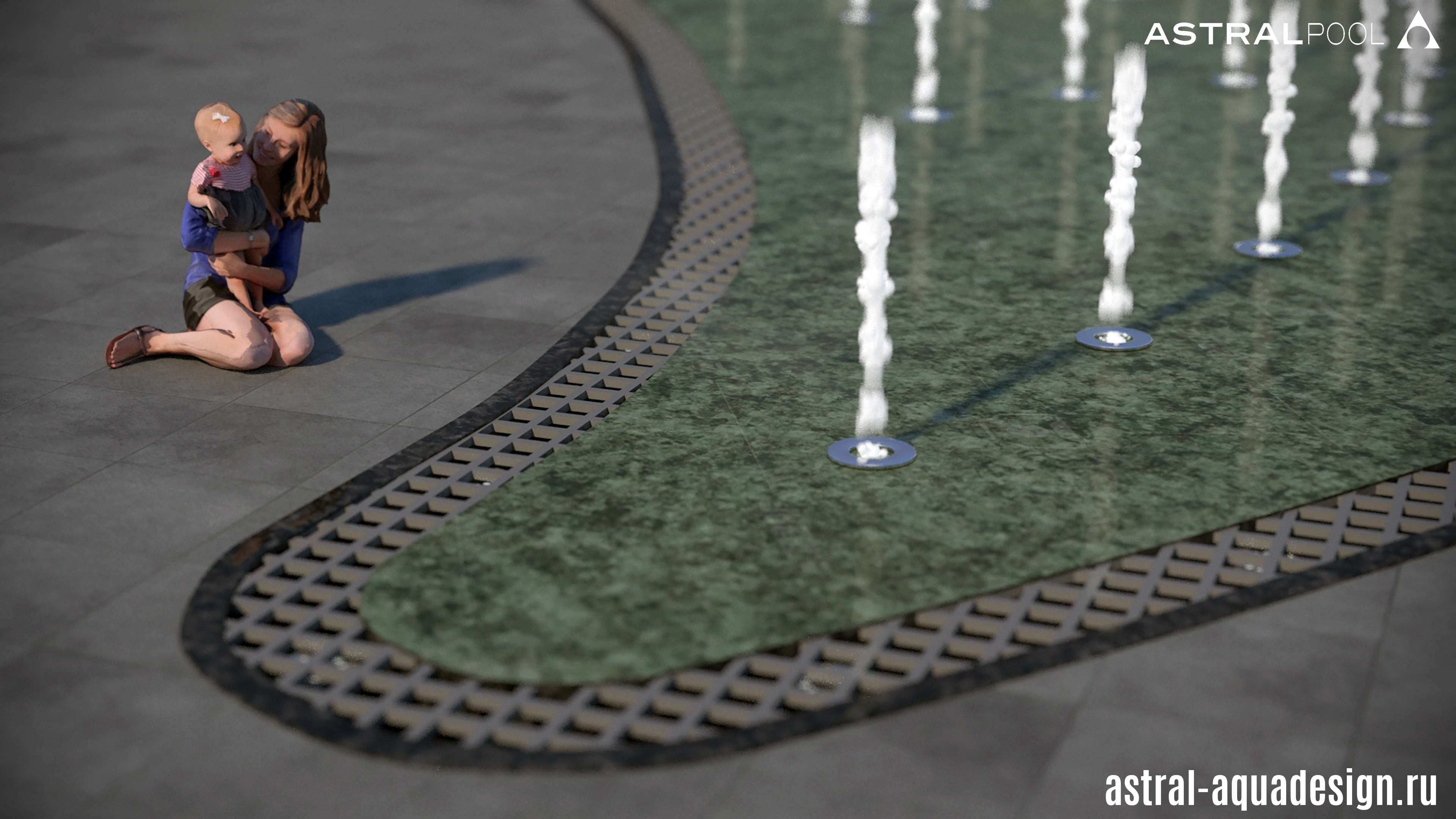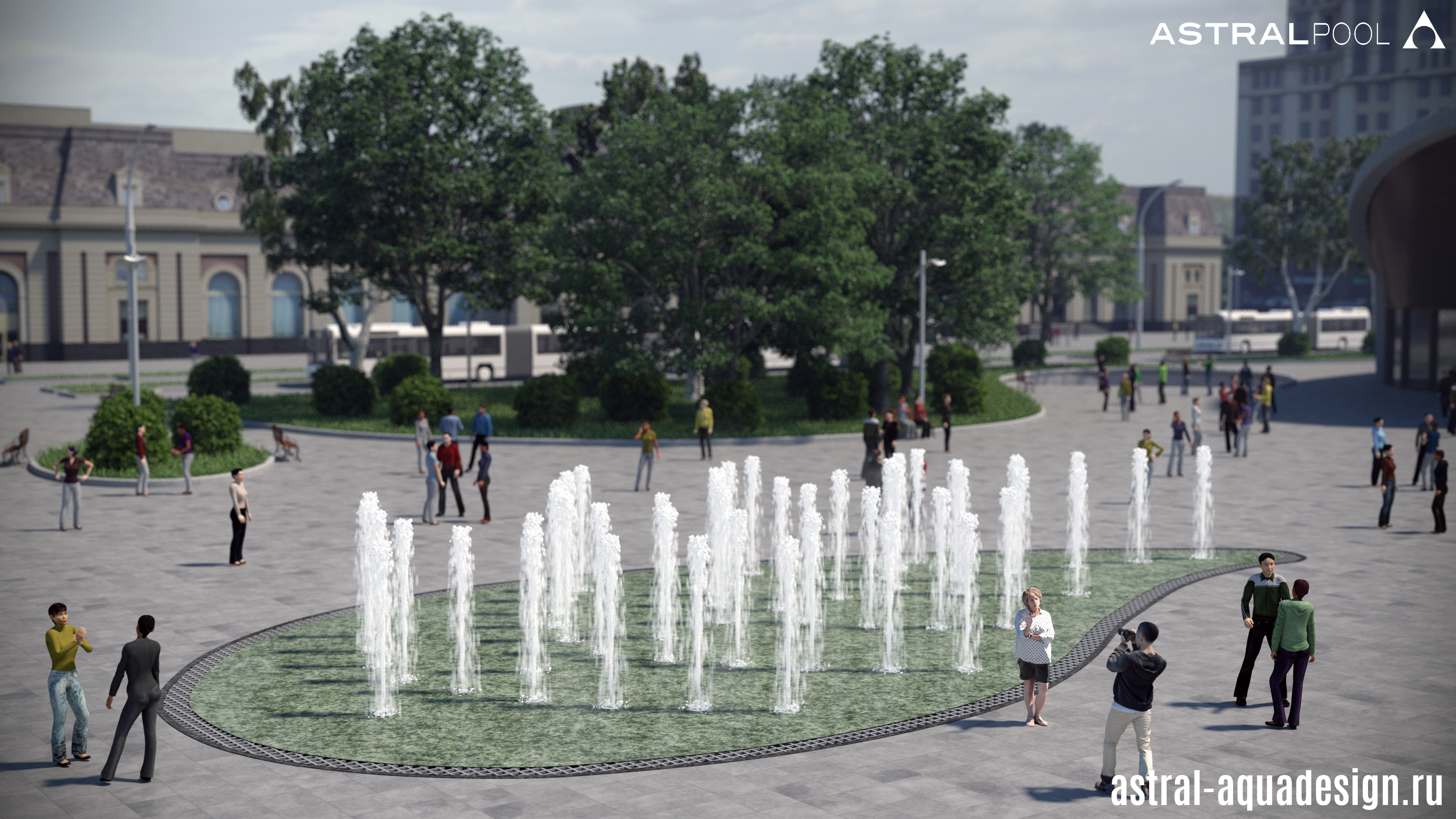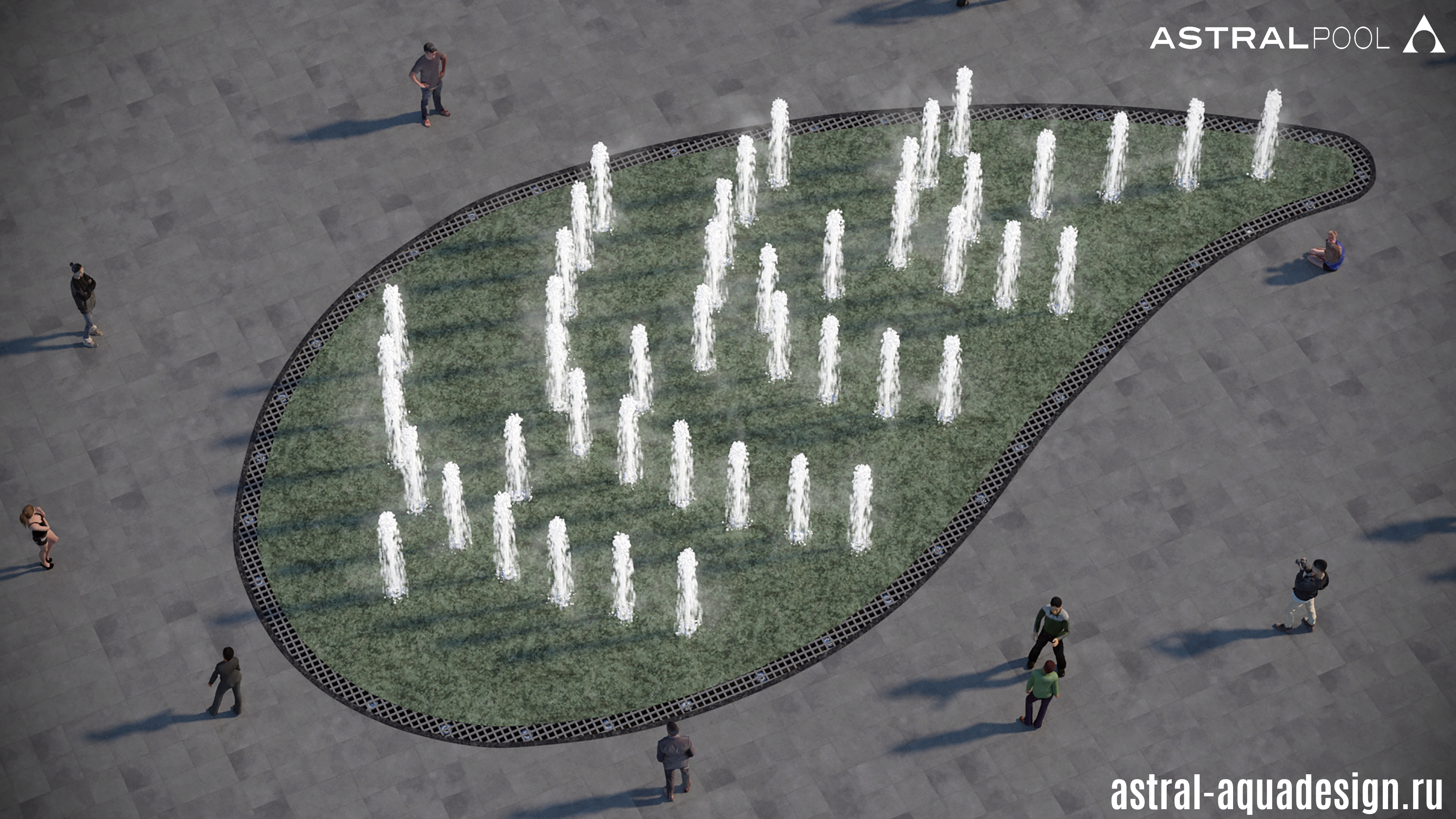 В данном проекте чаша выполнена в форме листа, а расположение струй усиливает этот визуальный эффект. Для облицовки можно выбрать любой материал: решетка, гранит и т.п Идеально подойдут любые оттенки зелёного.
