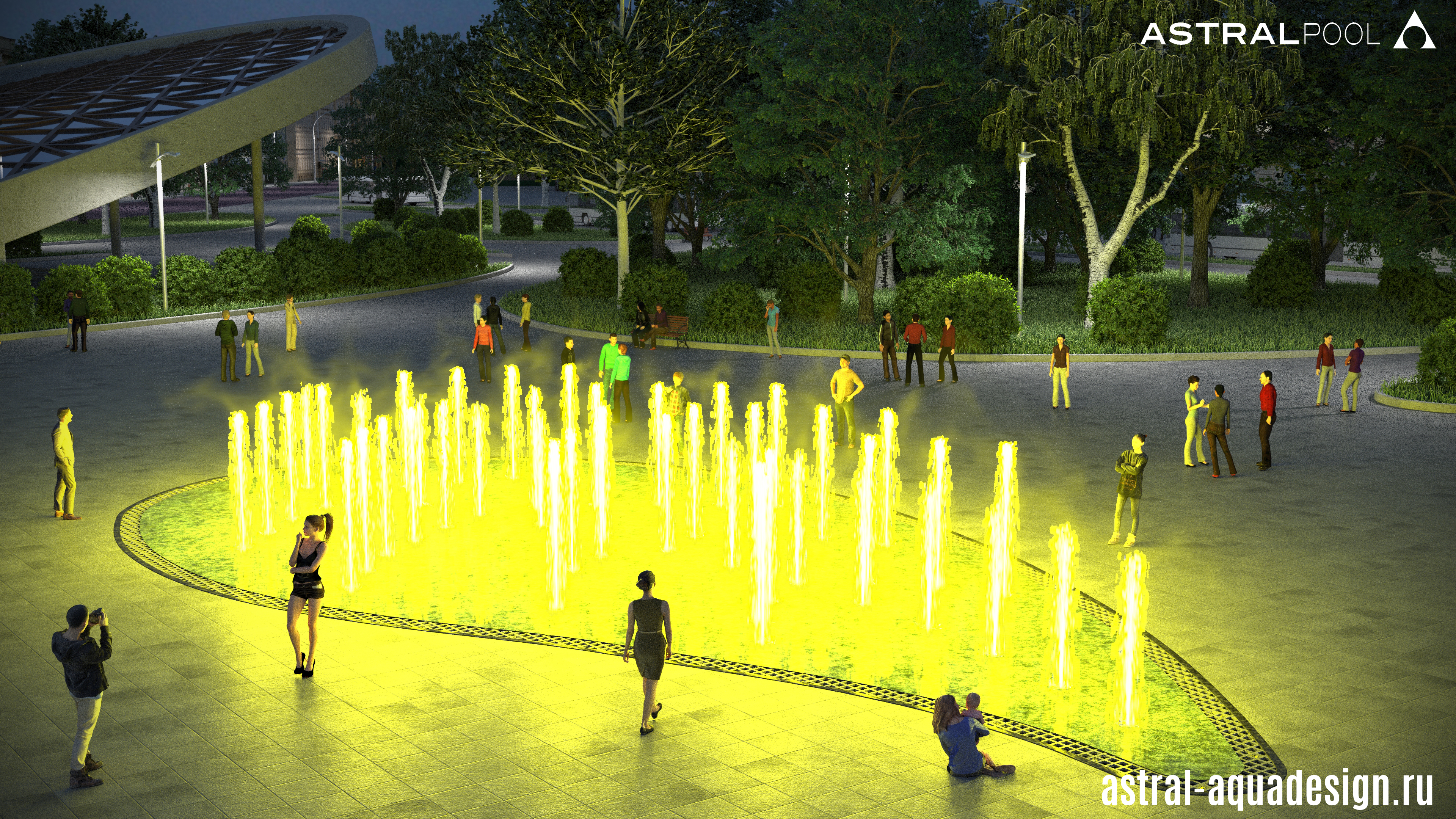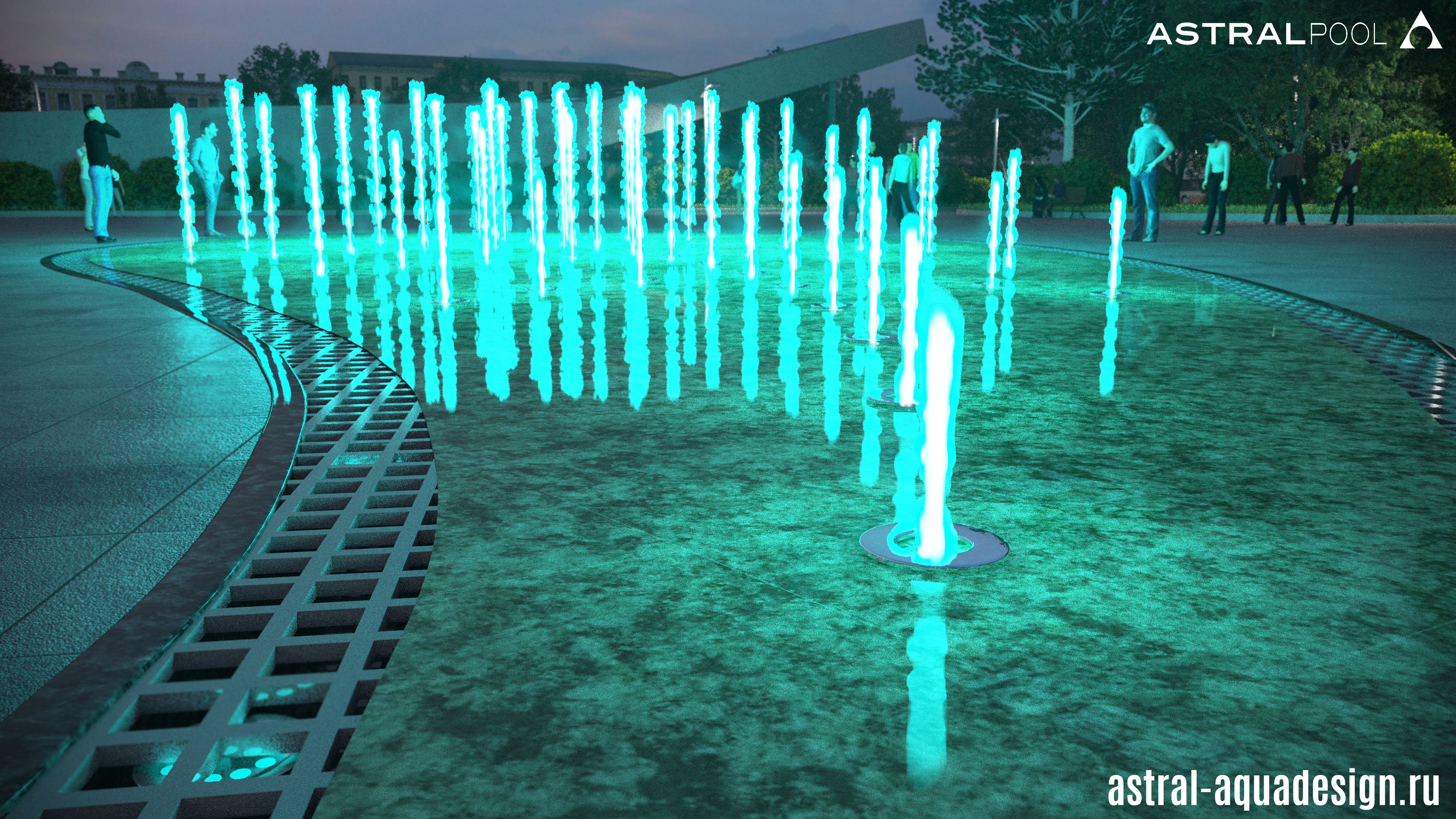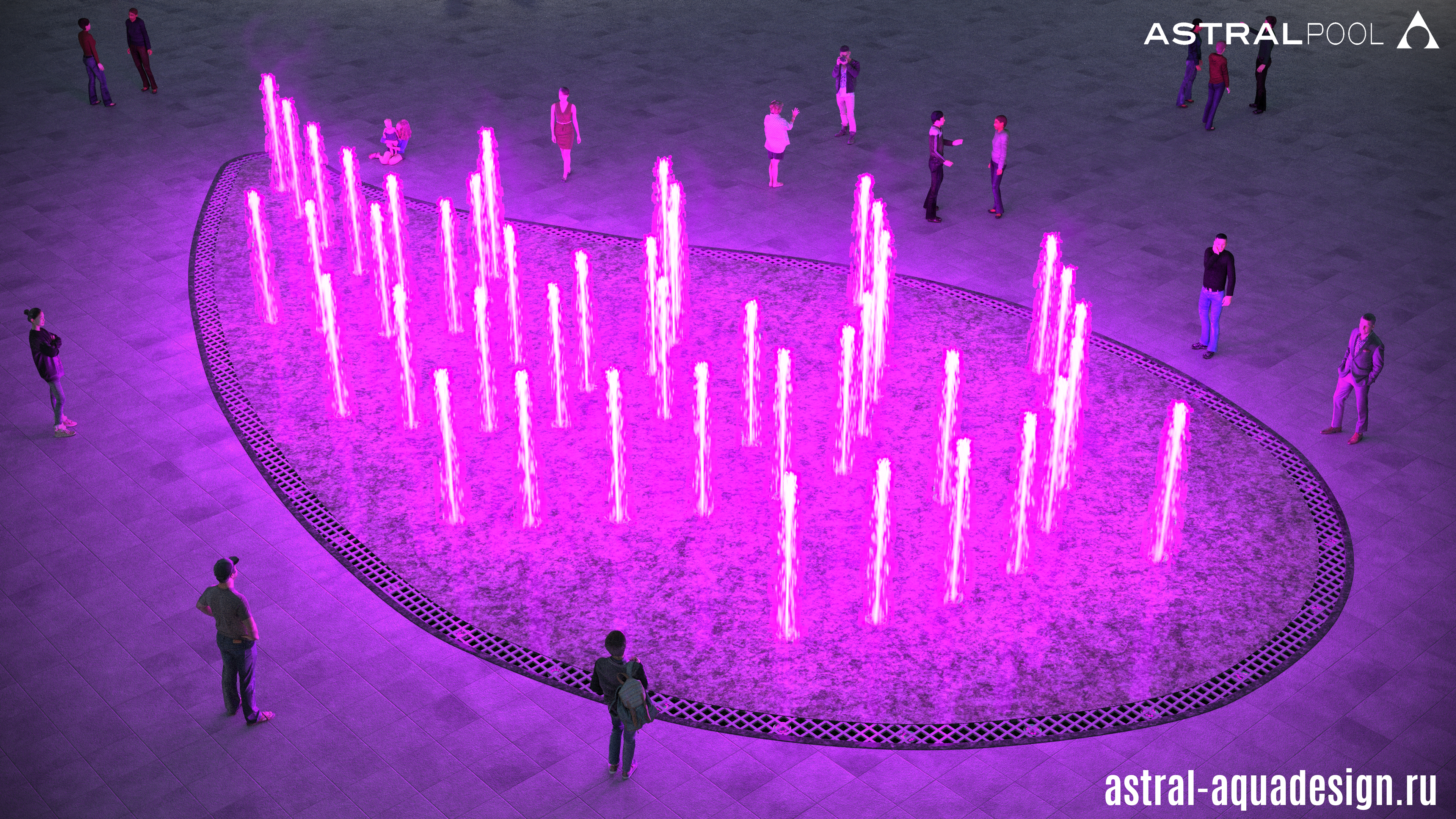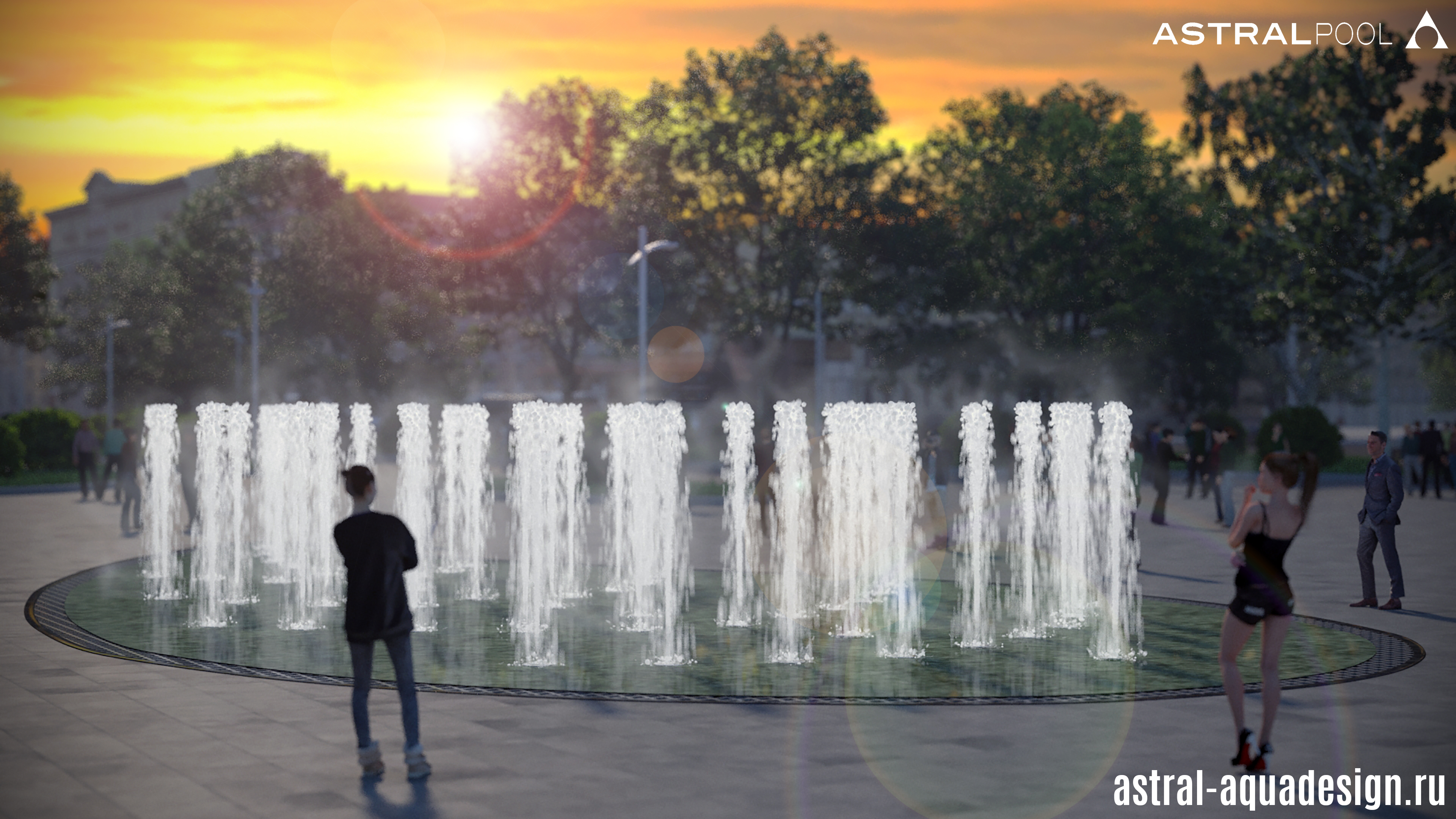 В данном проекте чаша выполнена в форме листа, а расположение струй усиливает этот визуальный эффект. Для облицовки можно выбрать любой материал: решетка, гранит и т.п Идеально подойдут любые оттенки зелёного.
