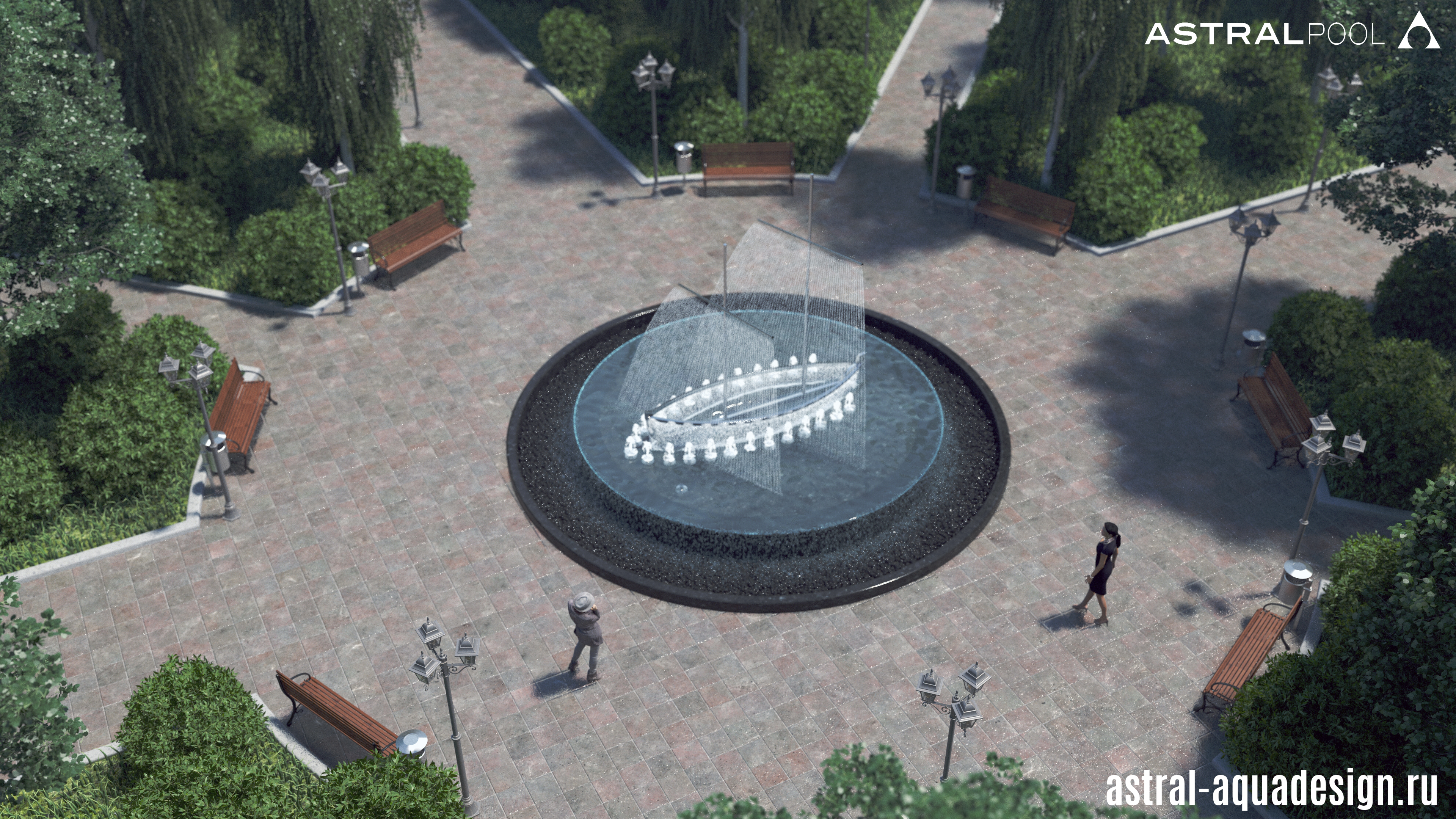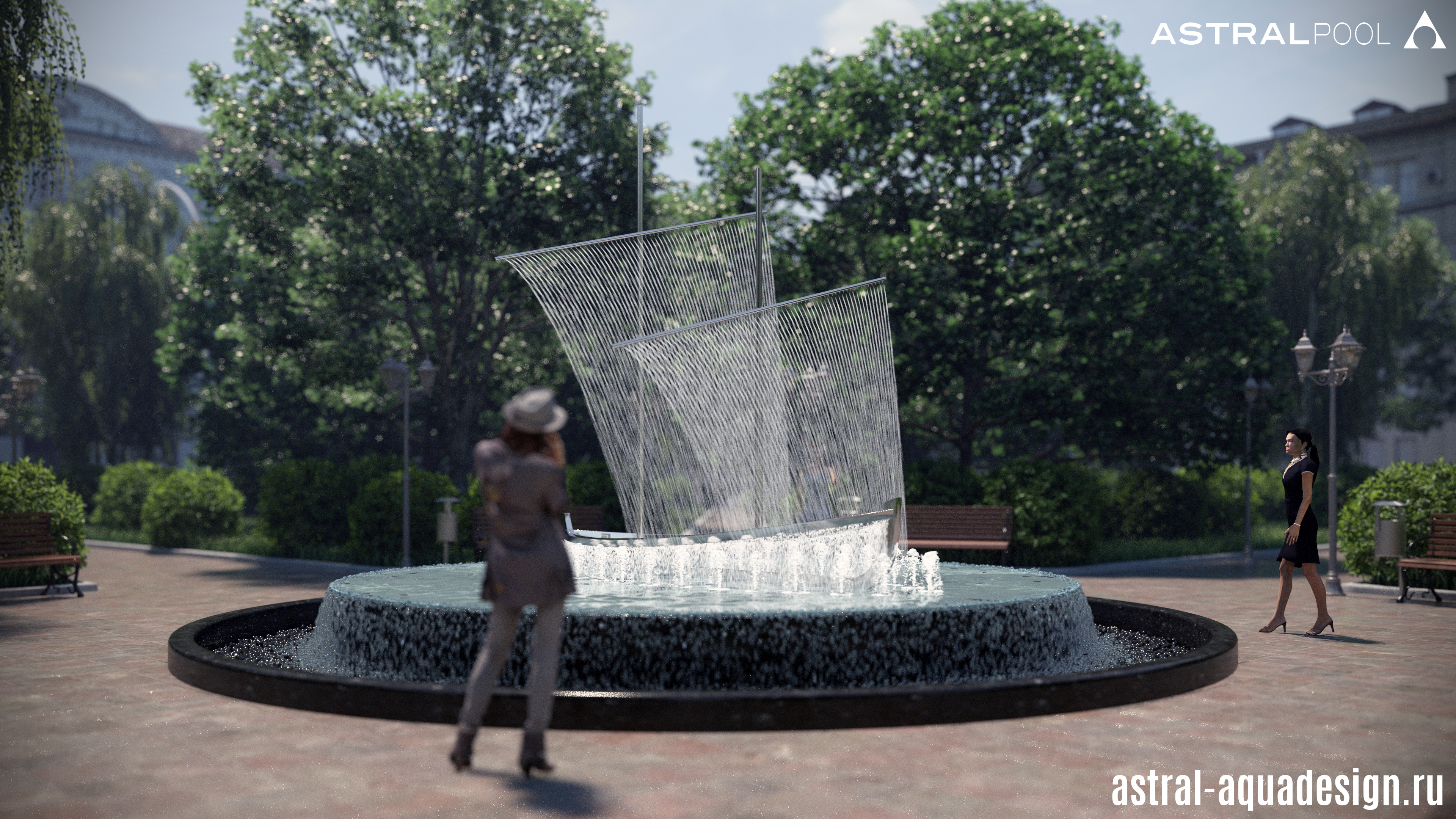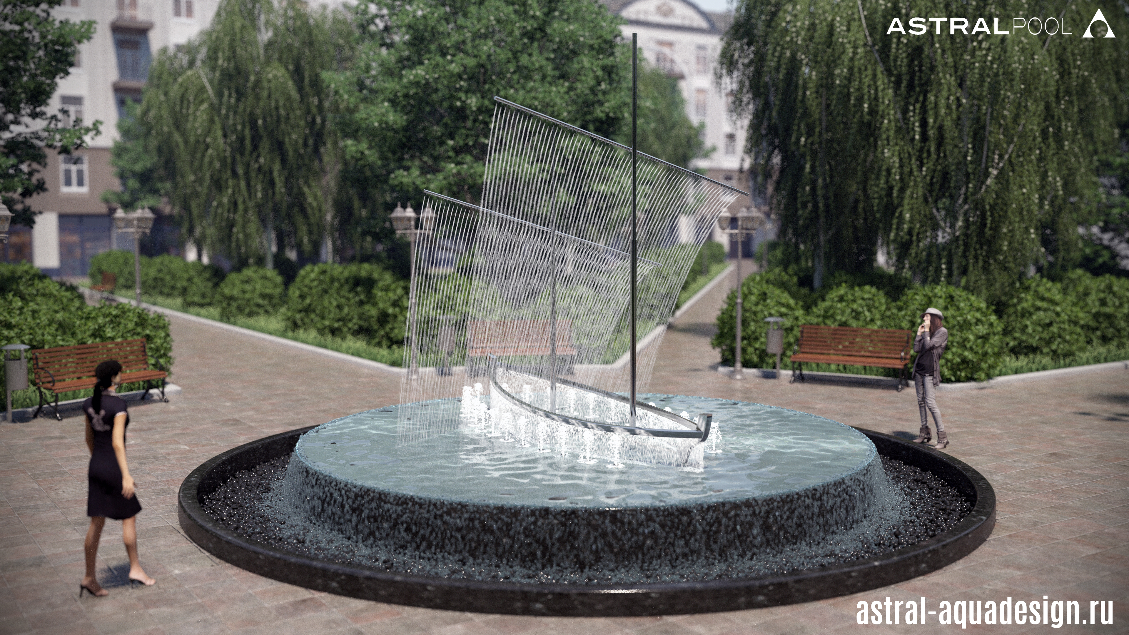 Проект необычного фонтана Лодка идеален для строительства на набережной. Струи направленные вниз создают очертание корпуса лодки и парусов. Вечерняя подсветка раскрашивает их в миллионы оттенков, создаваемых современными LED светильниками.
