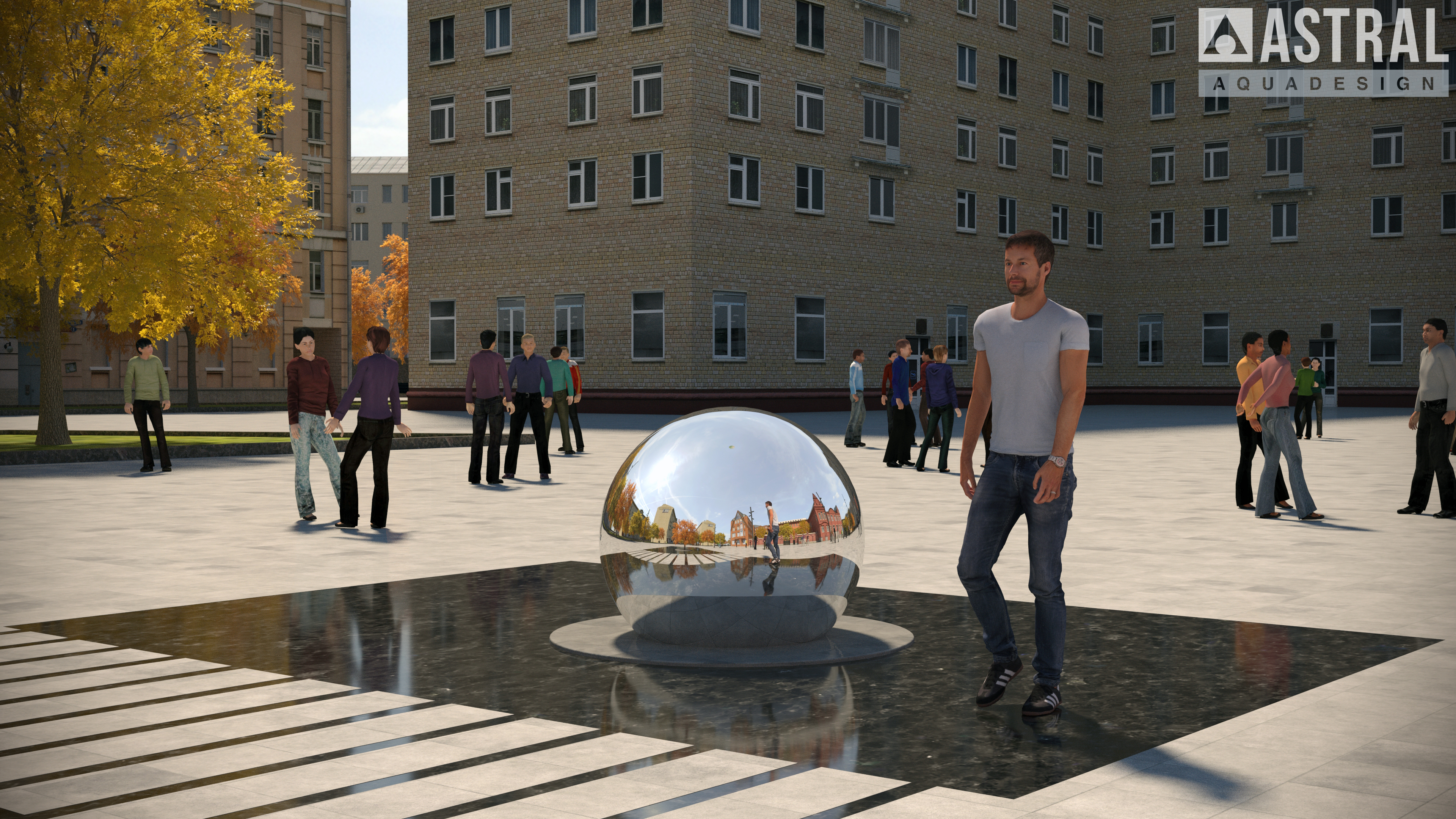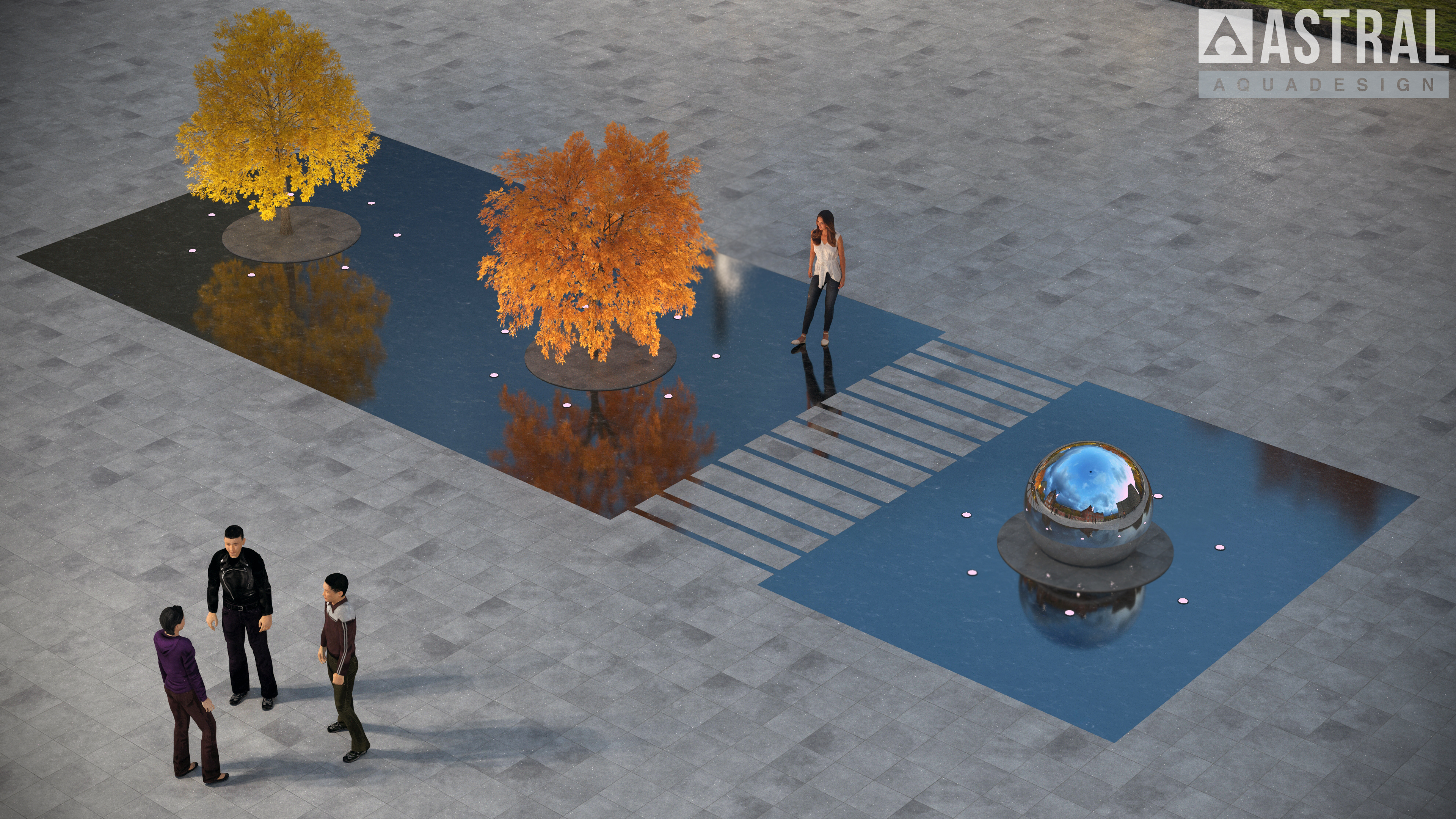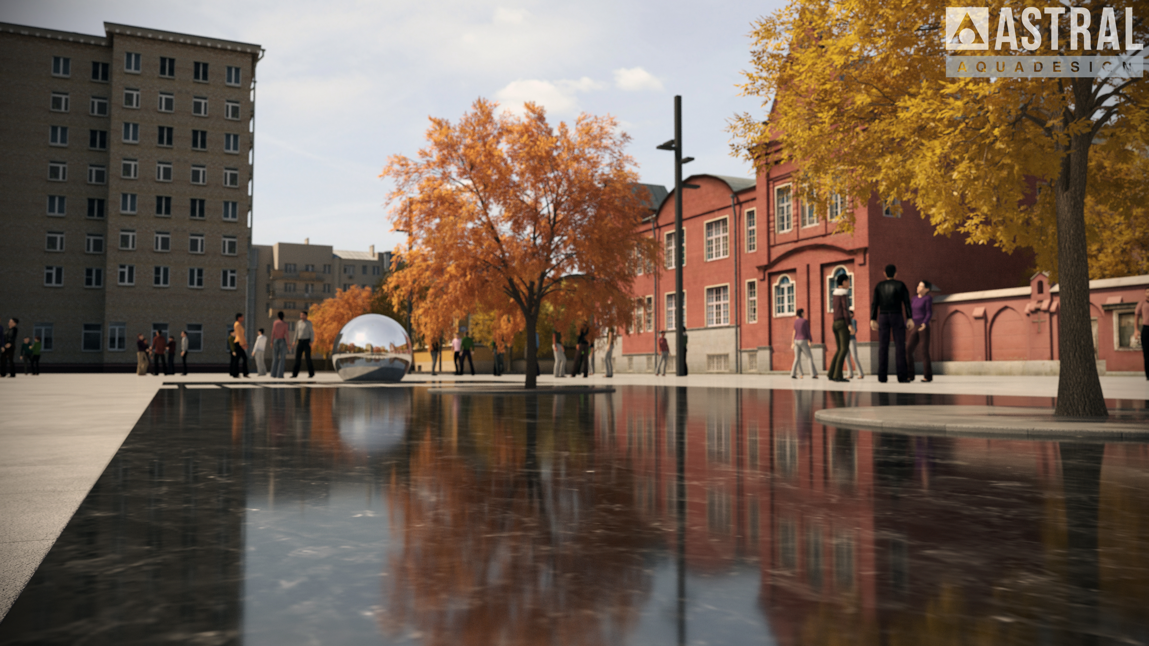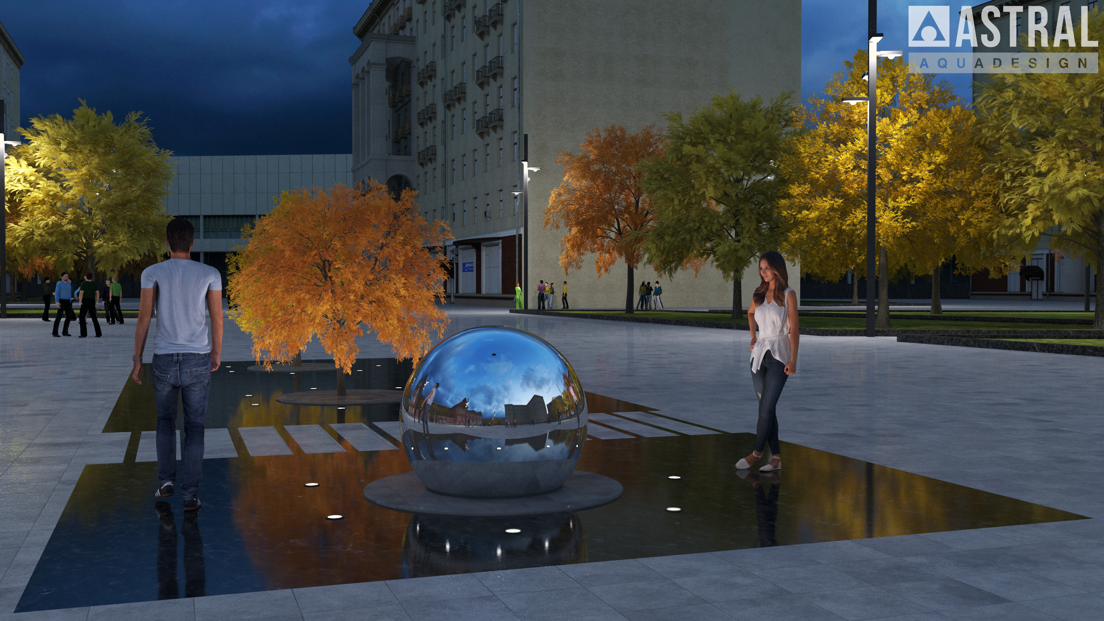 Проект отражающего водоема с гранитной чашей, размером 17 х 6 метров разработали наши специалисты для строительства на одной из площадей Калининграда. Водоем разделен пешеходной дорожкой на две части. В одной части планируется высадка деревьев, а в другой установка скульптуры в виде шара из полированной нержавеющей стали диаметром 1 метр. Для этого проекта предусмотрено использование подсветки теплого белого цвета, идеально подходящей для скульптур и деревьев.