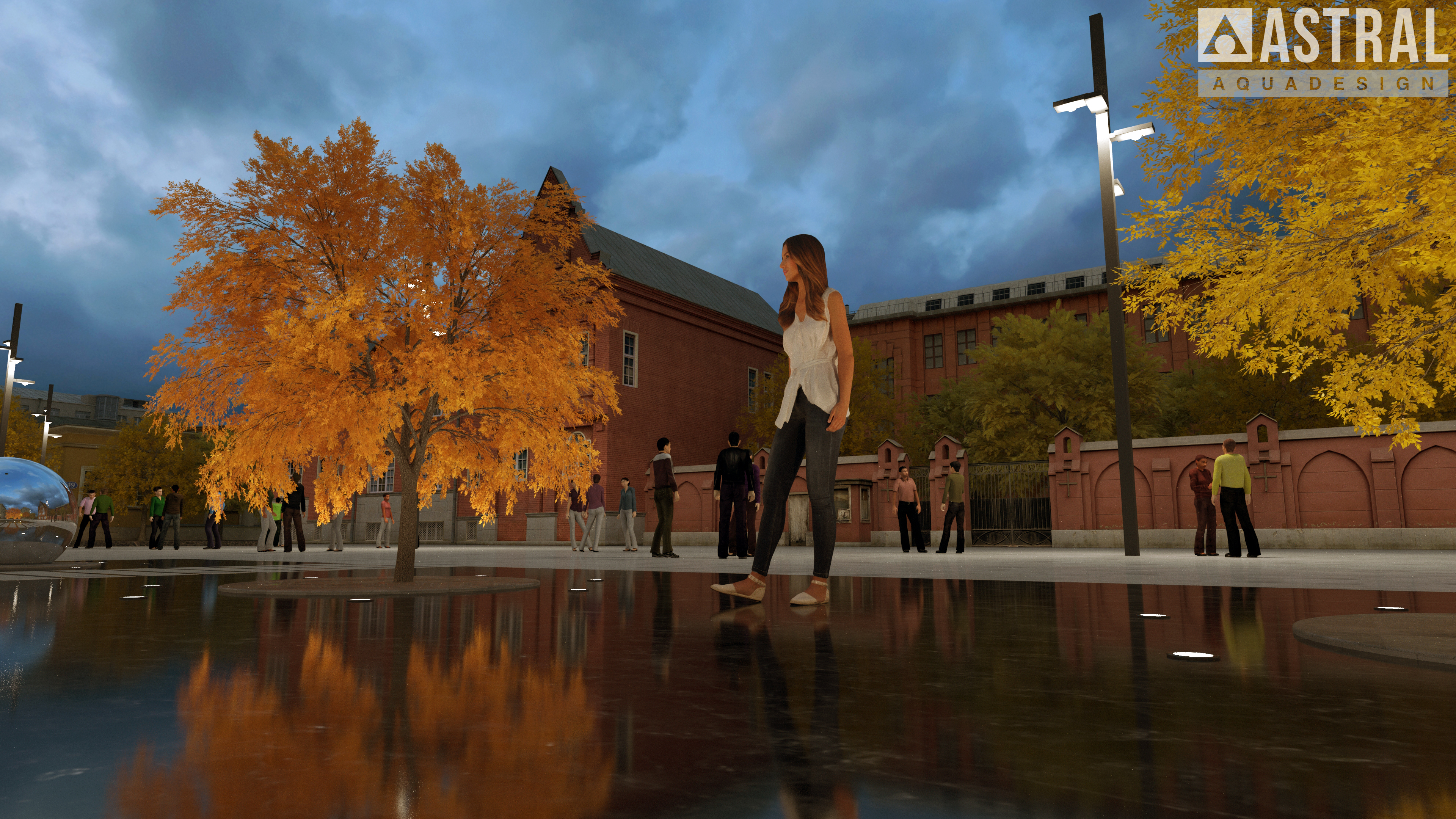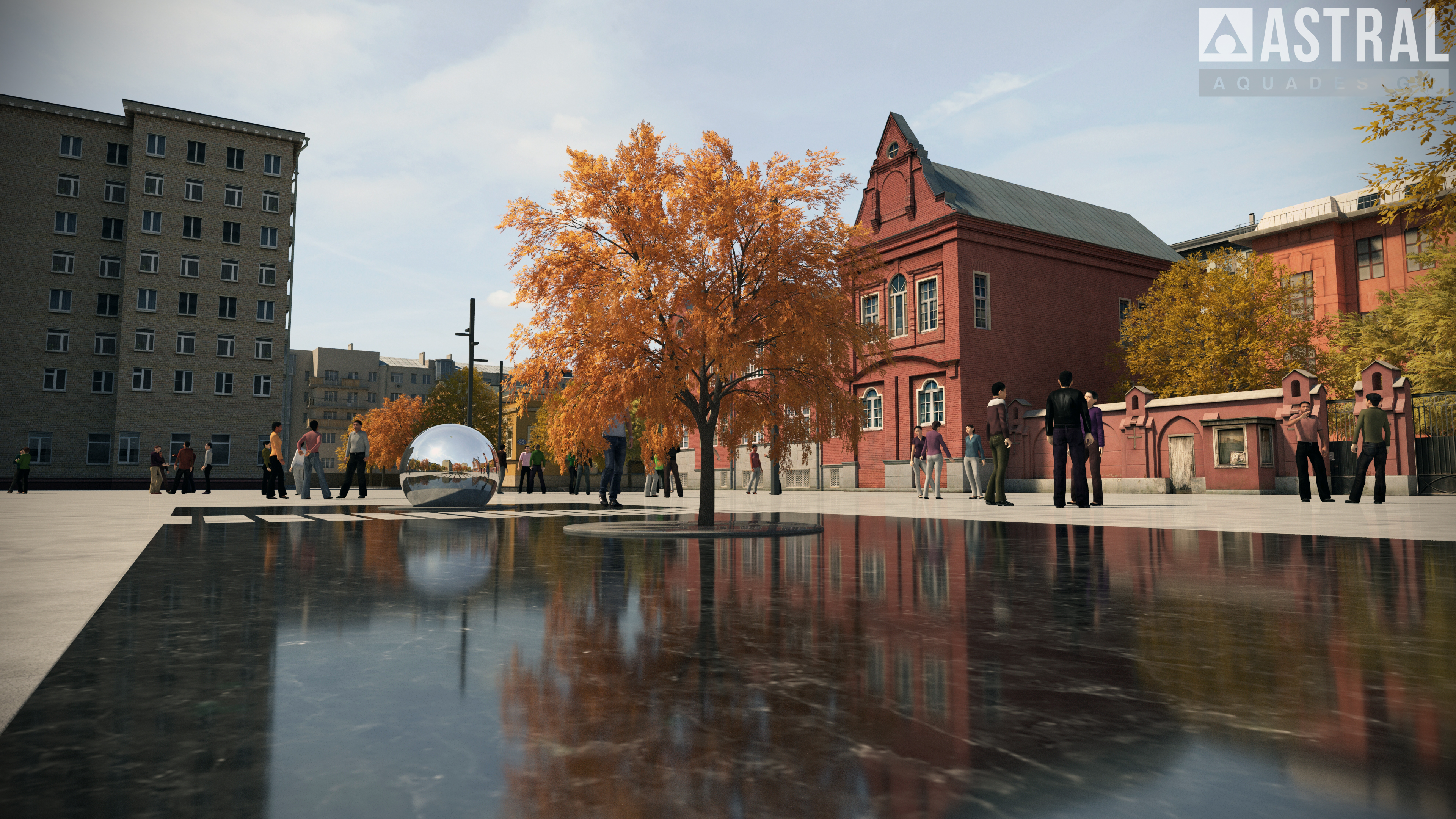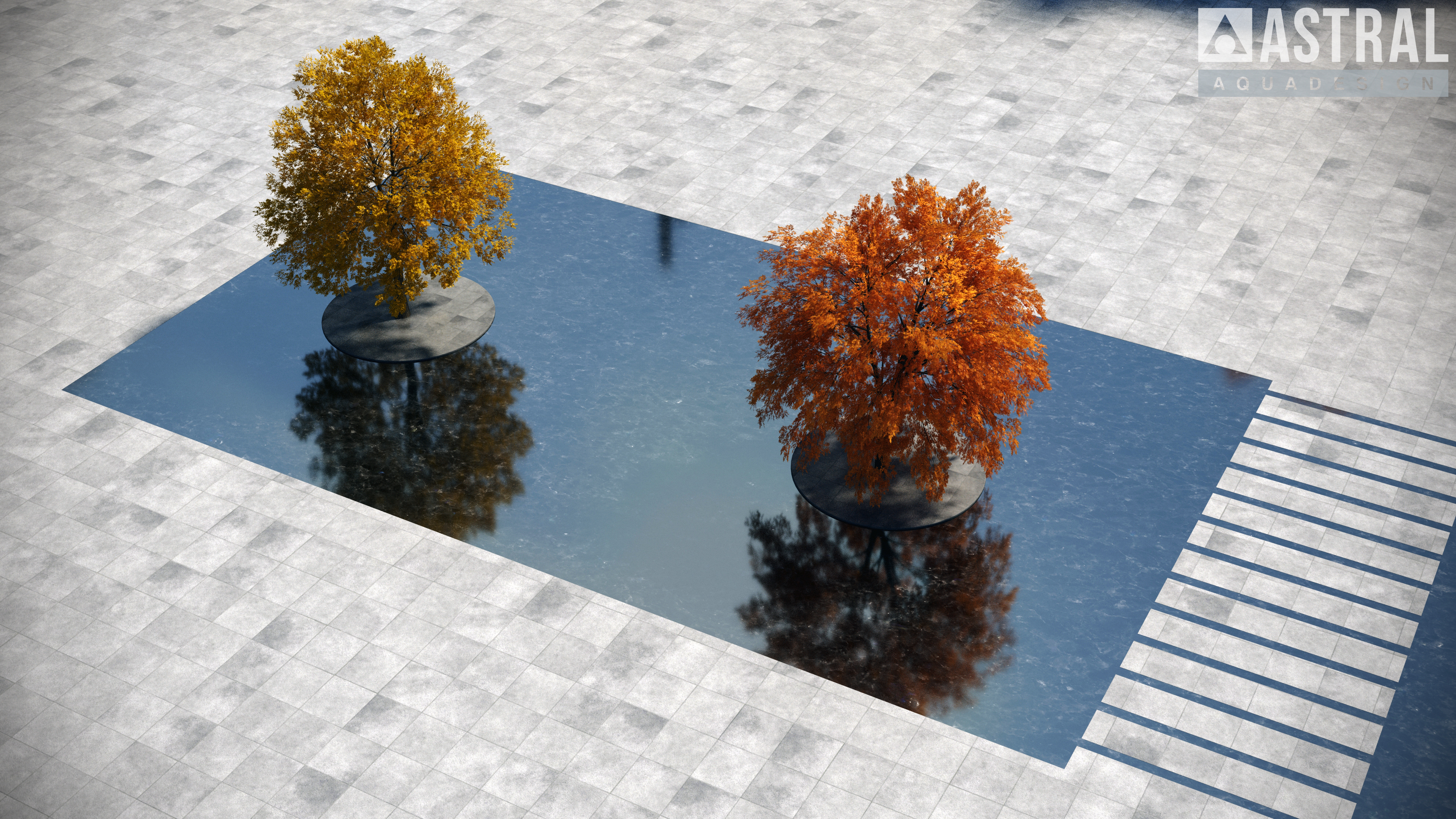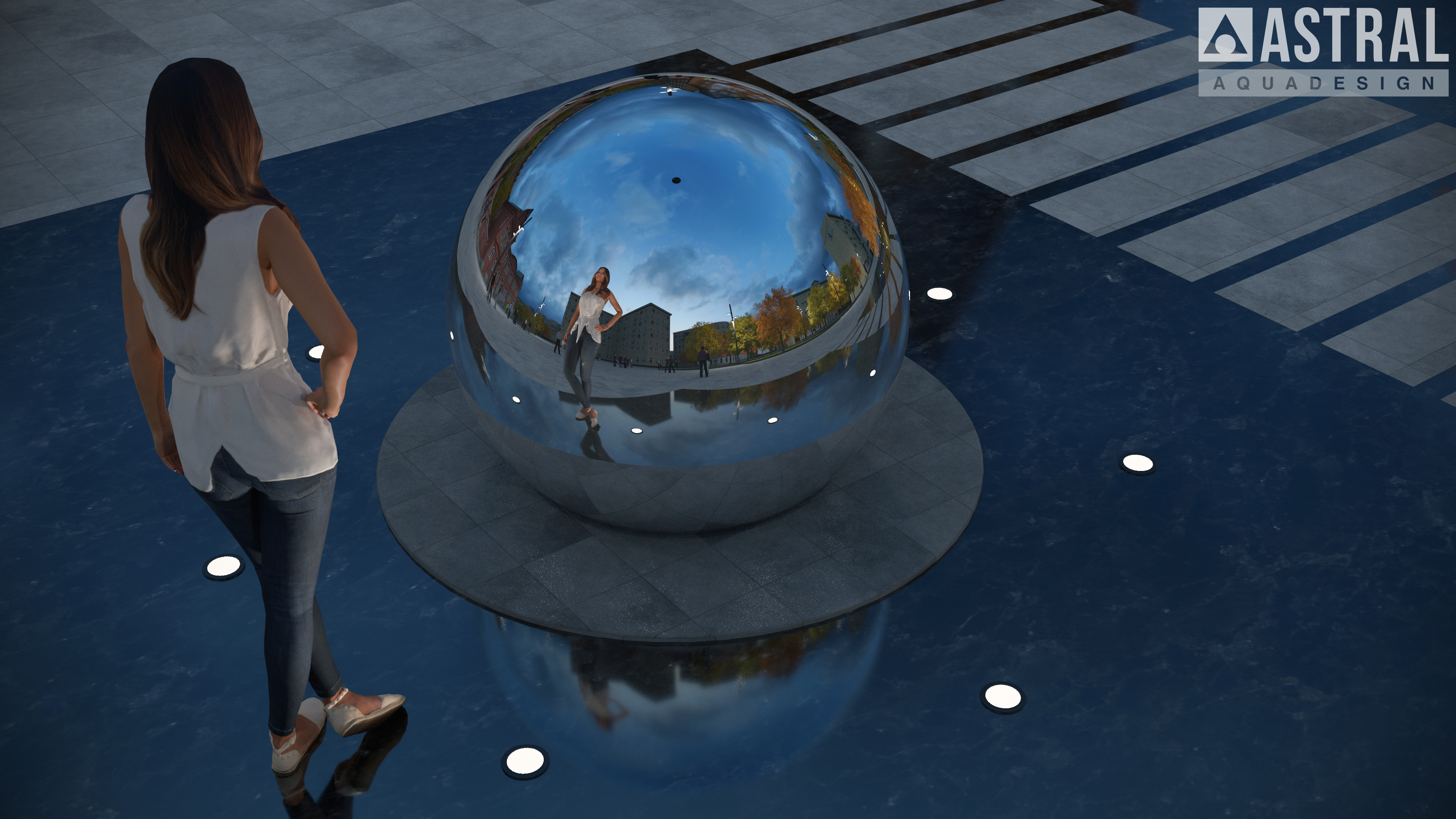 Проект отражающего водоема с гранитной чашей, размером 17 х 6 метров разработали наши специалисты для строительства на одной из площадей Калининграда. Водоем разделен пешеходной дорожкой на две части. В одной части планируется высадка деревьев, а в другой установка скульптуры в виде шара из полированной нержавеющей стали диаметром 1 метр. Для этого проекта предусмотрено использование подсветки теплого белого цвета, идеально подходящей для скульптур и деревьев.