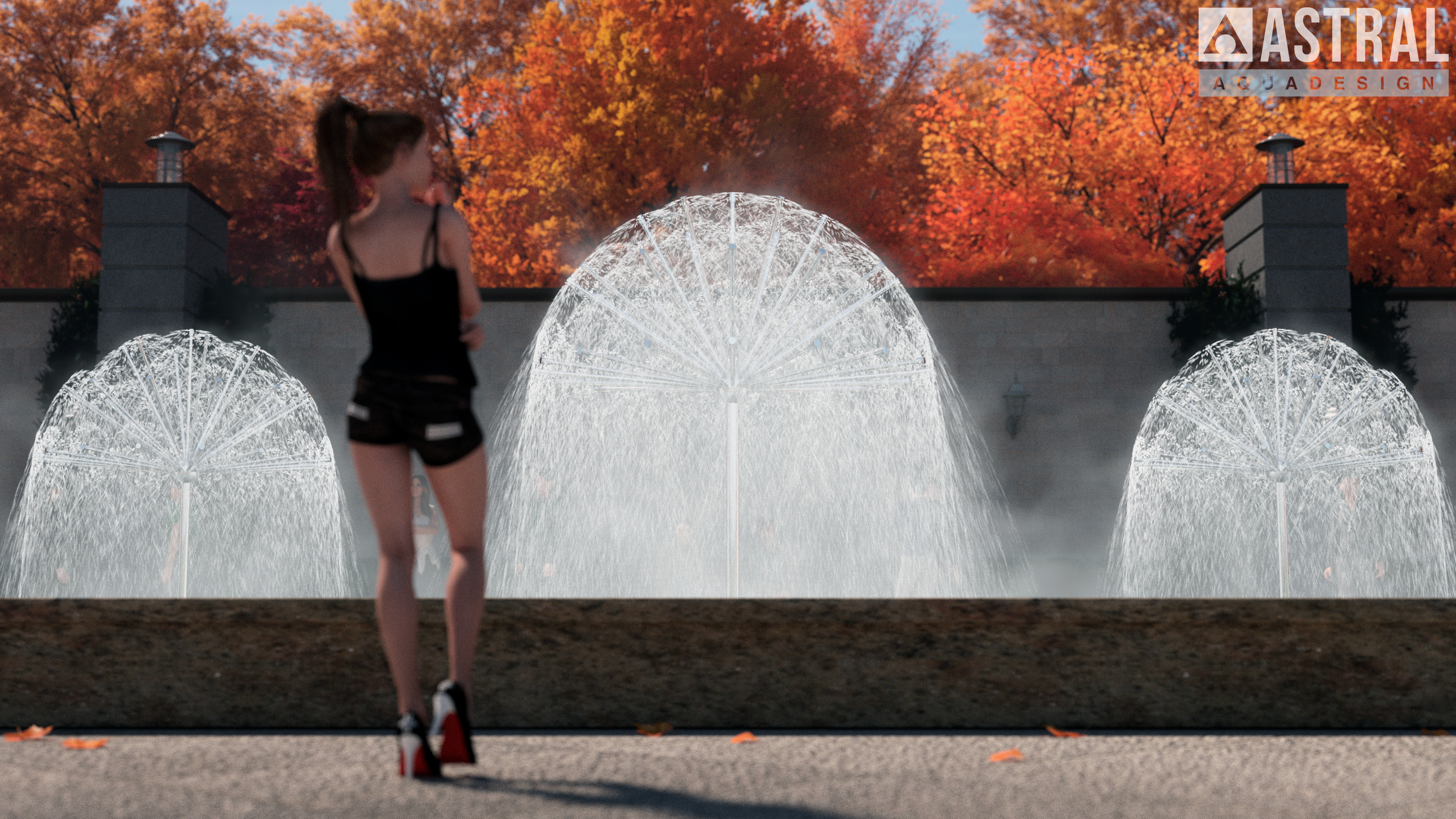 Представленный проект с несколькими фонтанными насадками разного диаметра представляет собой водяной коллектор в виде шара, в который установлены несколько, в зависимости от диаметра, сопел - лучей. Целью данной конструкции является создание большого объема распыления воды в форме полусферы. Уникальный водный рисунок впечатляюще смотрится как днем, так и вечером с подсветкой. "Одуванчики" дополнены динамическими пенными струями, что отлично подходит не только для уличных фонтанов, но и для интерьерных. Диаметр центральной полусферы 240 см, двух боковых 150 см и 120 см.
