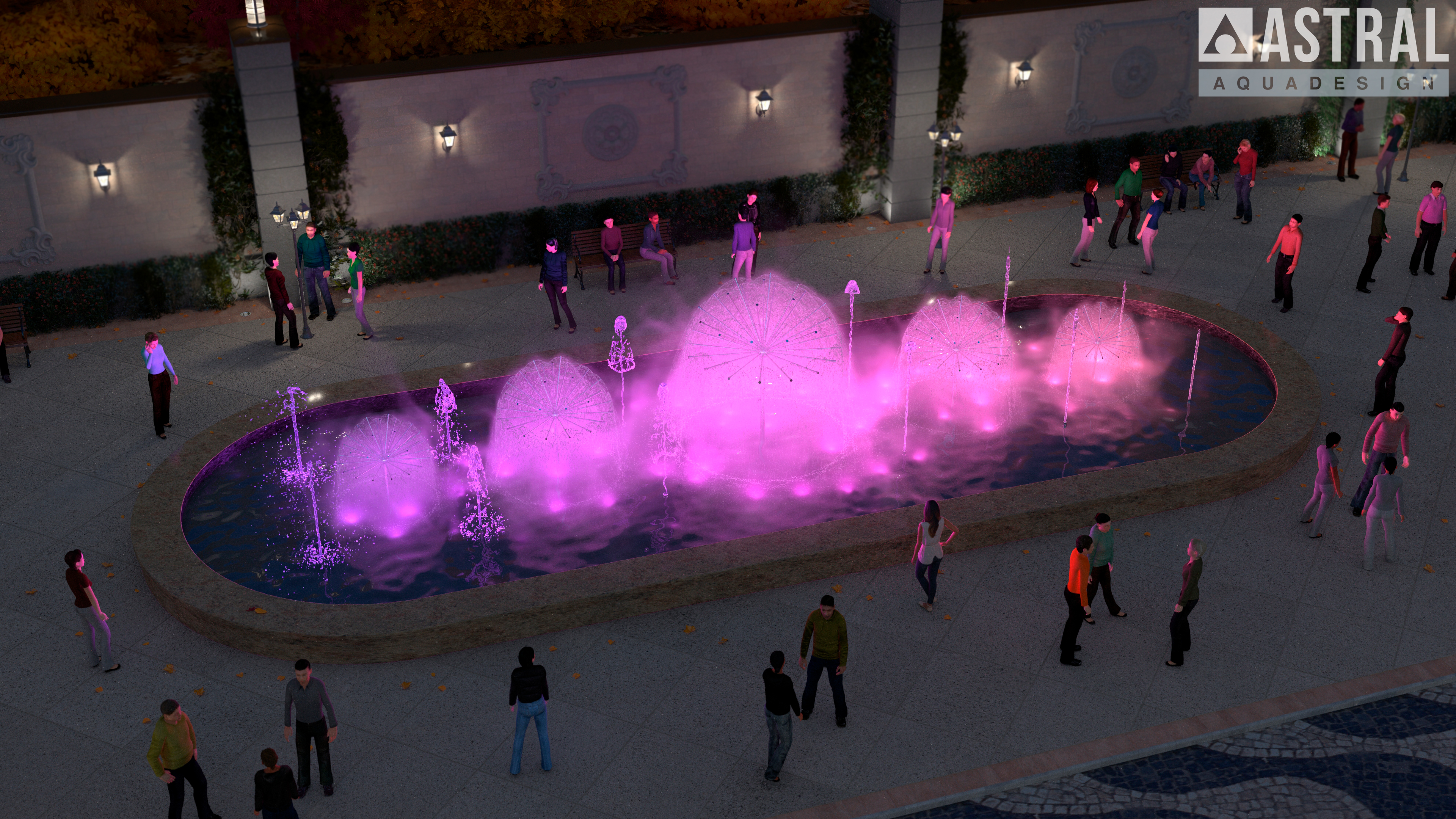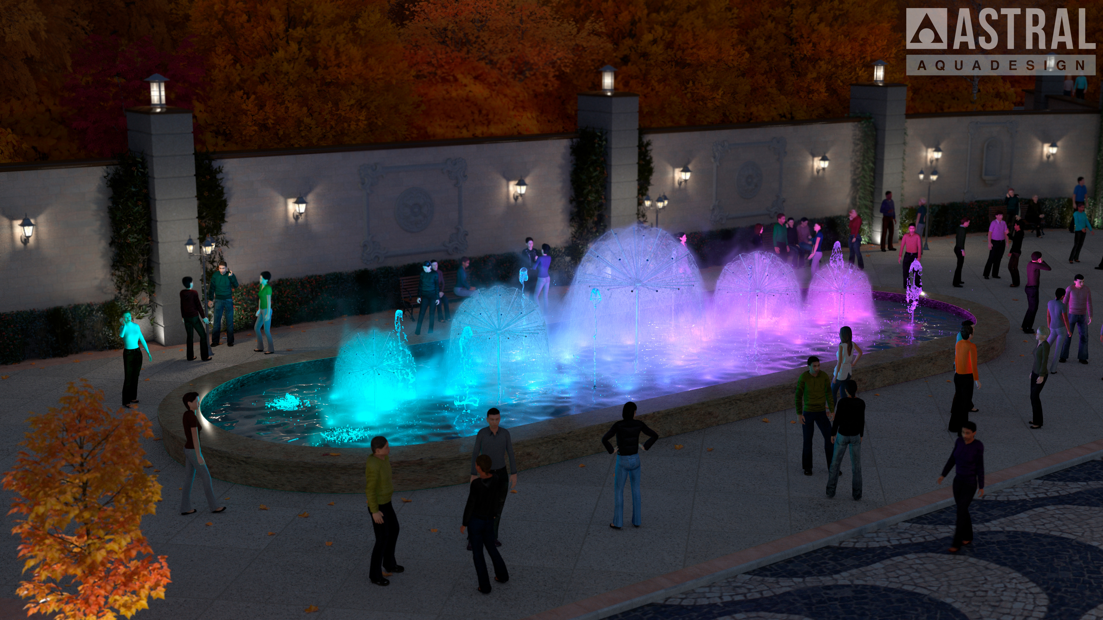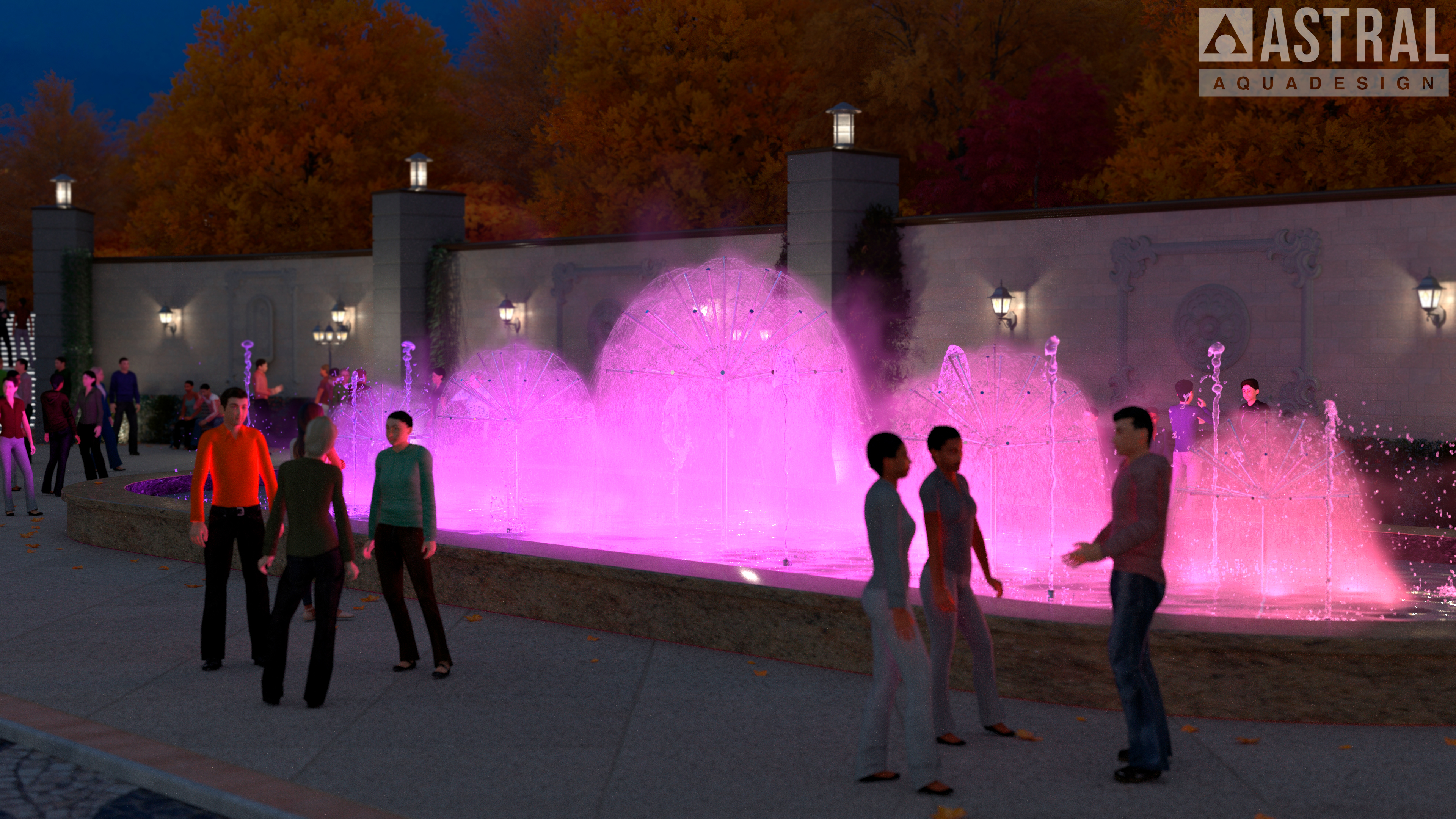 Габаритные размеры фонтана составляют 15 х 5 метров, высота пенных струй до 1,5 метров.