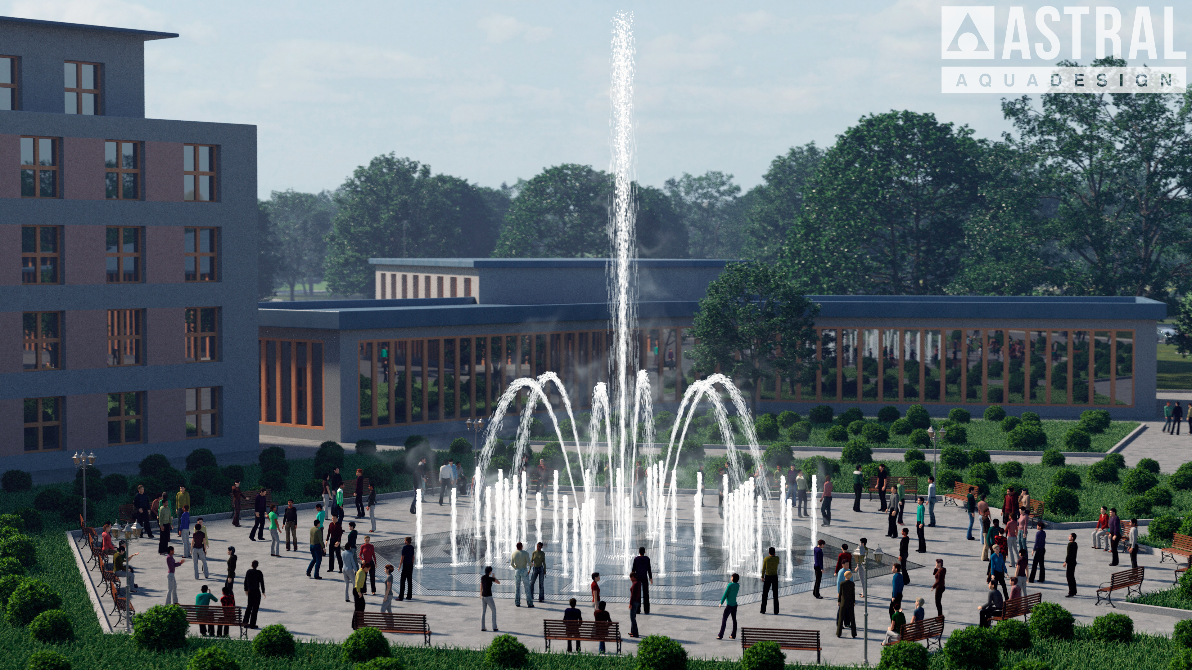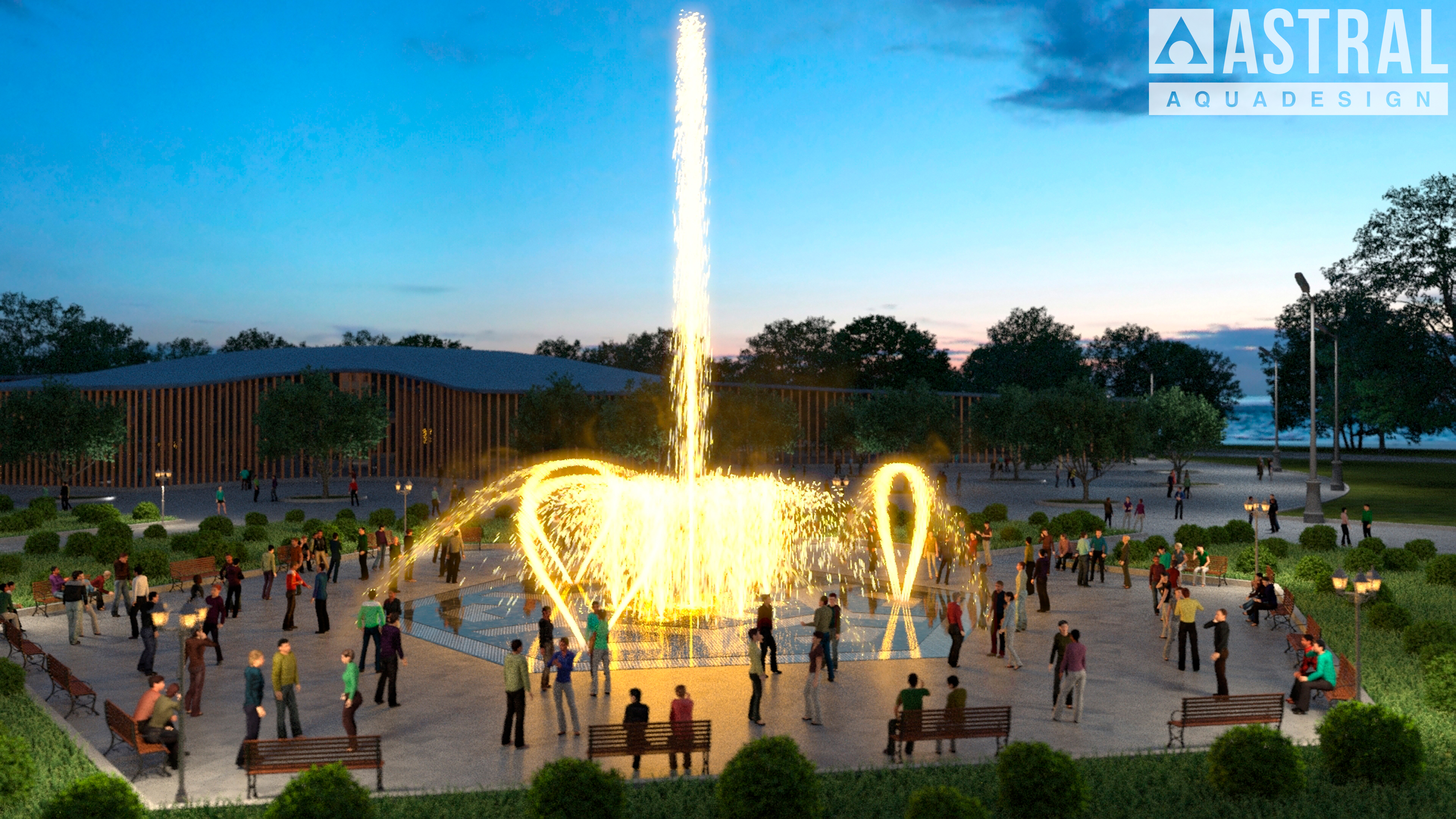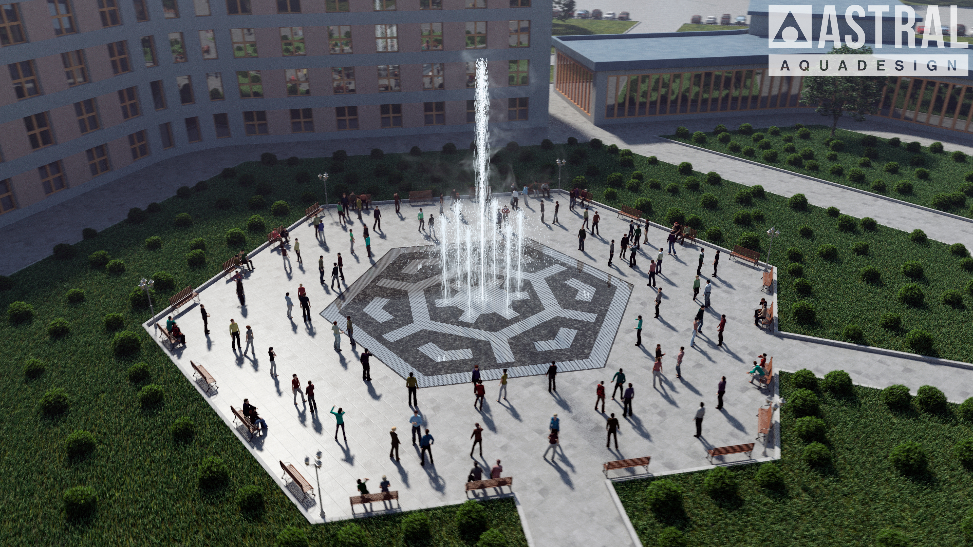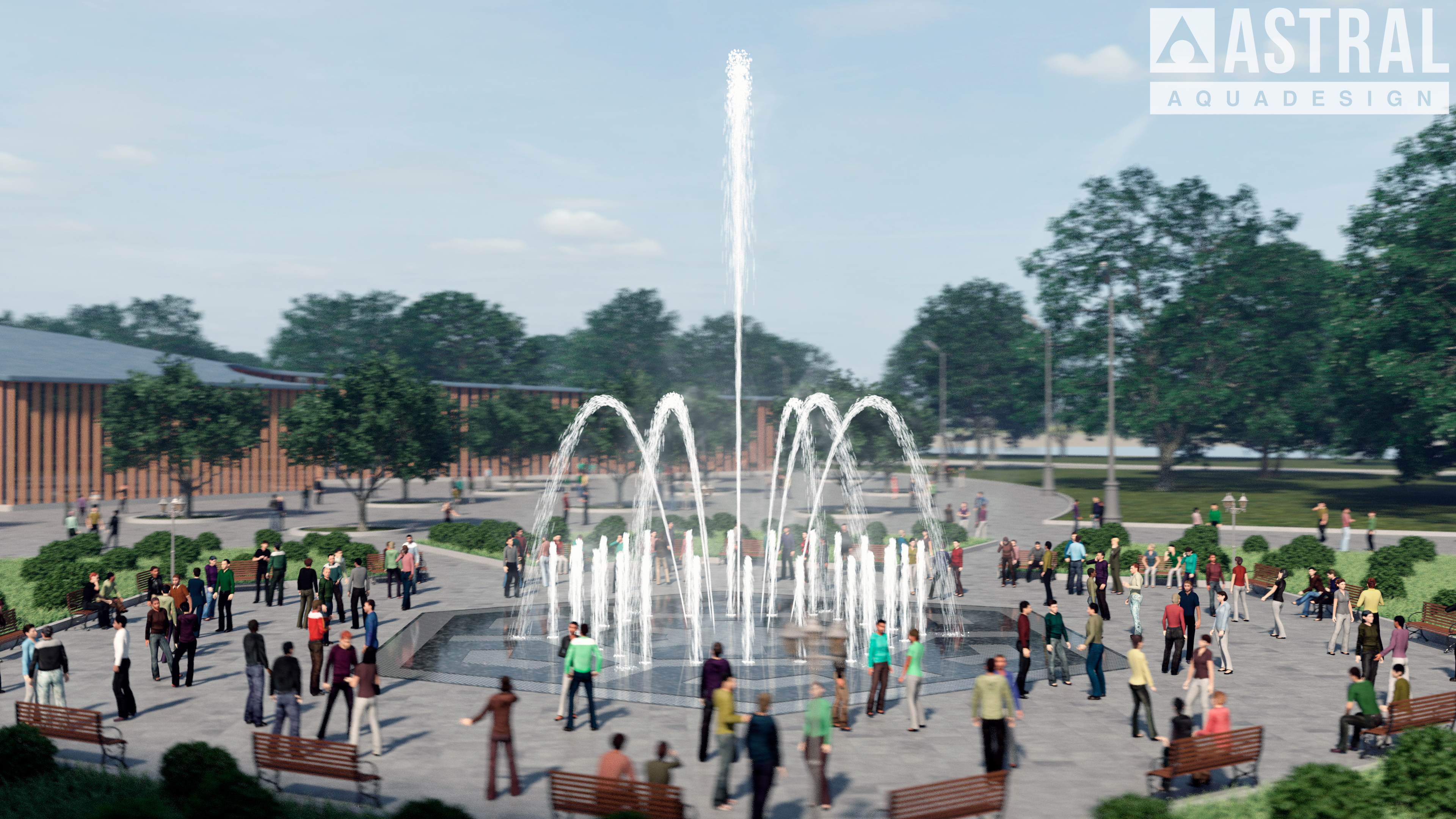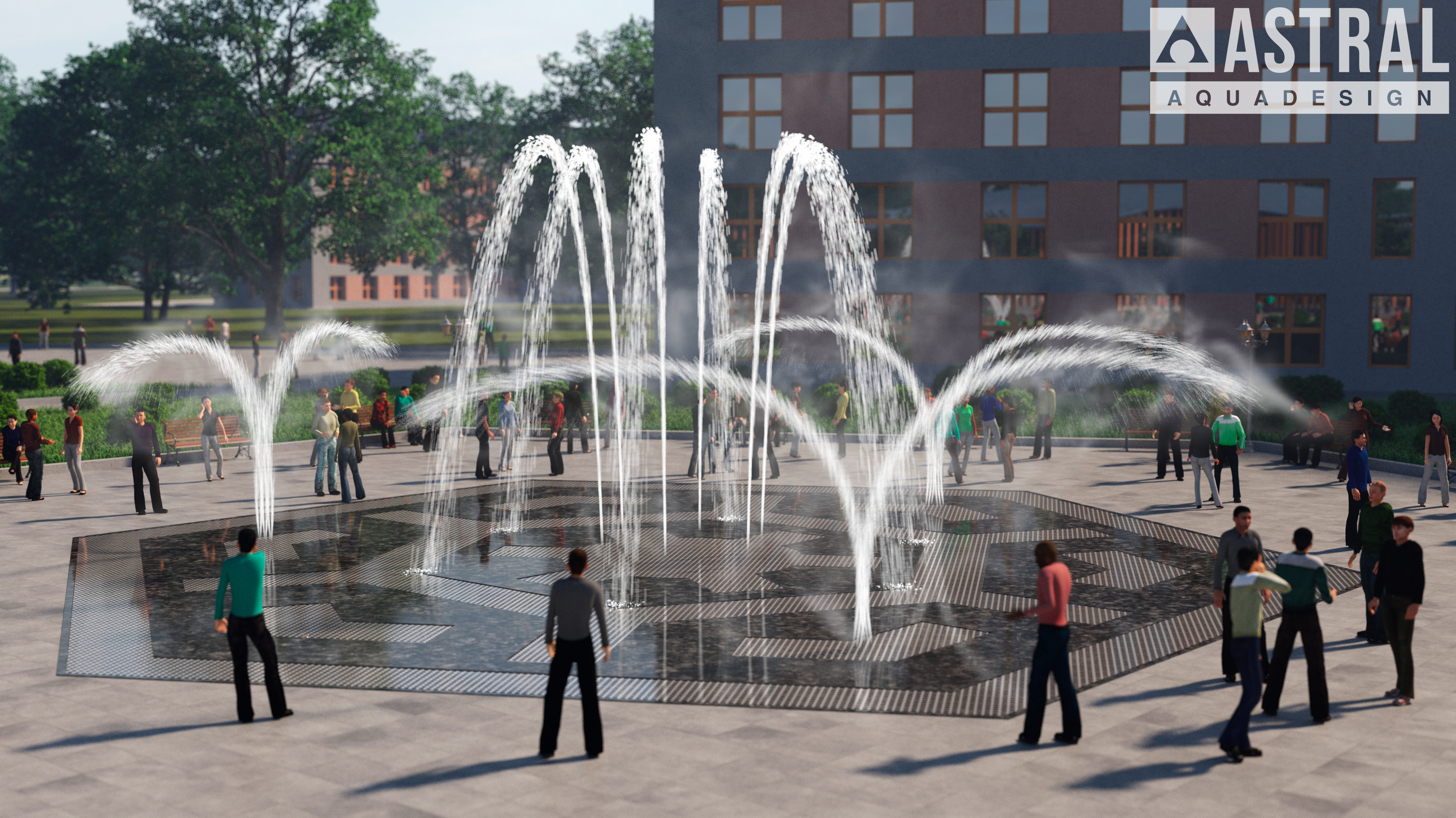 Водный объект имеет современный дизайн и оригинальную расстановку водных картин. Внешний вид фонтана сочетается с окружающим ландшафтом, создает особенный микроклимат и служит местом отдыха. Фонтан отвечает современным требованиям по безопасности, надежности и удобству эксплуатации. Конструкция чаши скрывается ниже нулевого уровня, что позволяет оптимально использовать предложенную площадь в зимнее время. Чаша сверху накрыта гранитом и оцинкованной решеткой. Решетчатый настил обеспечивающей возврат воды в фонтан, несущую способность весовой нагрузки, минимальные потери воды на разбрызгивание и унос ветром.