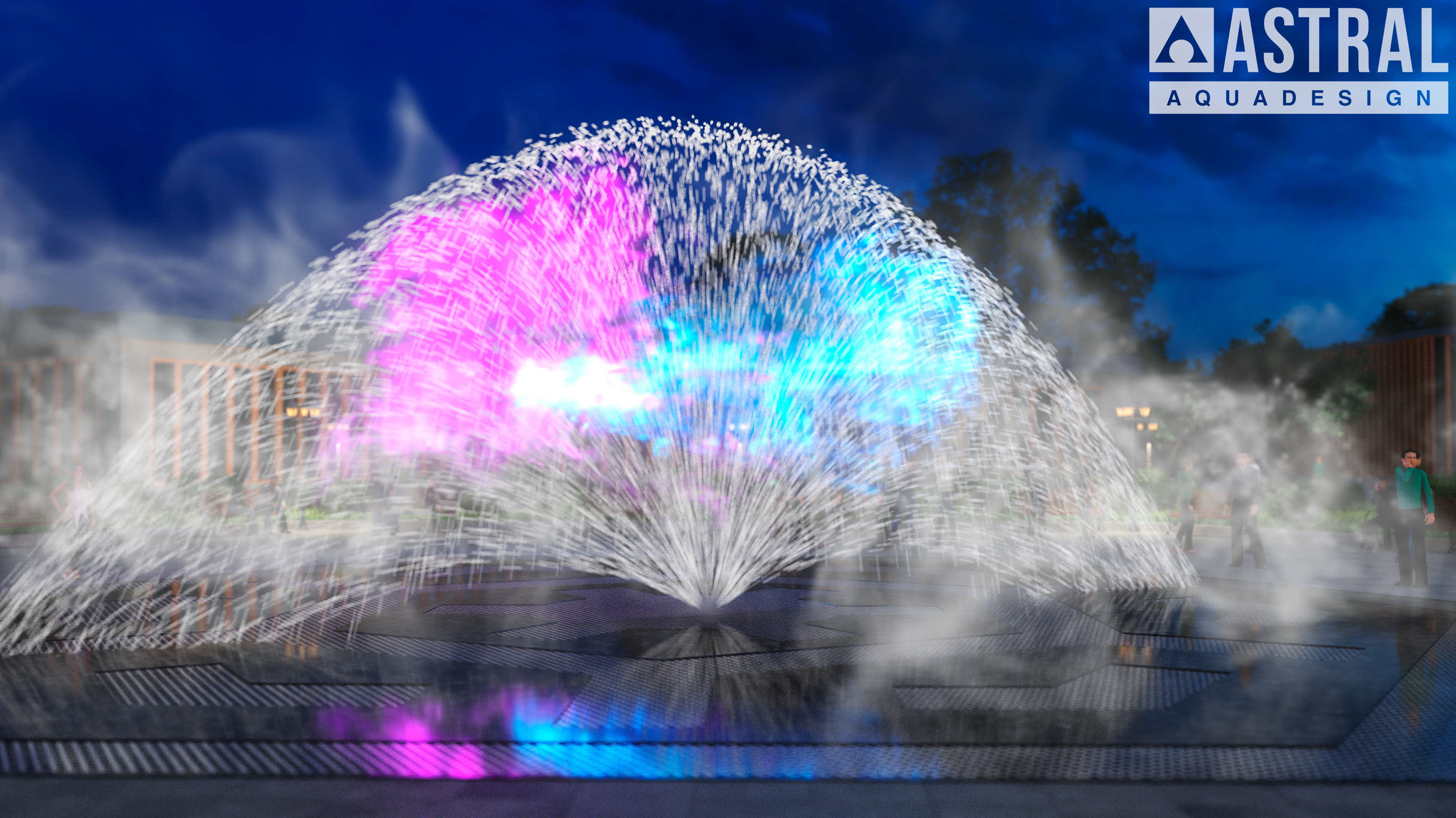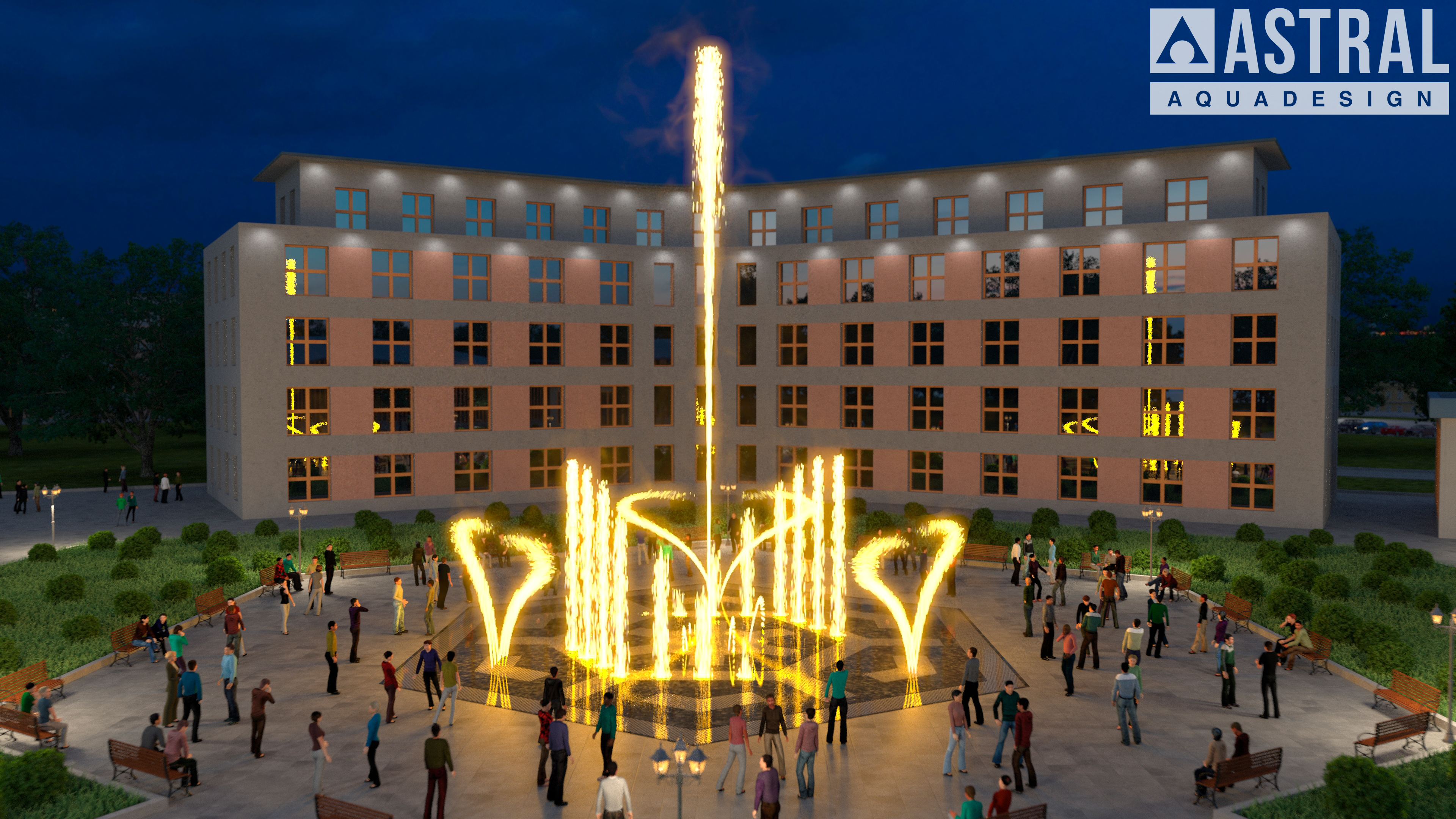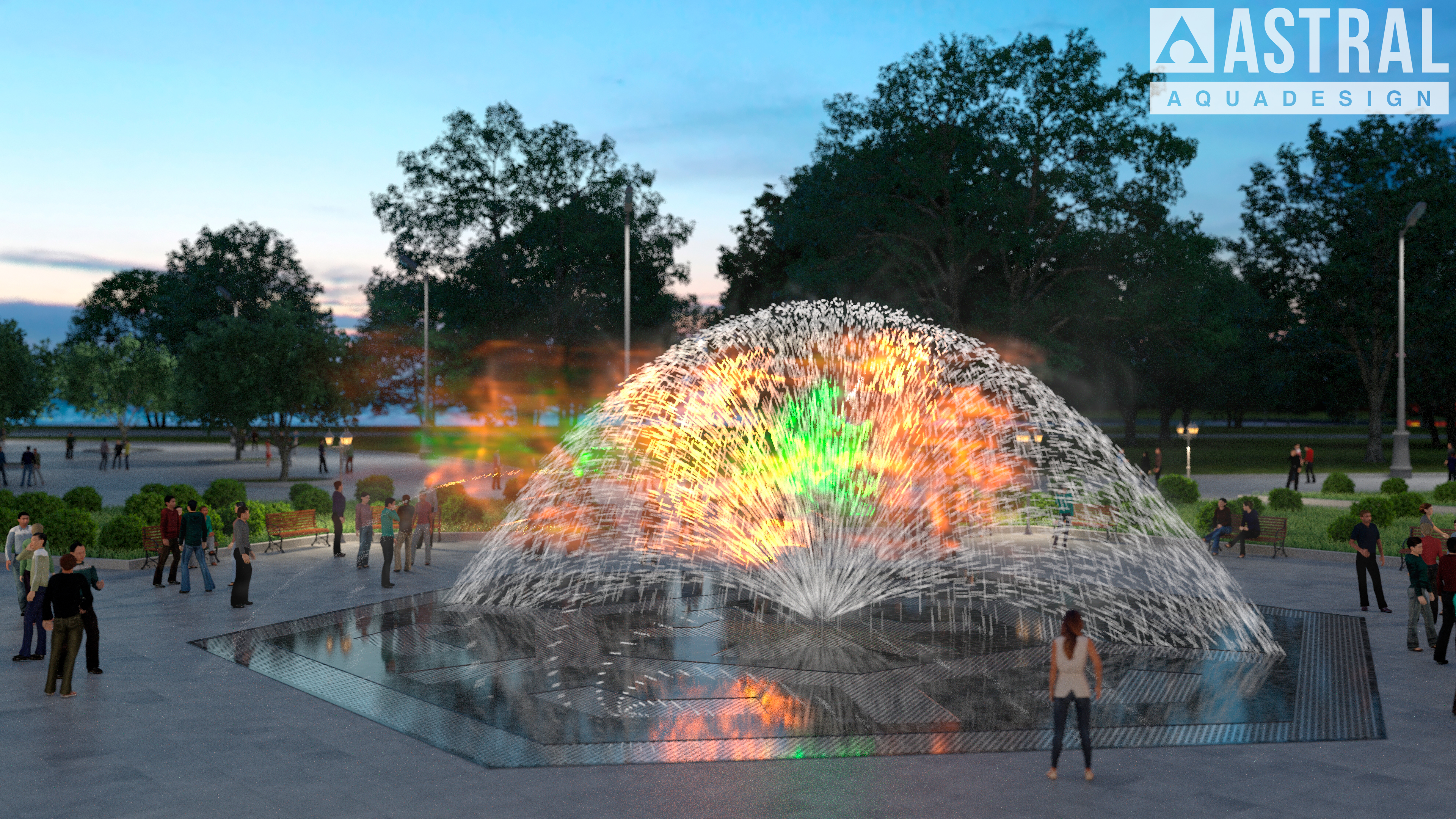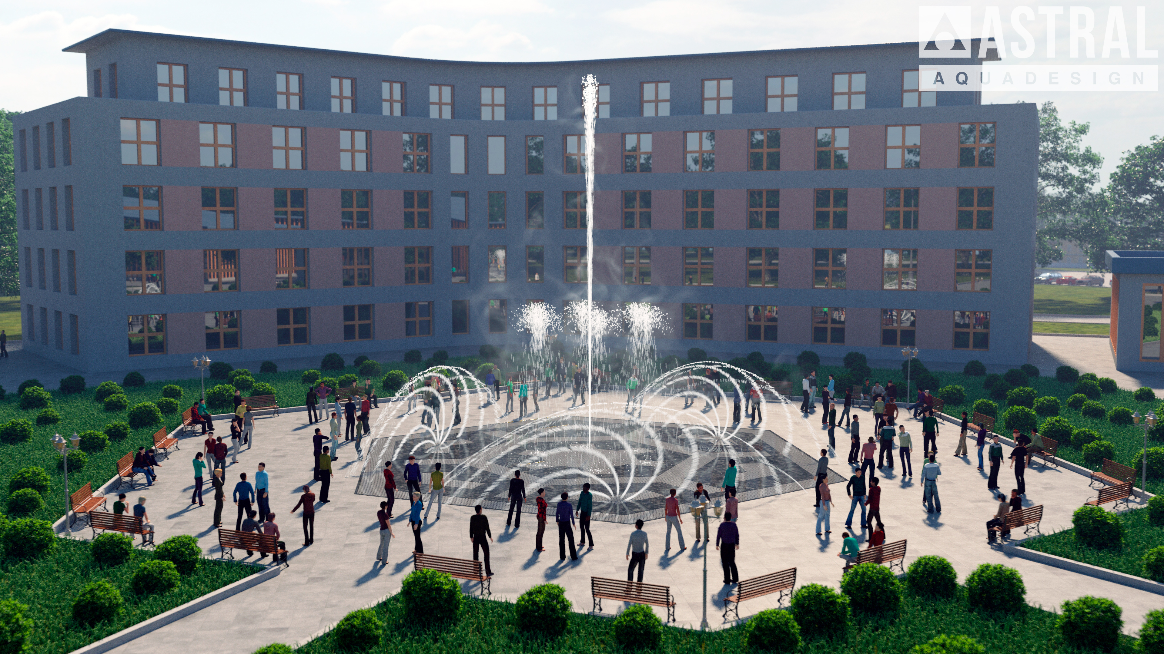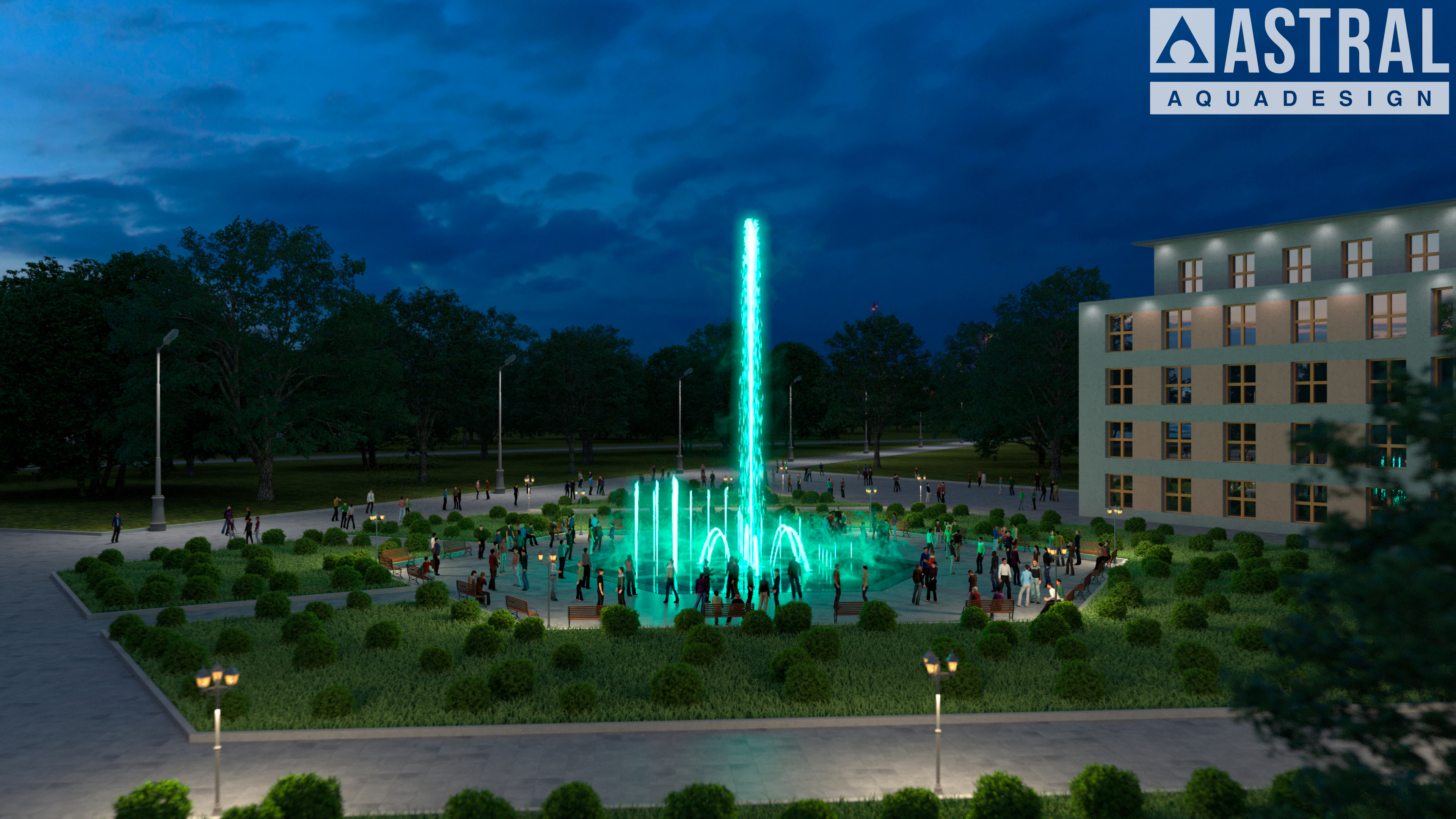 Водный объект имеет современный дизайн и оригинальную расстановку водных картин. Внешний вид фонтана сочетается с окружающим ландшафтом, создает особенный микроклимат и служит местом отдыха. Фонтан отвечает современным требованиям по безопасности, надежности и удобству эксплуатации. Конструкция чаши скрывается ниже нулевого уровня, что позволяет оптимально использовать предложенную площадь в зимнее время. Чаша сверху накрыта гранитом и оцинкованной решеткой. Решетчатый настил обеспечивающей возврат воды в фонтан, несущую способность весовой нагрузки, минимальные потери воды на разбрызгивание и унос ветром.