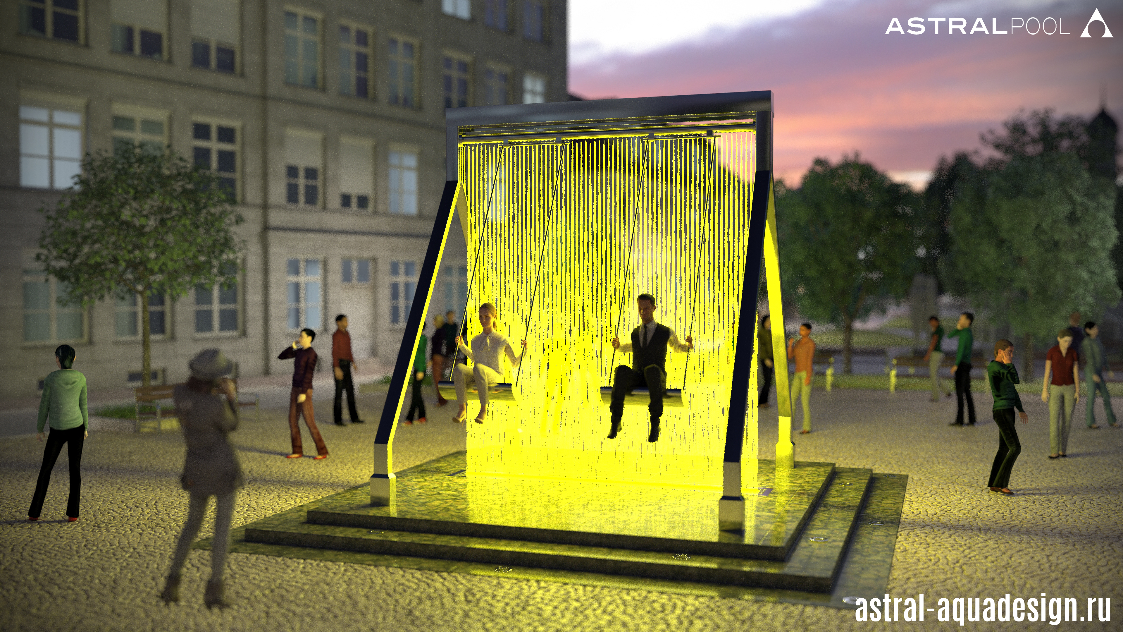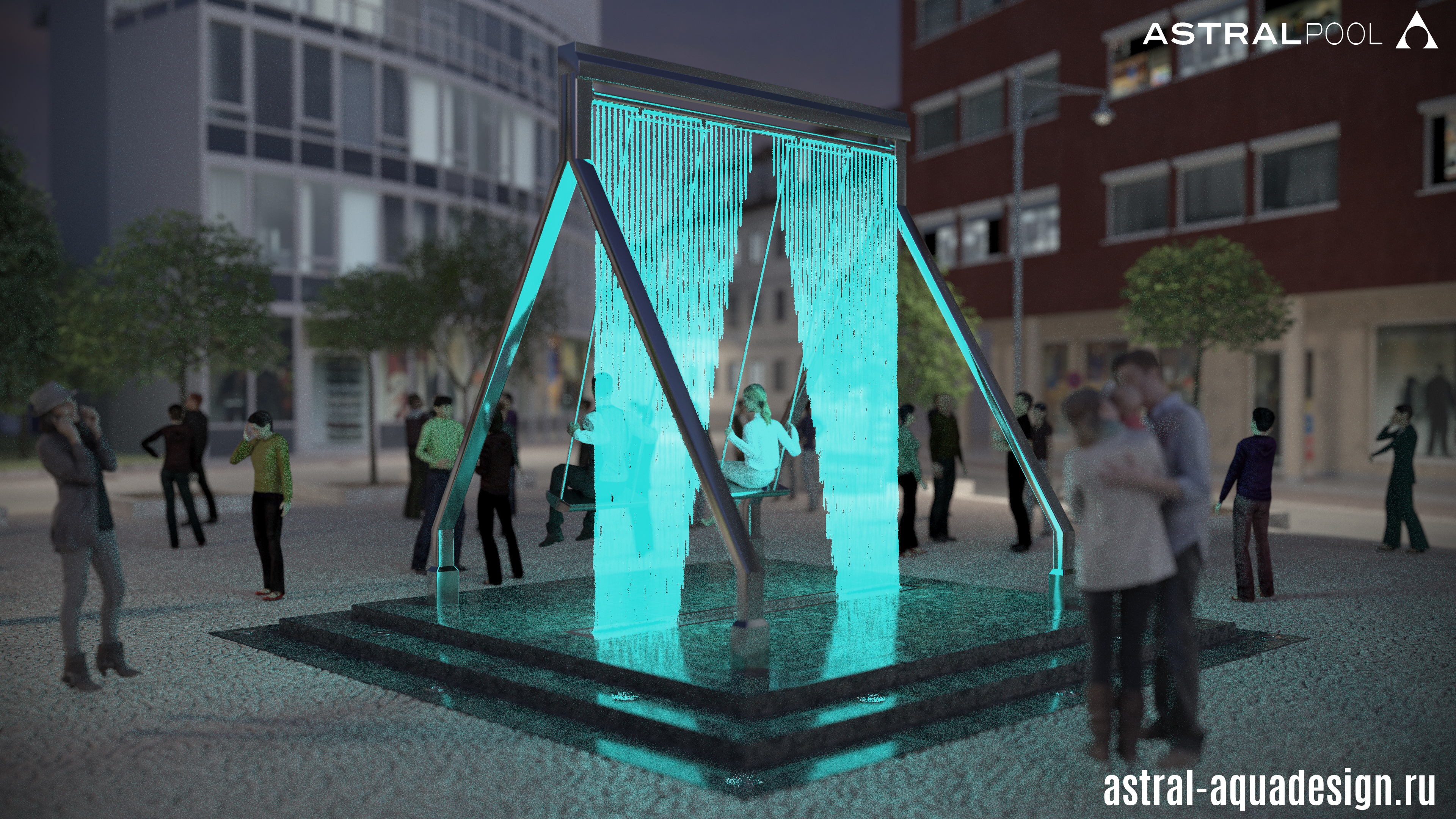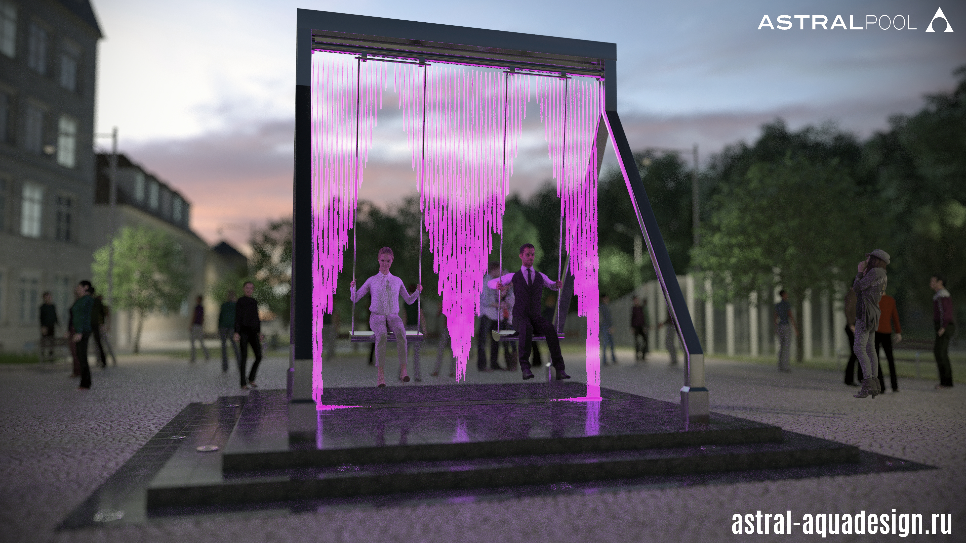 Проект оригинального фонтана "Качели" создали наши специалисты. Он объединяет в себе всеми любимый аттракцион с инновационным оборудованием в сфере фонтаностроения. В его основу положена конструкция цифрового водопада. Ряд вертикальных струй направлен сверху вниз. А при помощи специальных клапанов струи перекрываются, тем самым исключая попадания воды на людей во время использования. Динамическая подсветка струй, добавит еще больше интерактивности.