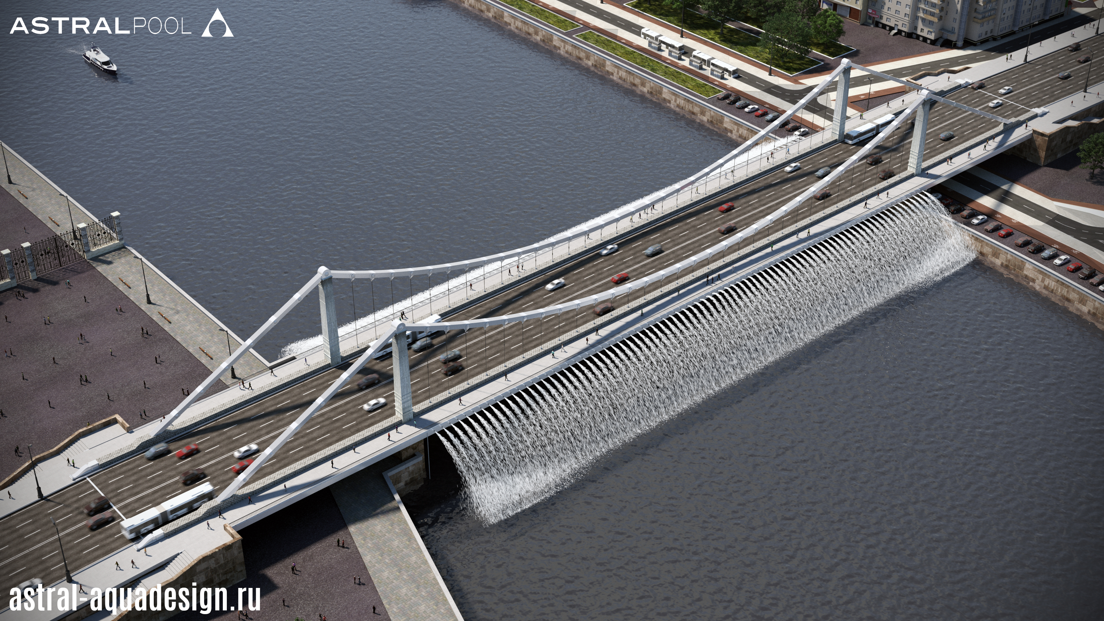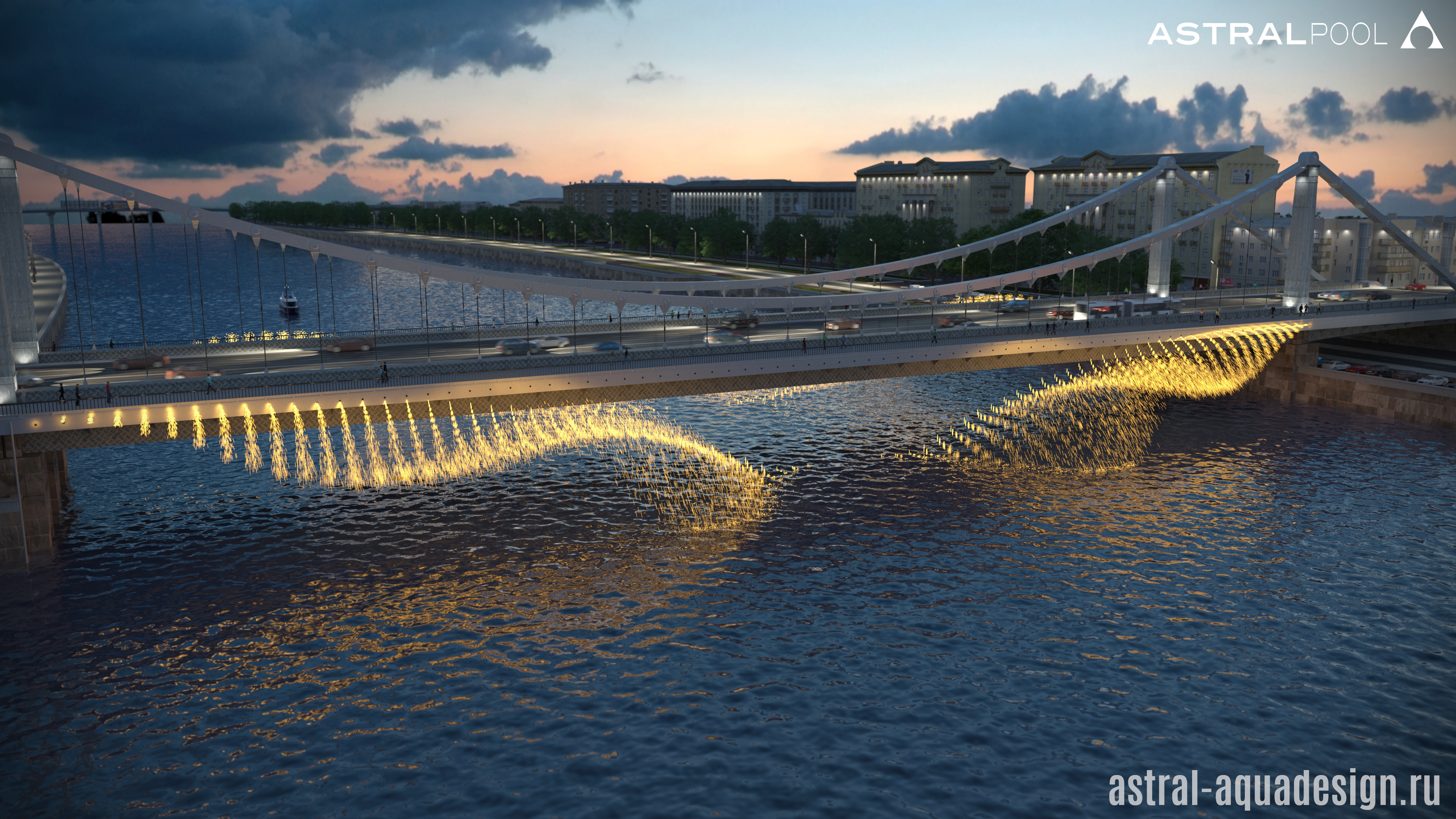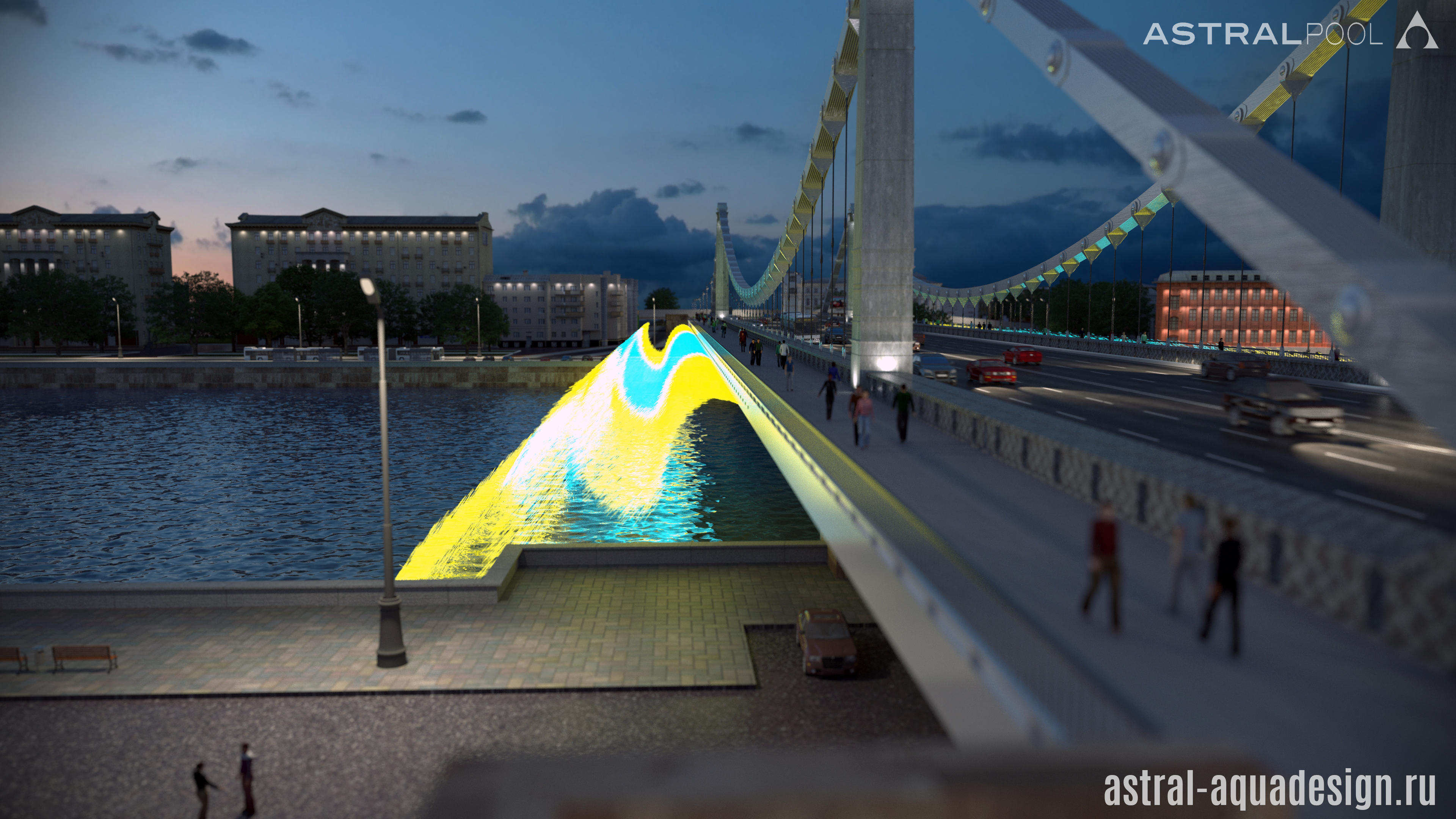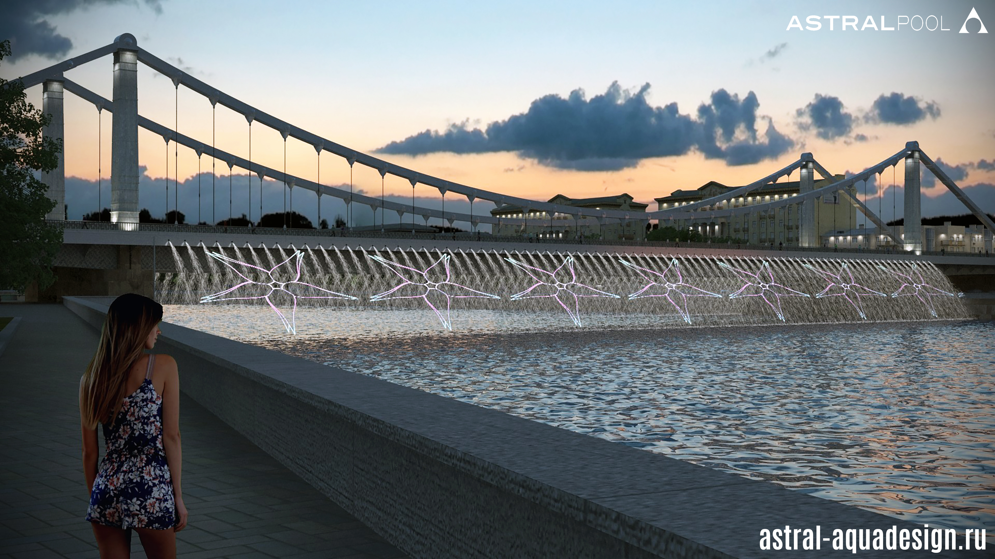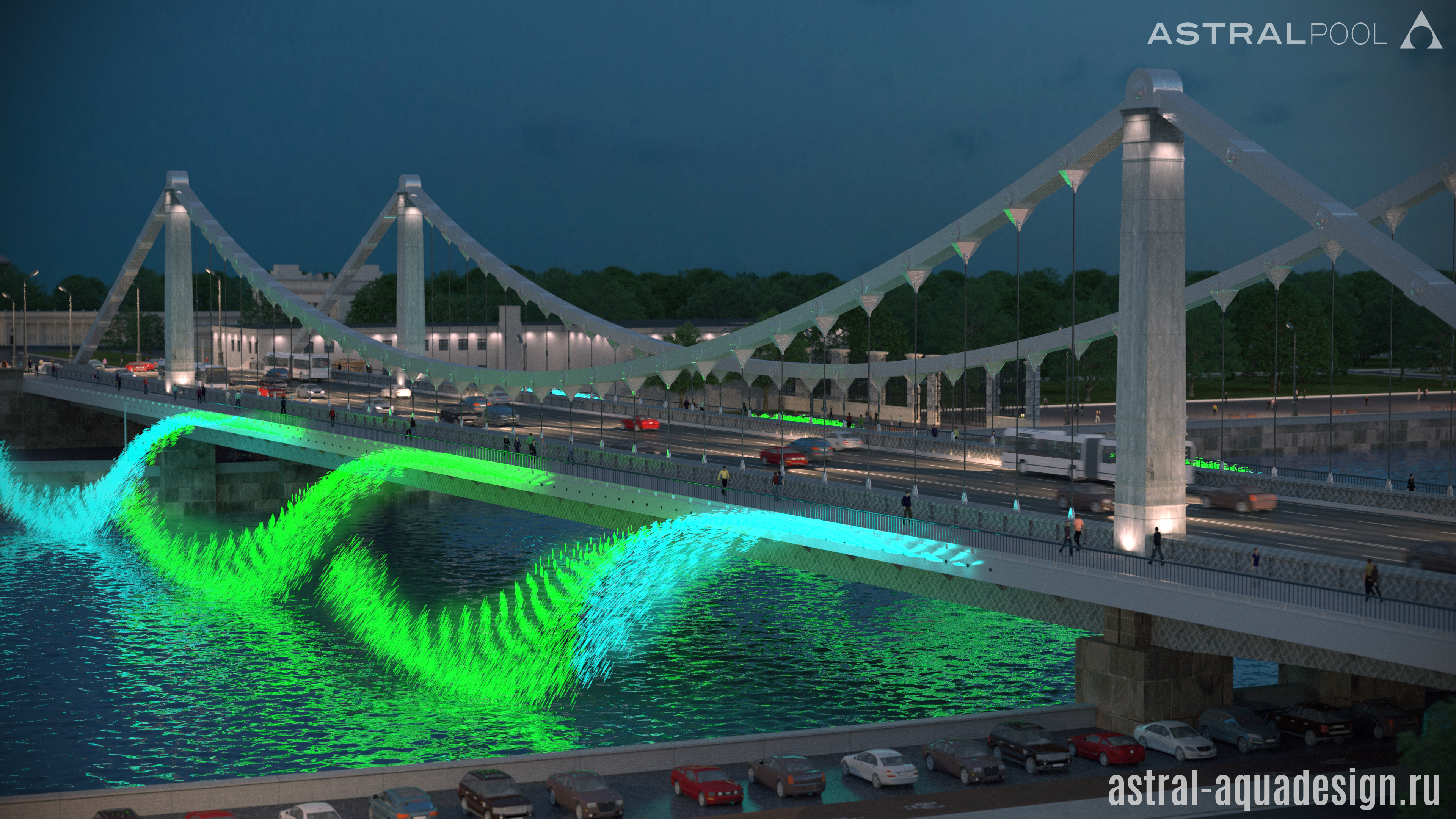 Проект танцующего фонтана на мосту разработали наши специалисты. В основе его концепции роботизированные форсунки, установленные вдоль всего сооружения. Они создают струи, которые двигаются разных направлениях, создавая причудливые узоры. Динамическая подсветка украшает водный объект в наступлением темноты. Включенные одновременно струи образуют водную пленку, на которую можно проецировать изображения.