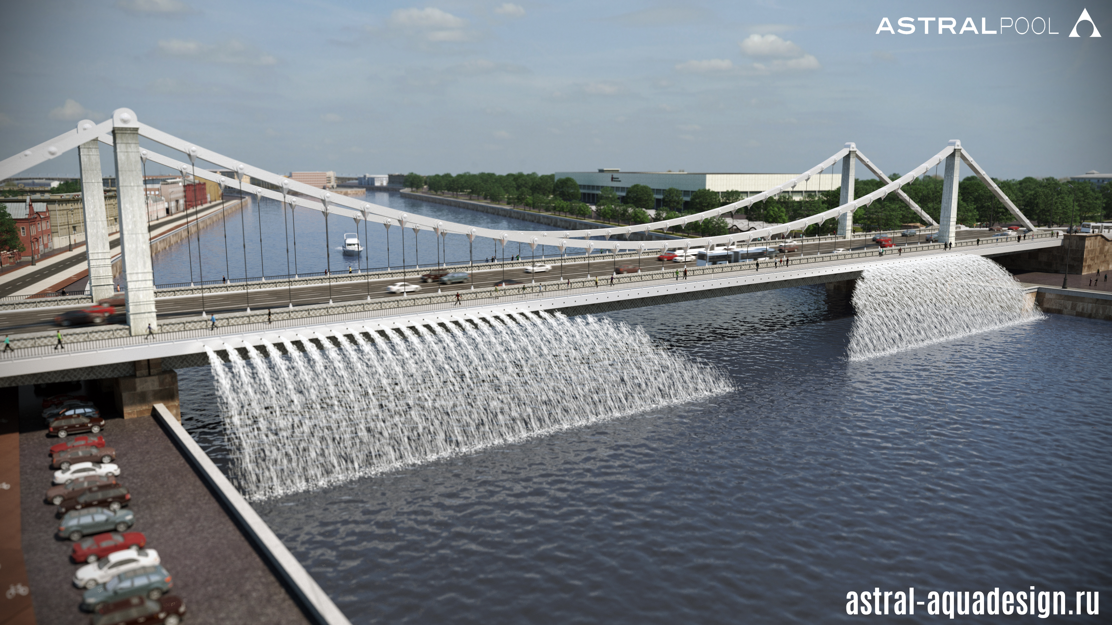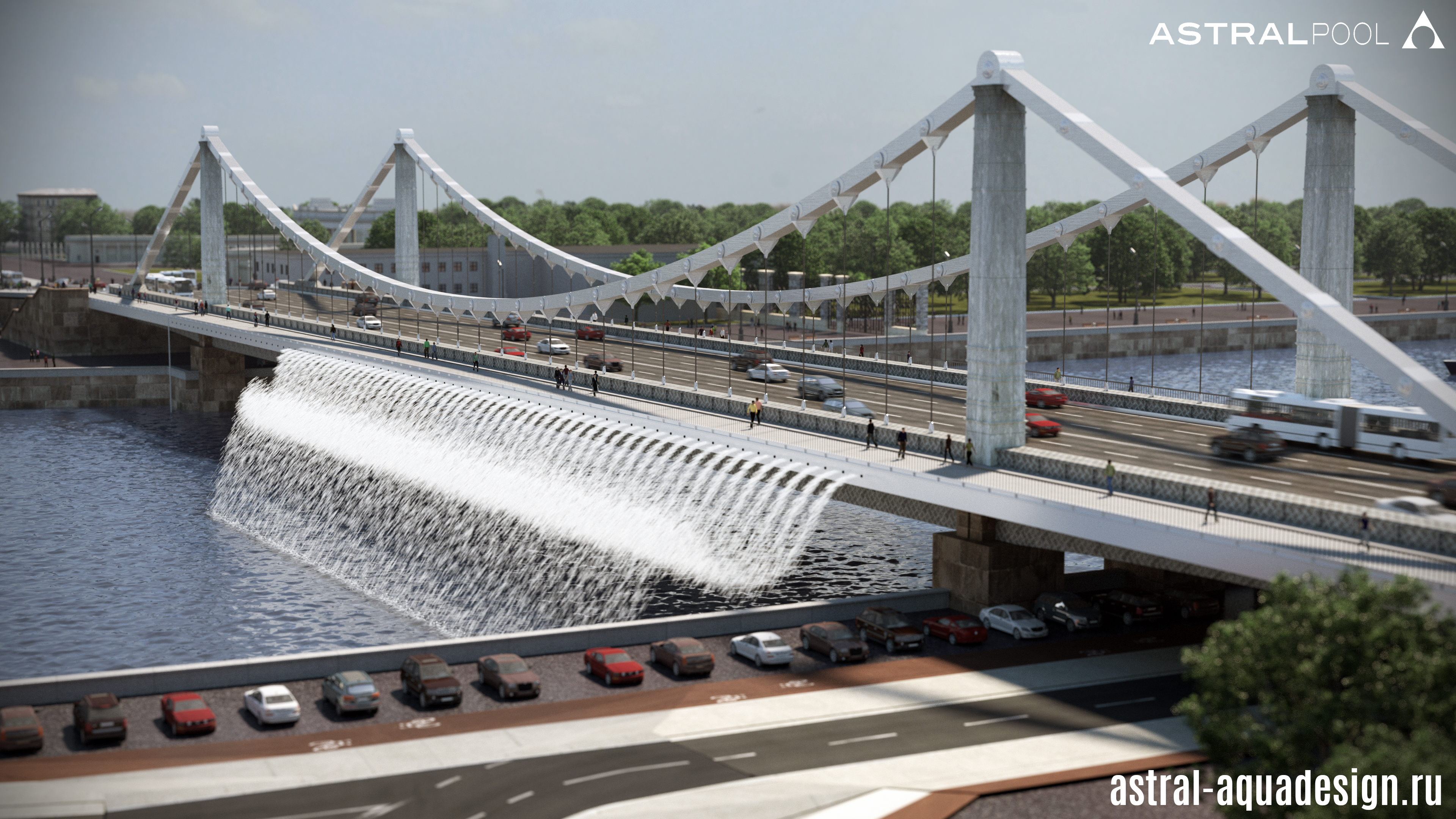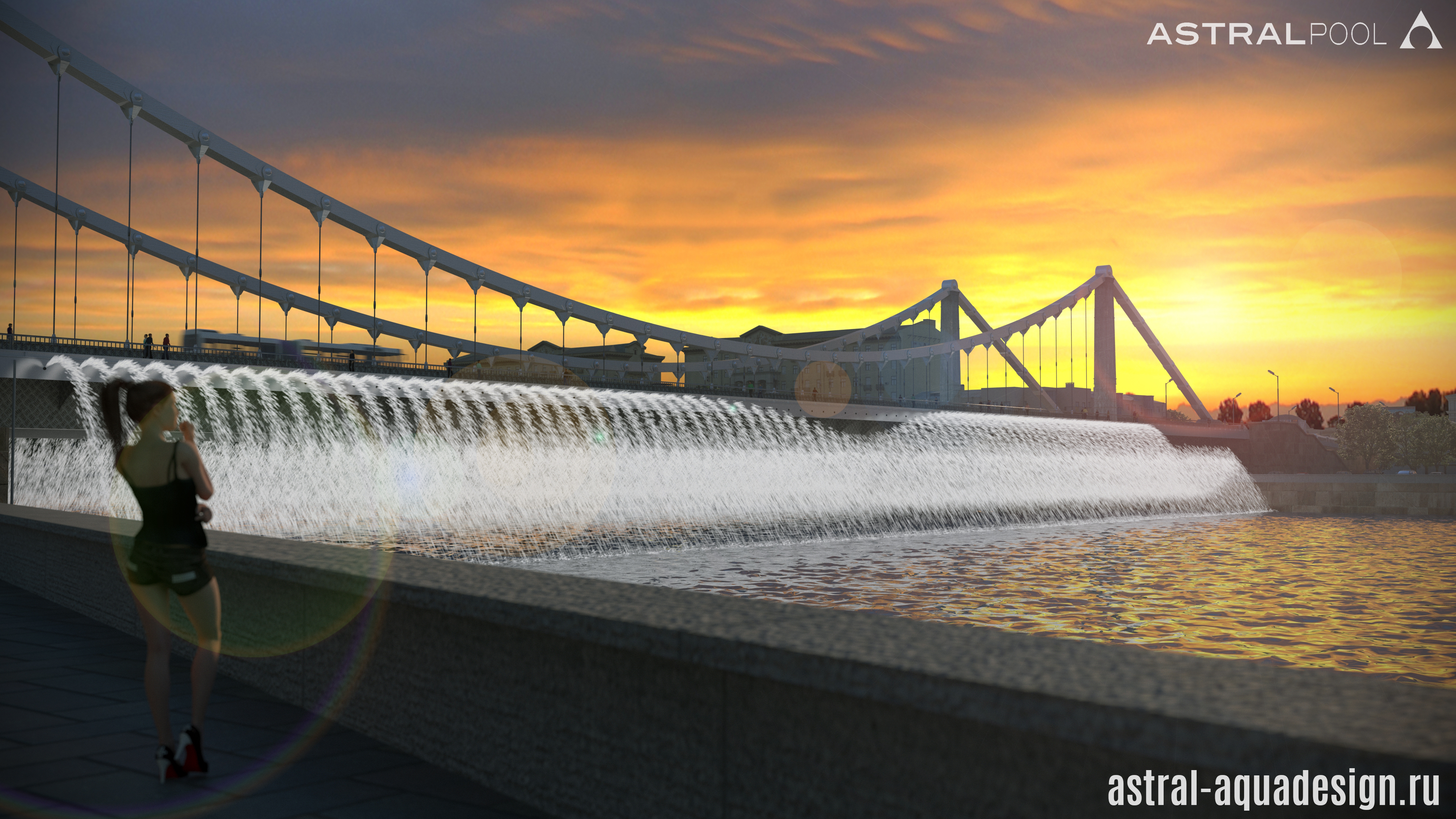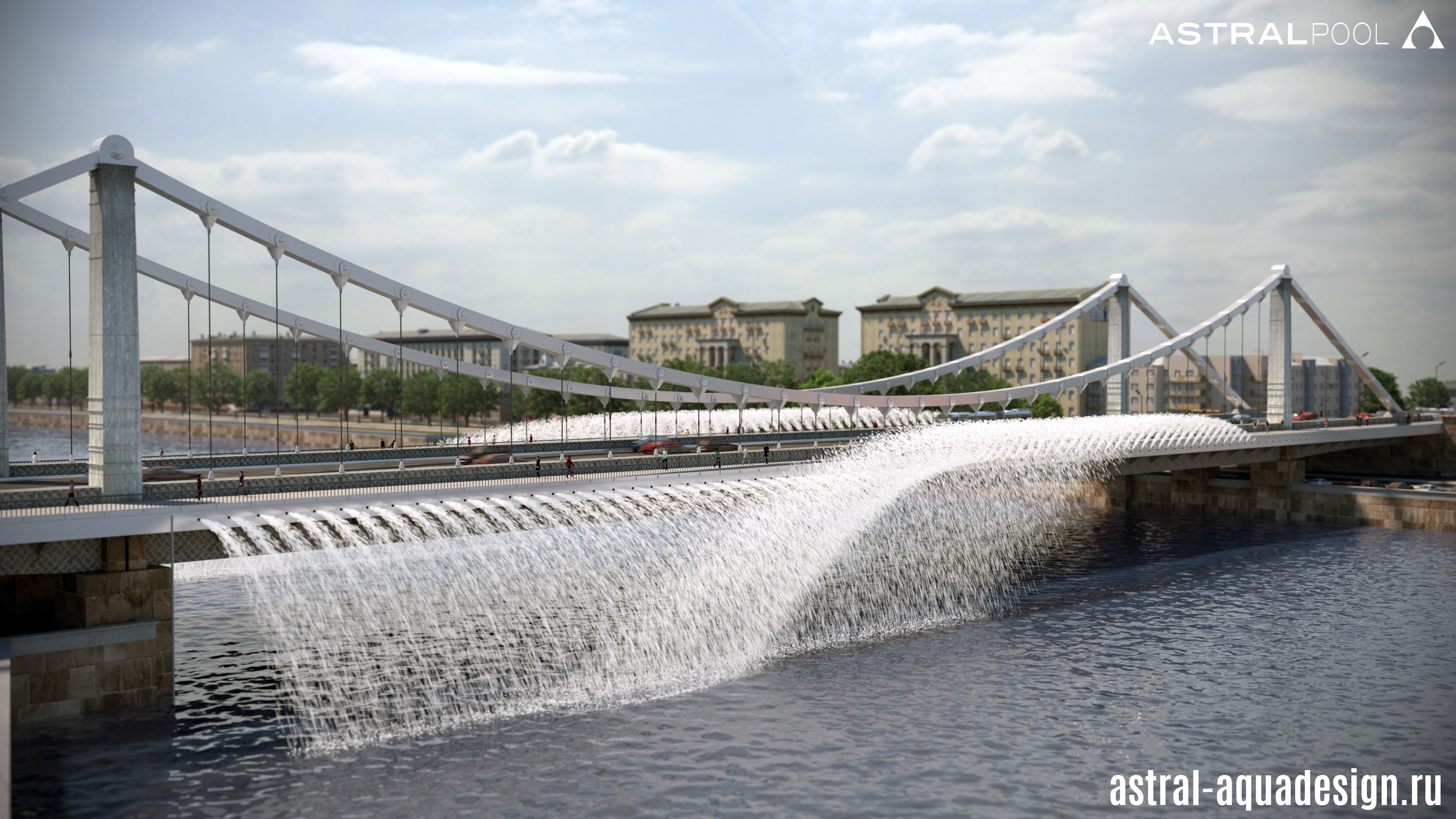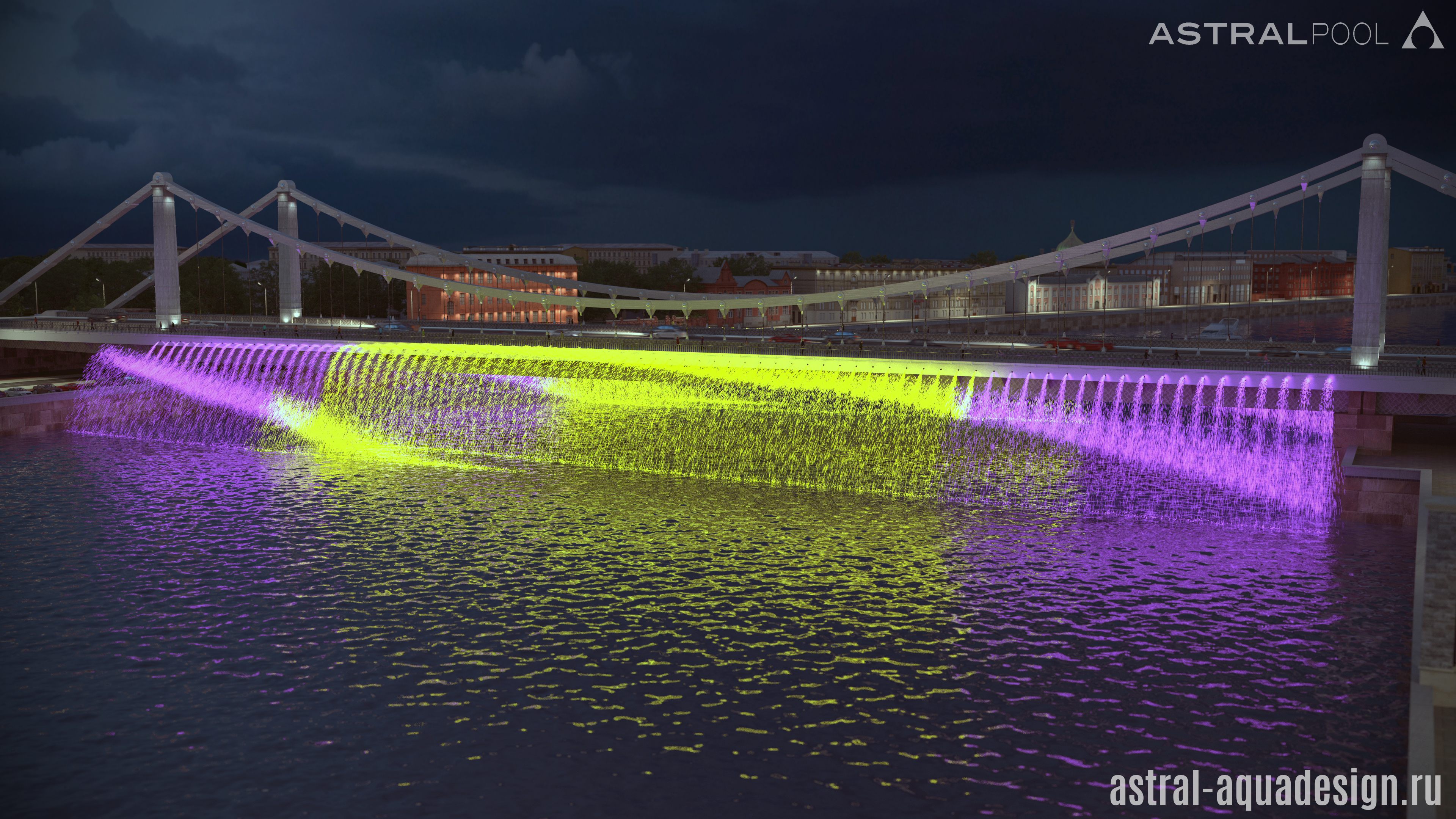 Проект танцующего фонтана на мосту разработали наши специалисты. В основе его концепции роботизированные форсунки, установленные вдоль всего сооружения. Они создают струи, которые двигаются разных направлениях, создавая причудливые узоры. Динамическая подсветка украшает водный объект в наступлением темноты. Включенные одновременно струи образуют водную пленку, на которую можно проецировать изображения.