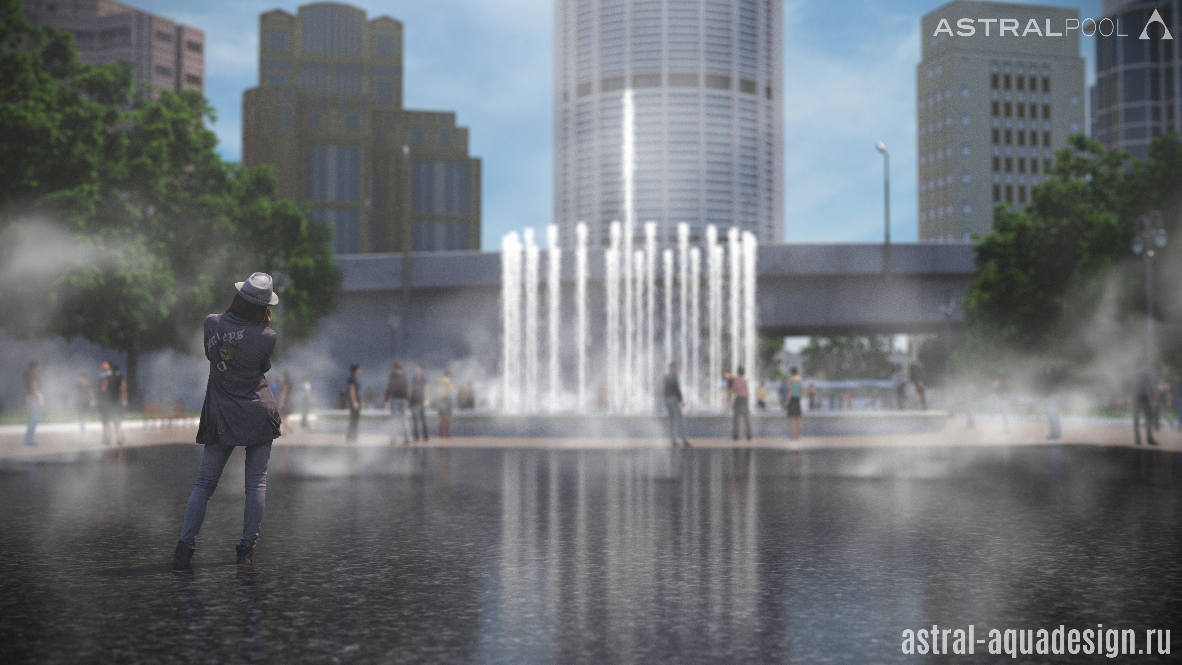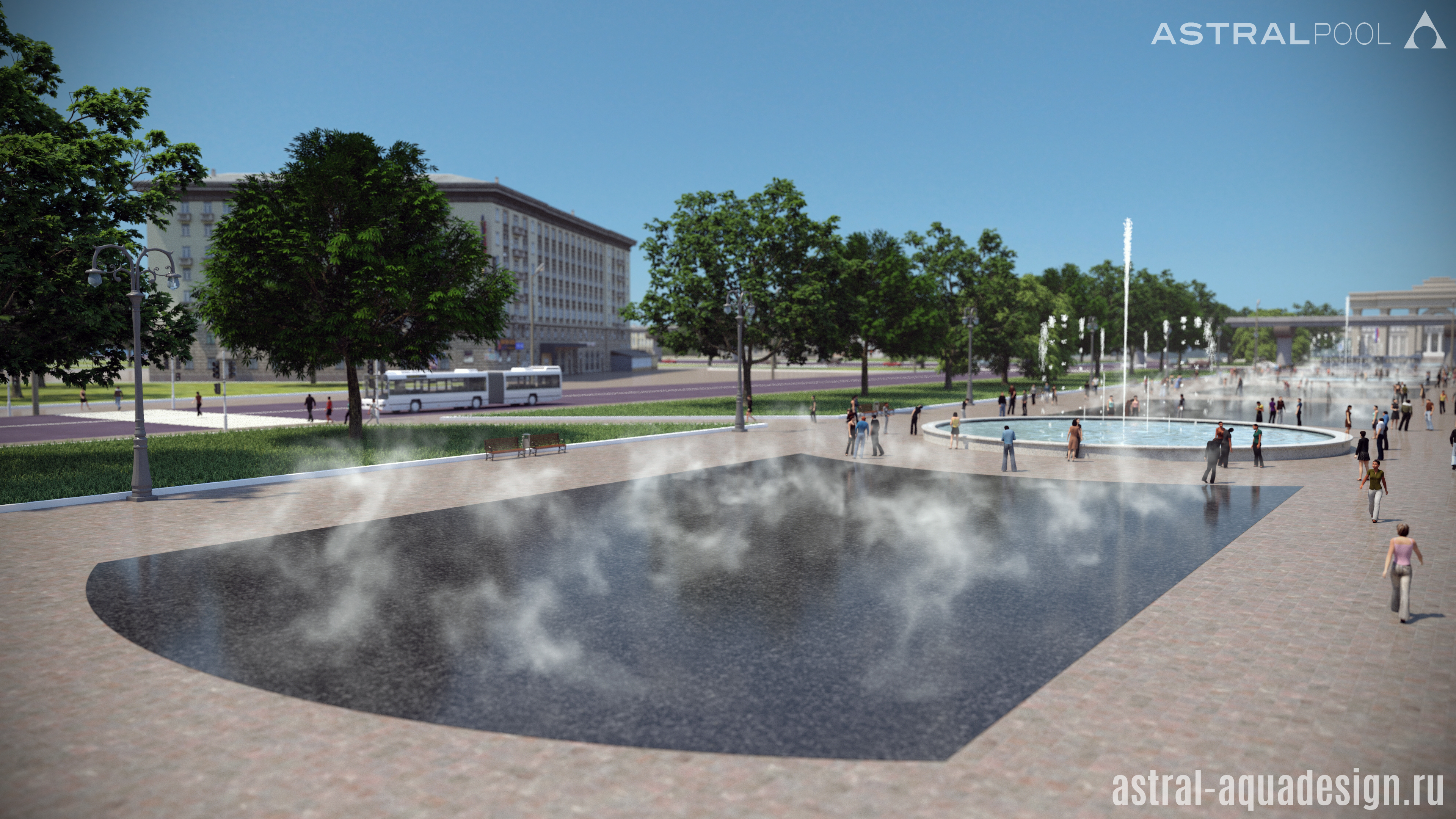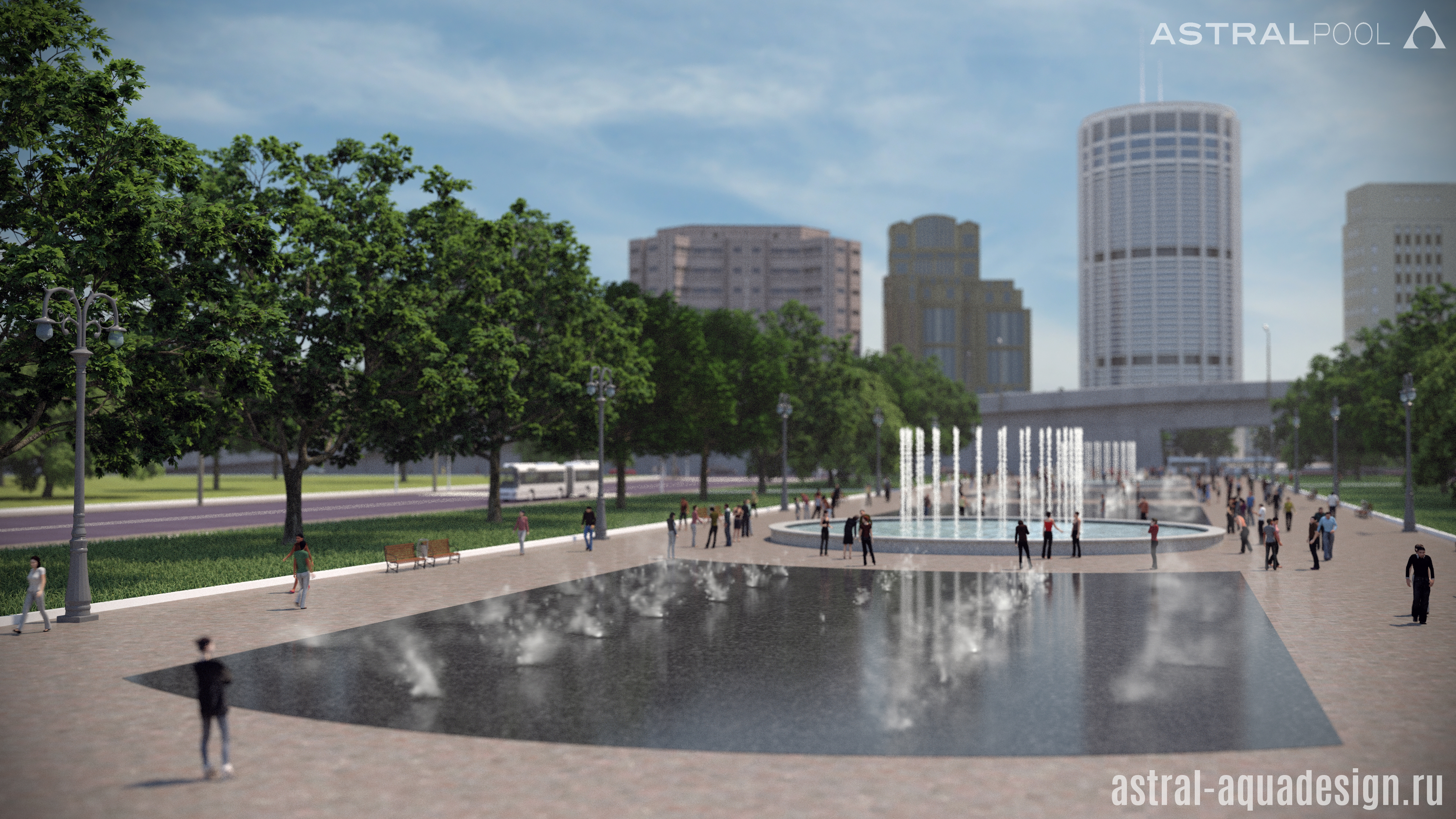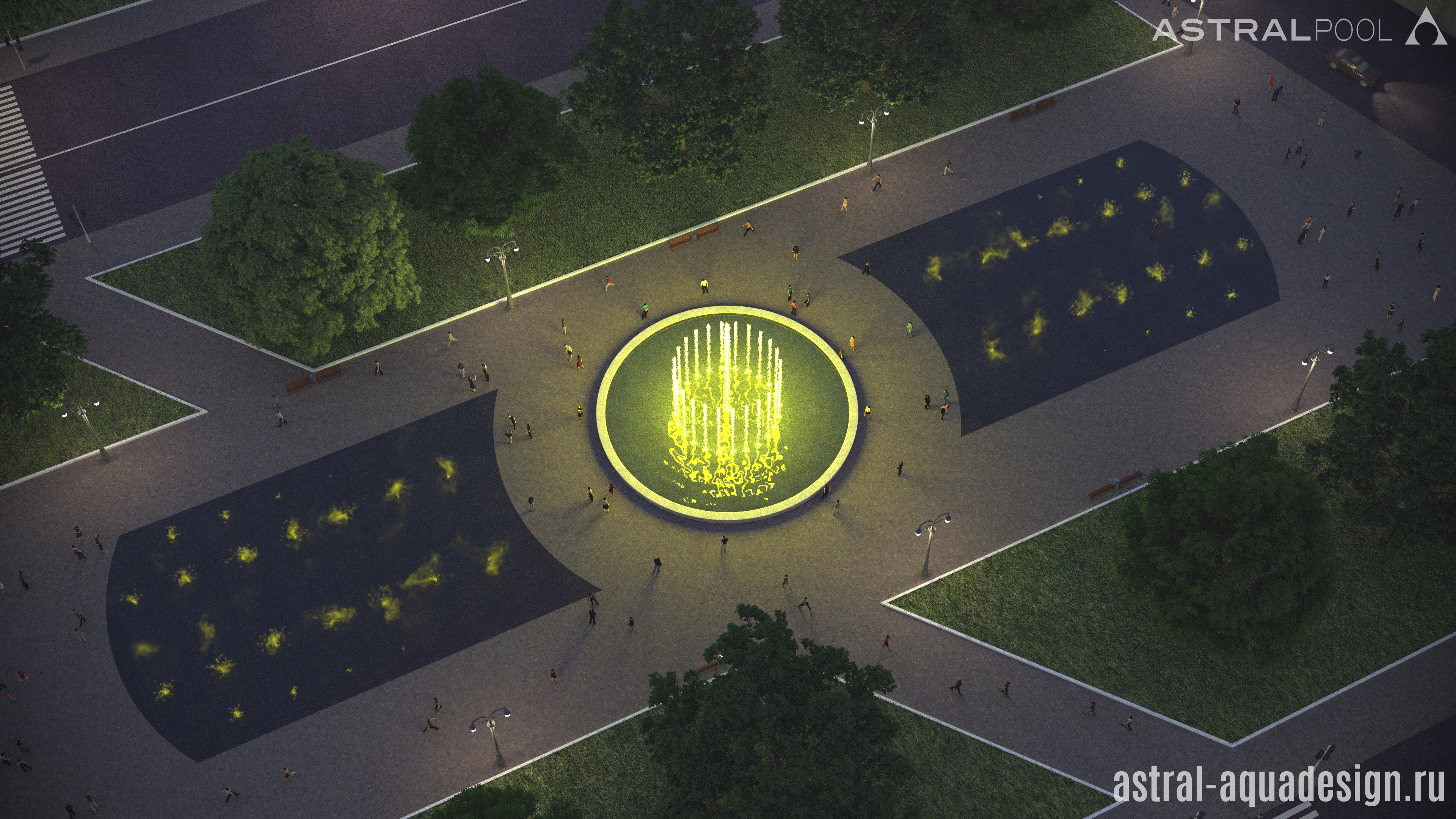 Команда наших специалистов представляет вашему вниманию проект очень необычного фонтанного комплекса для строительства на площади. Он сочетает в себе сразу два водных объекта — чашный фонтан диаметром 20 метров и зеркальный водоем (или зеркальный фонтан) размером 32 х 20 метров каждый.