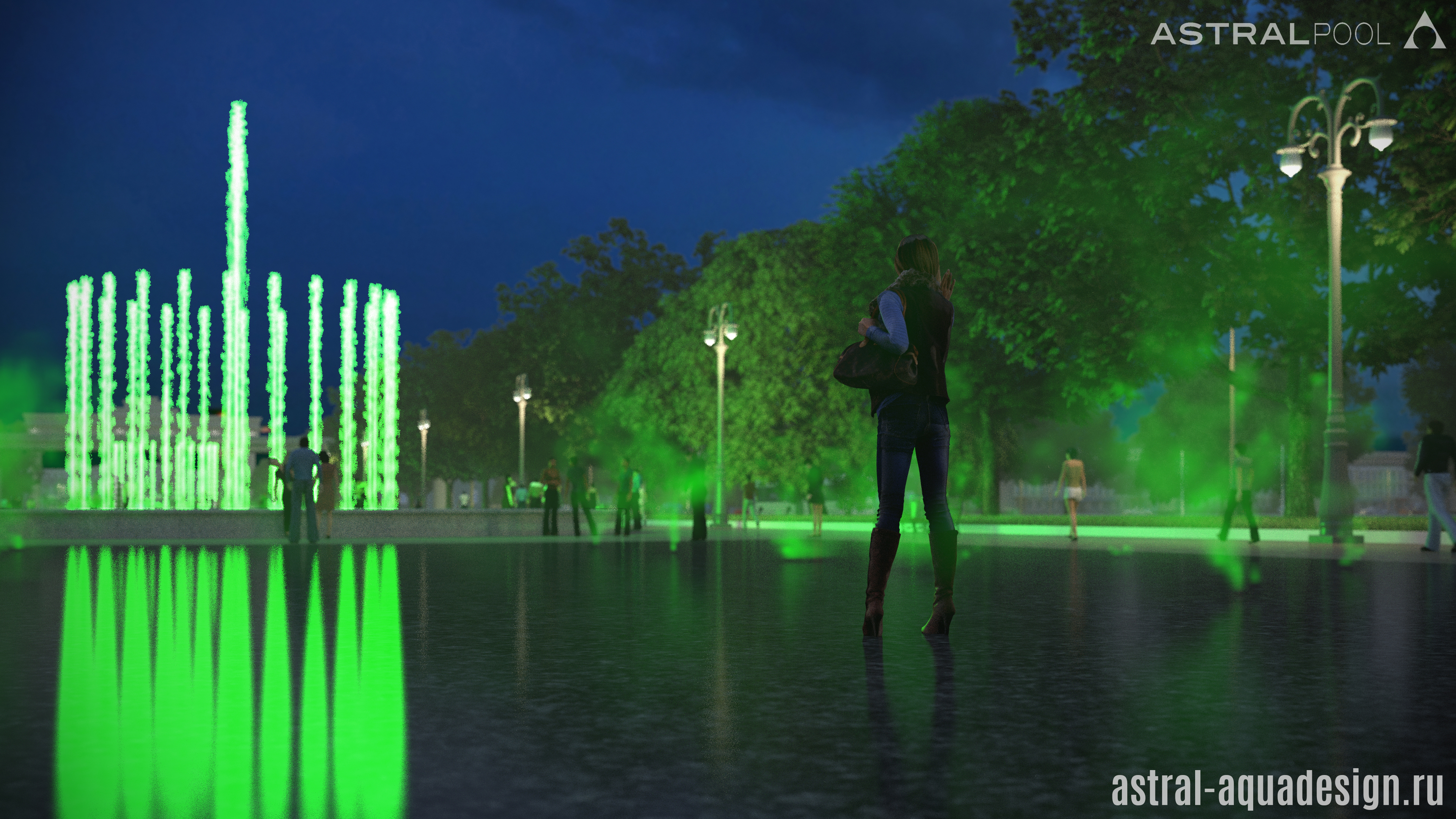 Композицию чашного фонтана будут образовывать вертикальные пенные струи. План подсветки разработан таким образом чтобы расставлять акценты и на струях и на бортах чаши. Два зеркальных водоёма дополнены туманообразующими насадками создающими легкую дымку над гладкой поверхностью воды. Каждая насадка будет также оснащена светильниками.