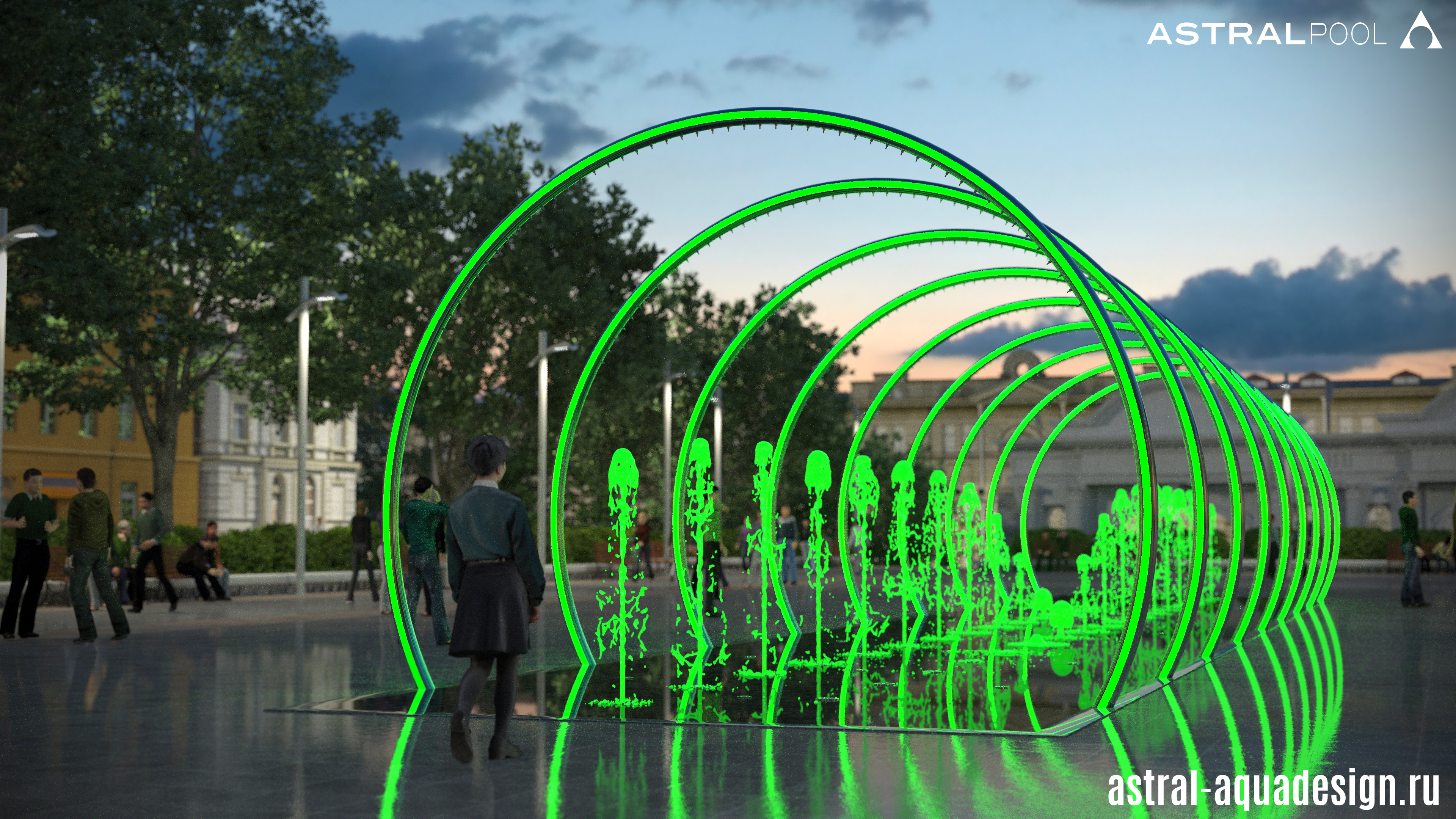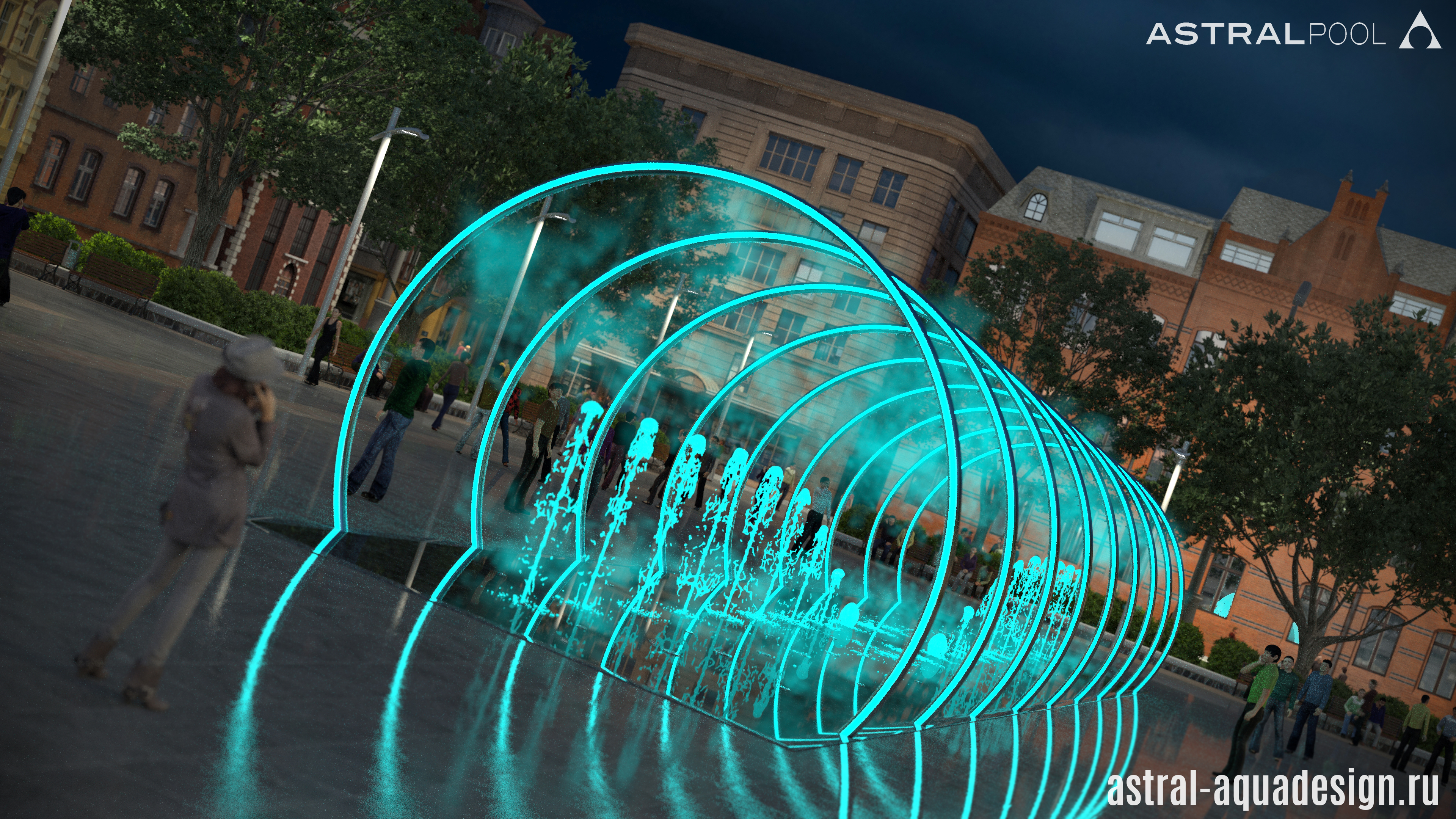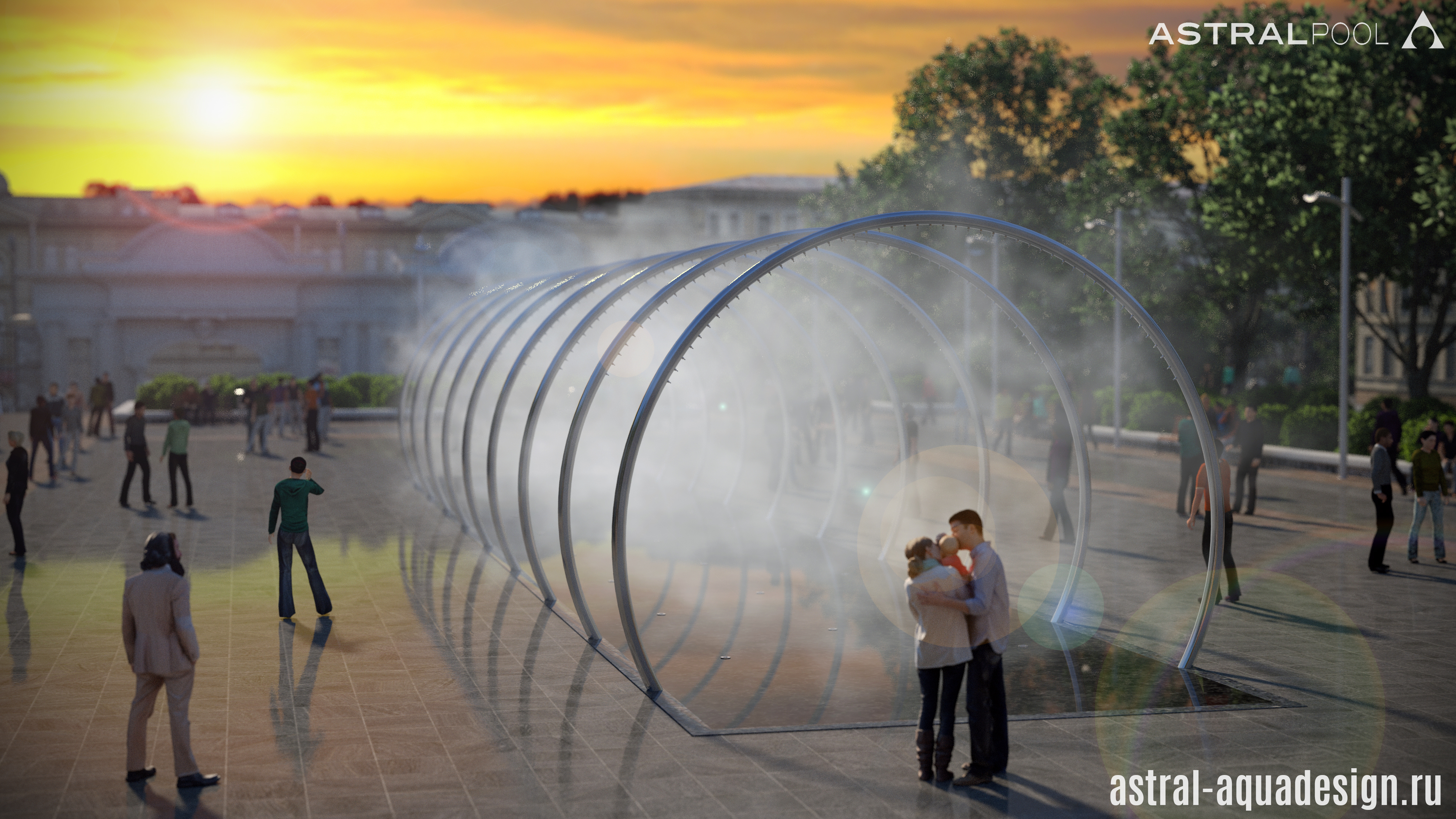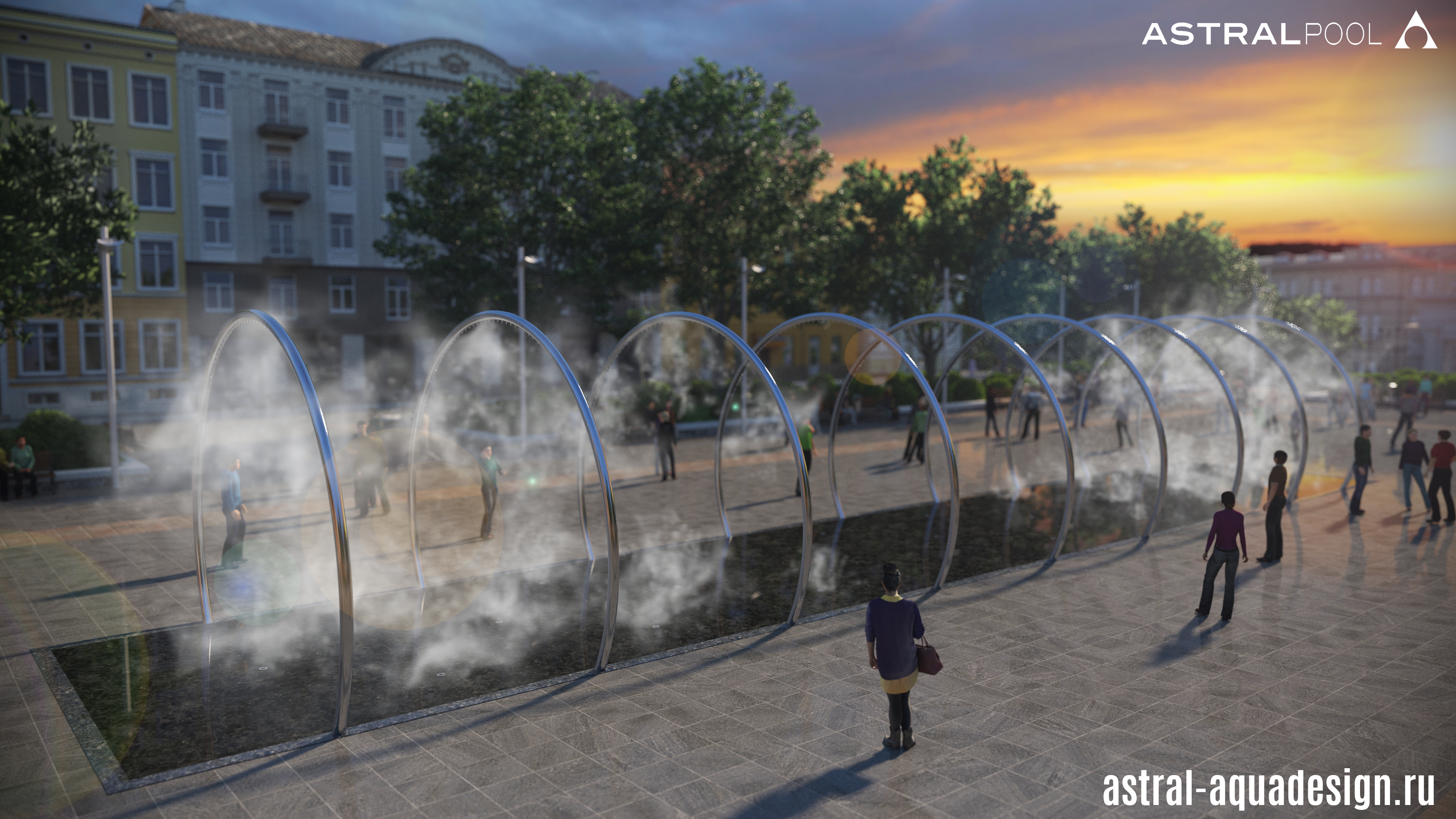 Пешеходный фонтан-аллея - это идеальное решение для городских парков и скверов. Он не занимает много места, и в тоже время универсален. В зависимости от сезона конструкция может быть украшена различными декоративными элементами: светильники, клумбы, осенние или зимние подвесные декорации.