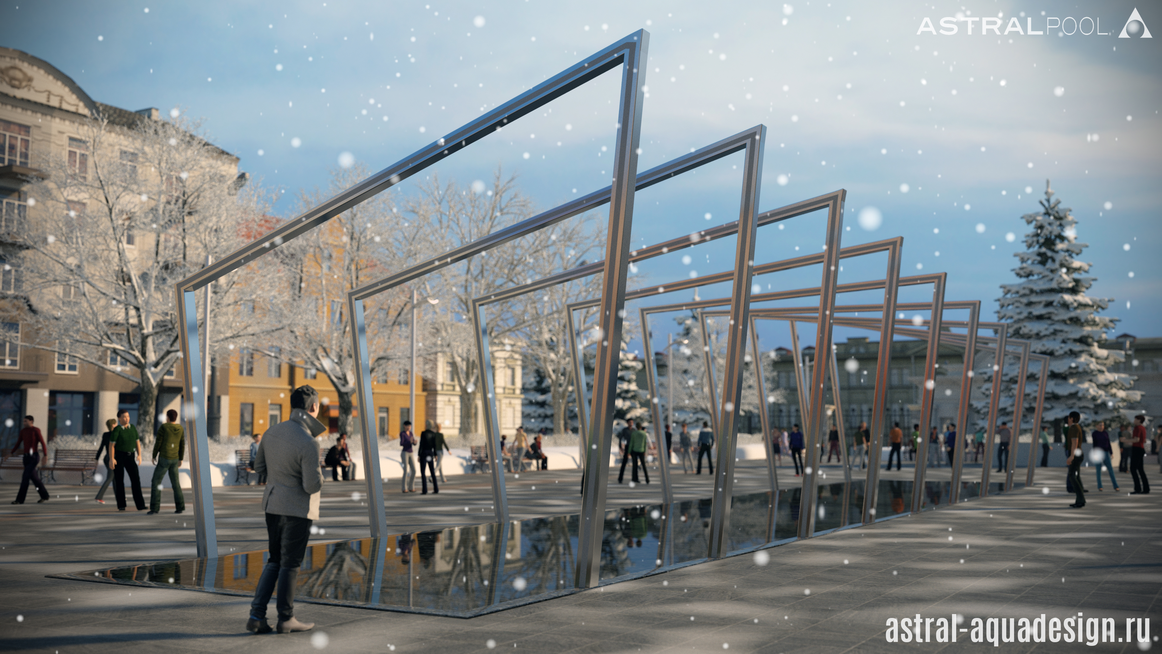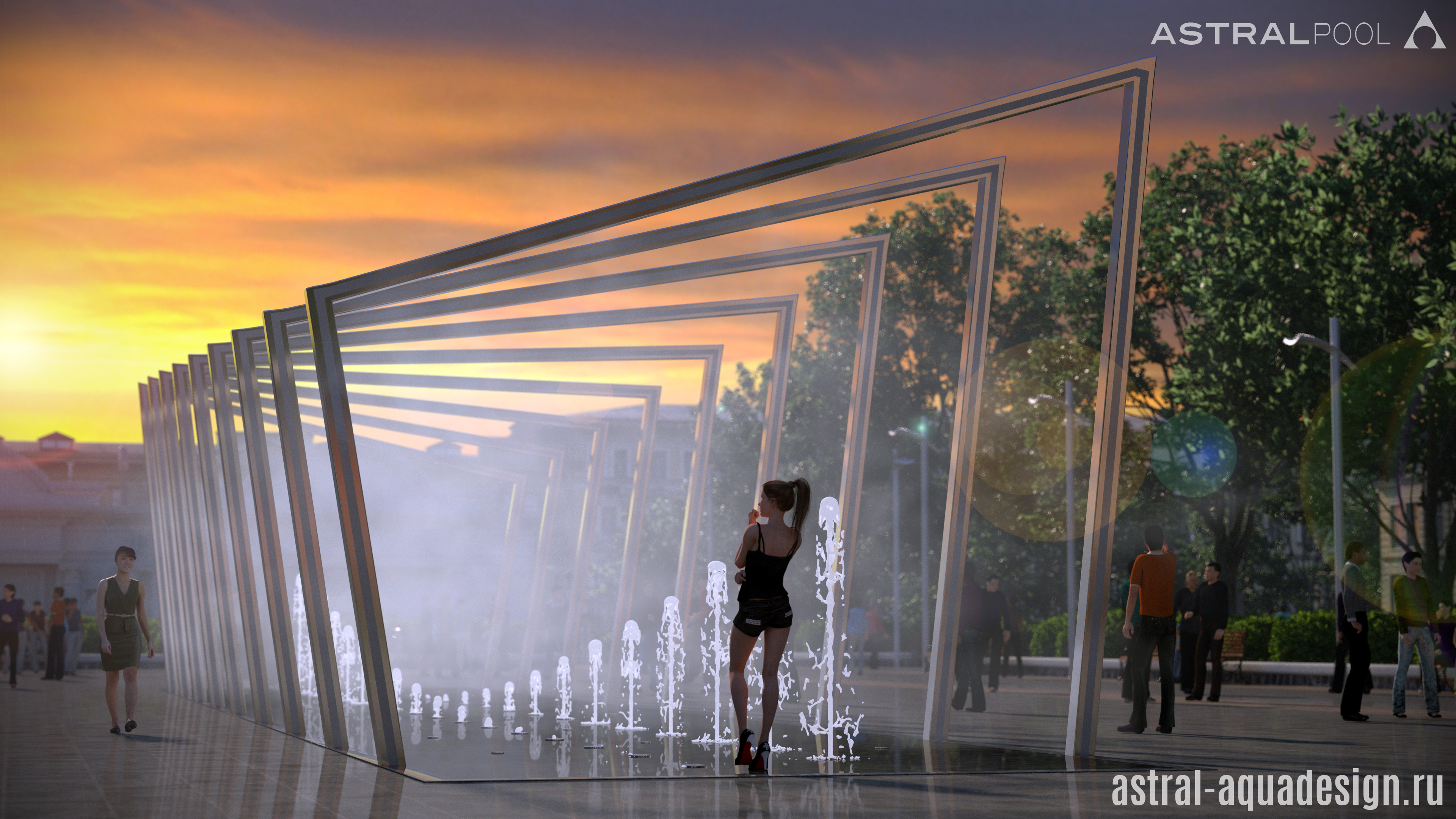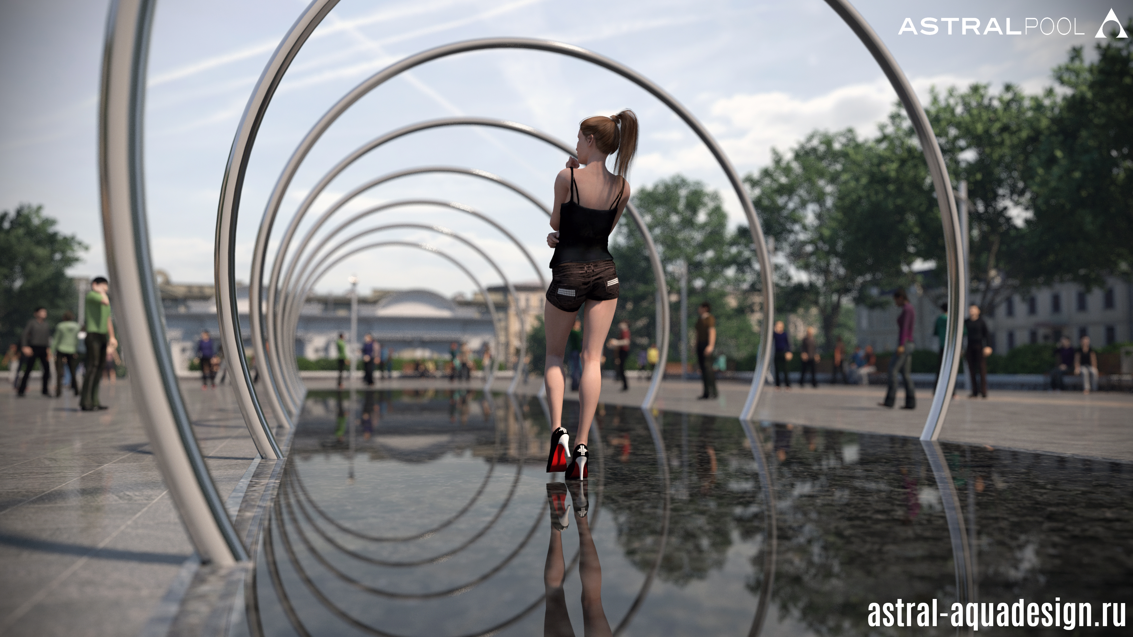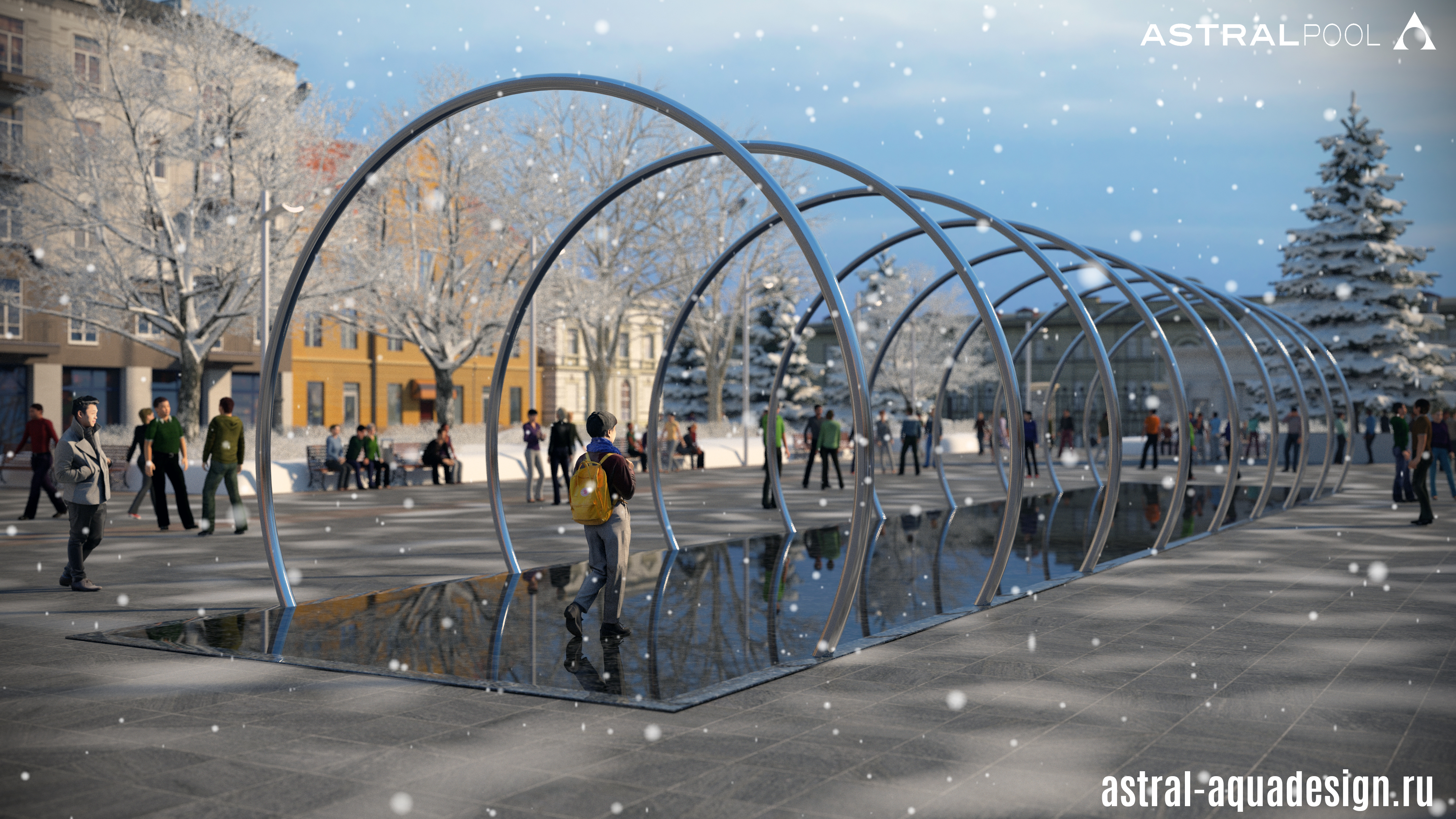 Пешеходный фонтан-аллея - это идеальное решение для городских парков и скверов. Он не занимает много места, и в тоже время универсален. В зависимости от сезона конструкция может быть украшена различными декоративными элементами: светильники, клумбы, осенние или зимние подвесные декорации.