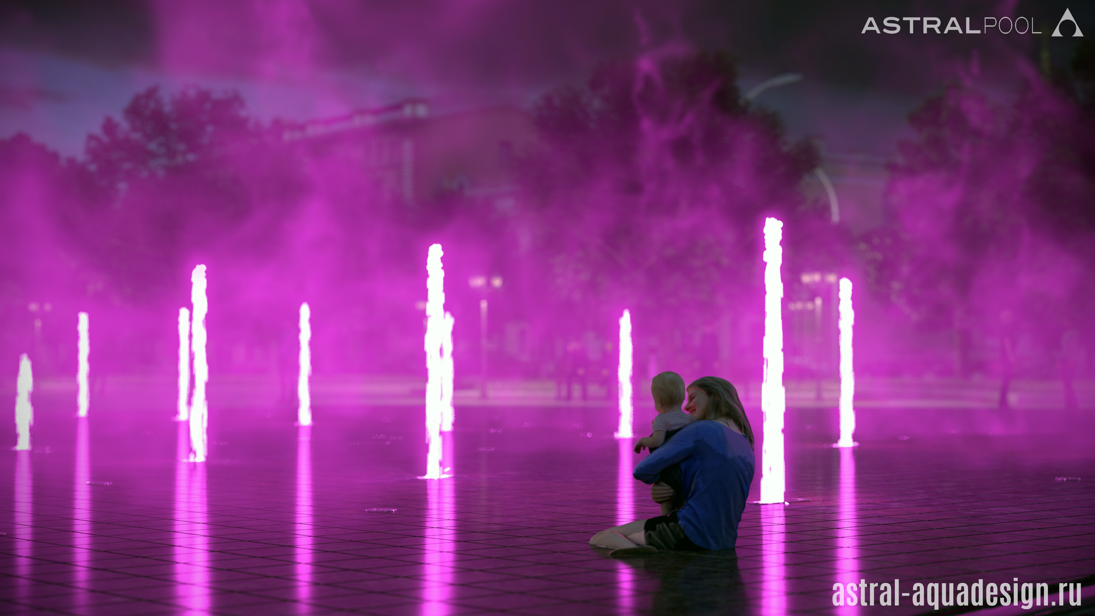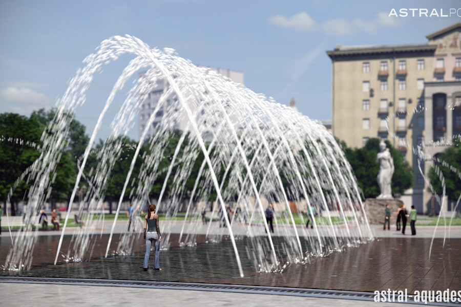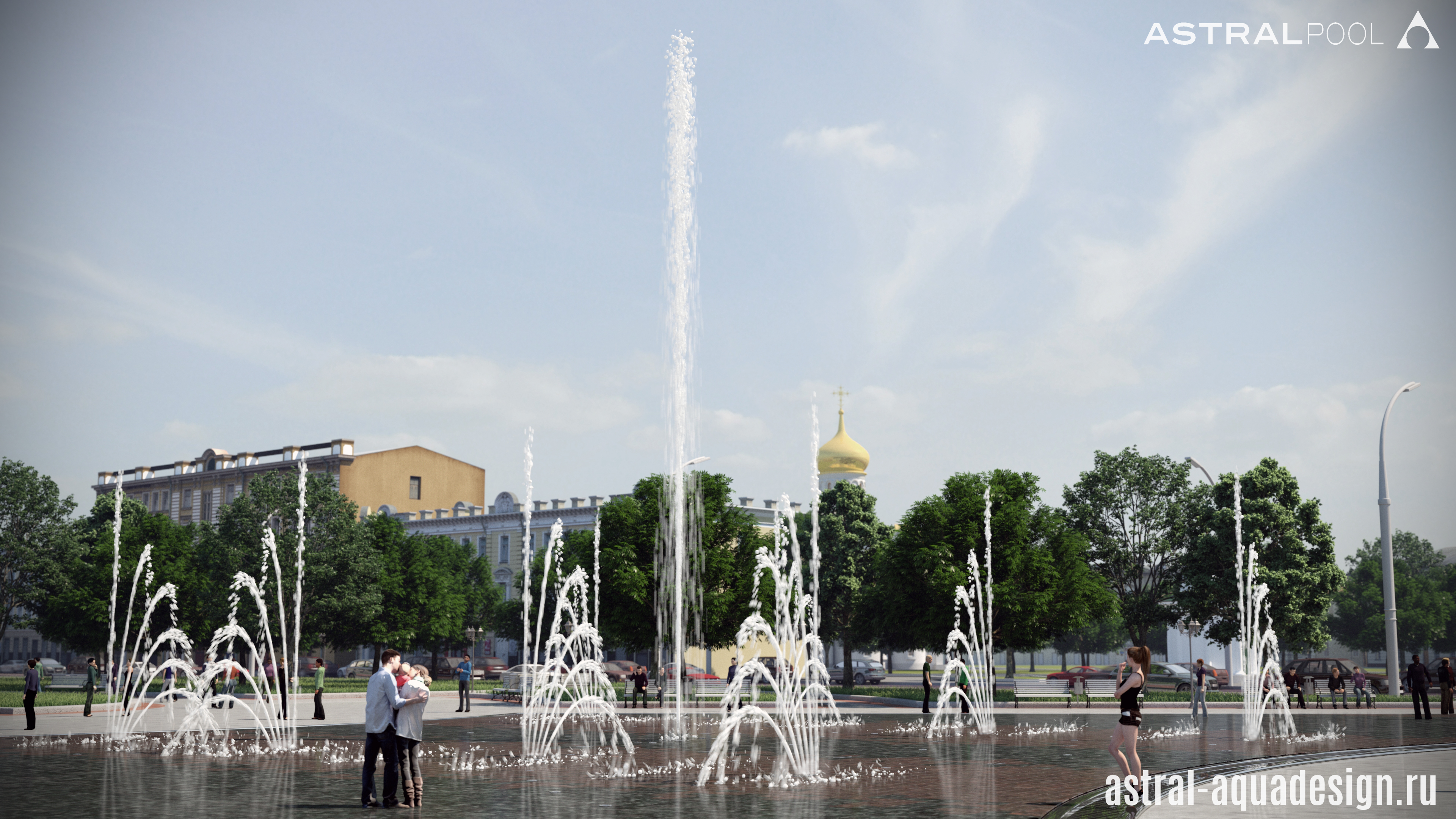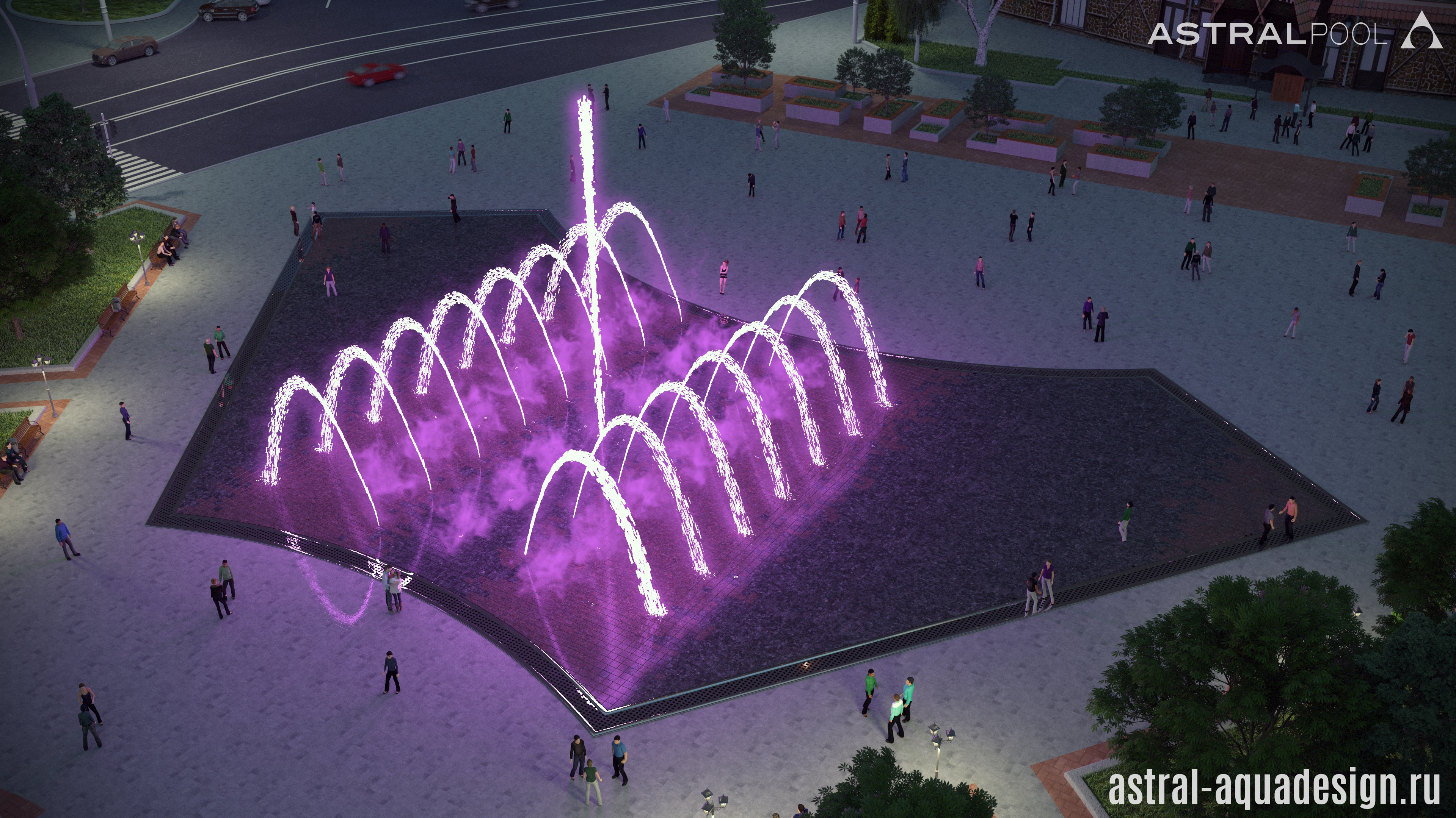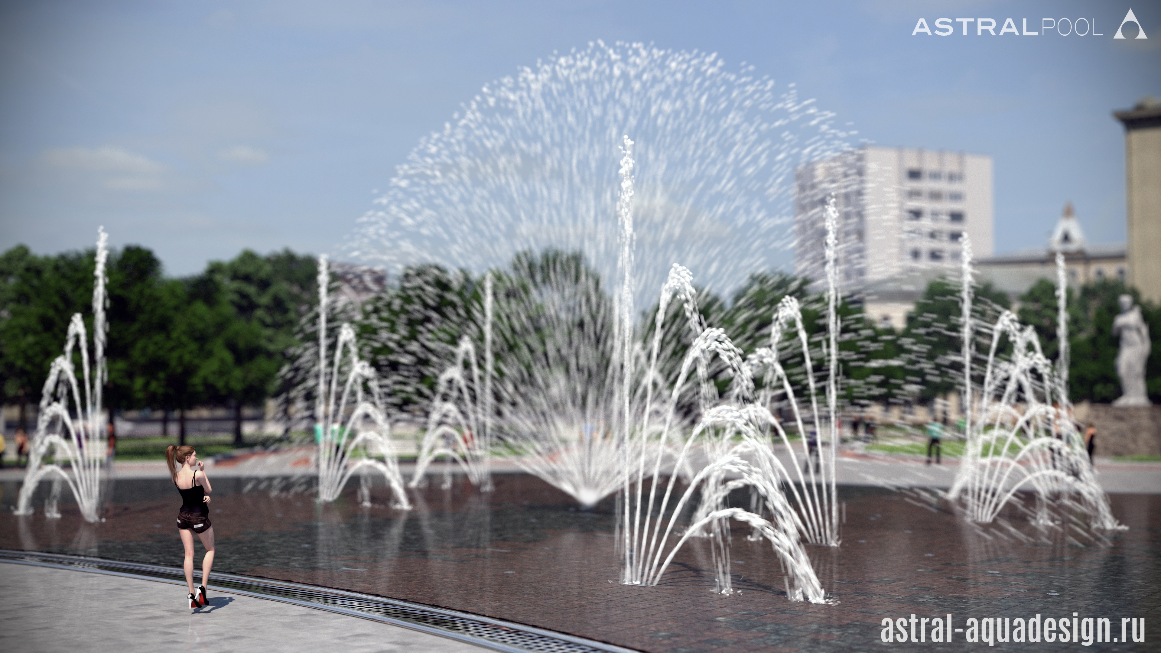 На этот раз, мы хотим представить вам очень интересный проект пешеходного фонтана с качающимися форсунками и туманными насадками. Композицию также дополняют многоструйный насадки и пенные, а также, так всем полюбившийся водный экран. Чаша необычной формы облицована особым нескользящим покрытием имитирующим гранит.