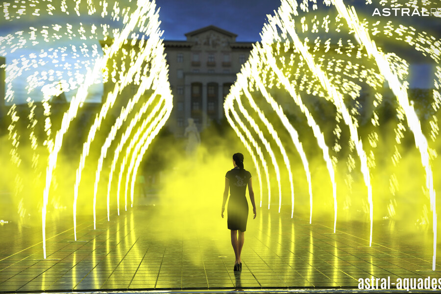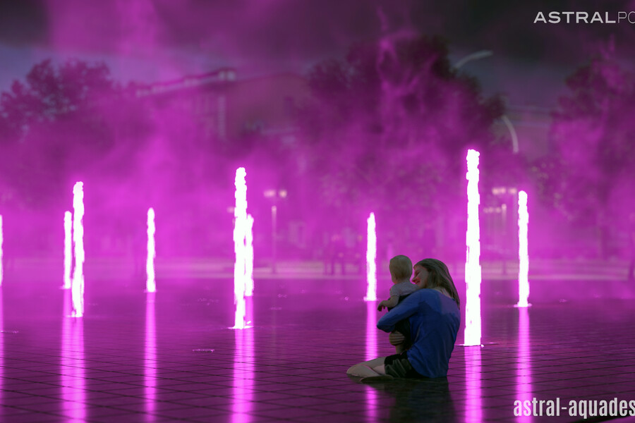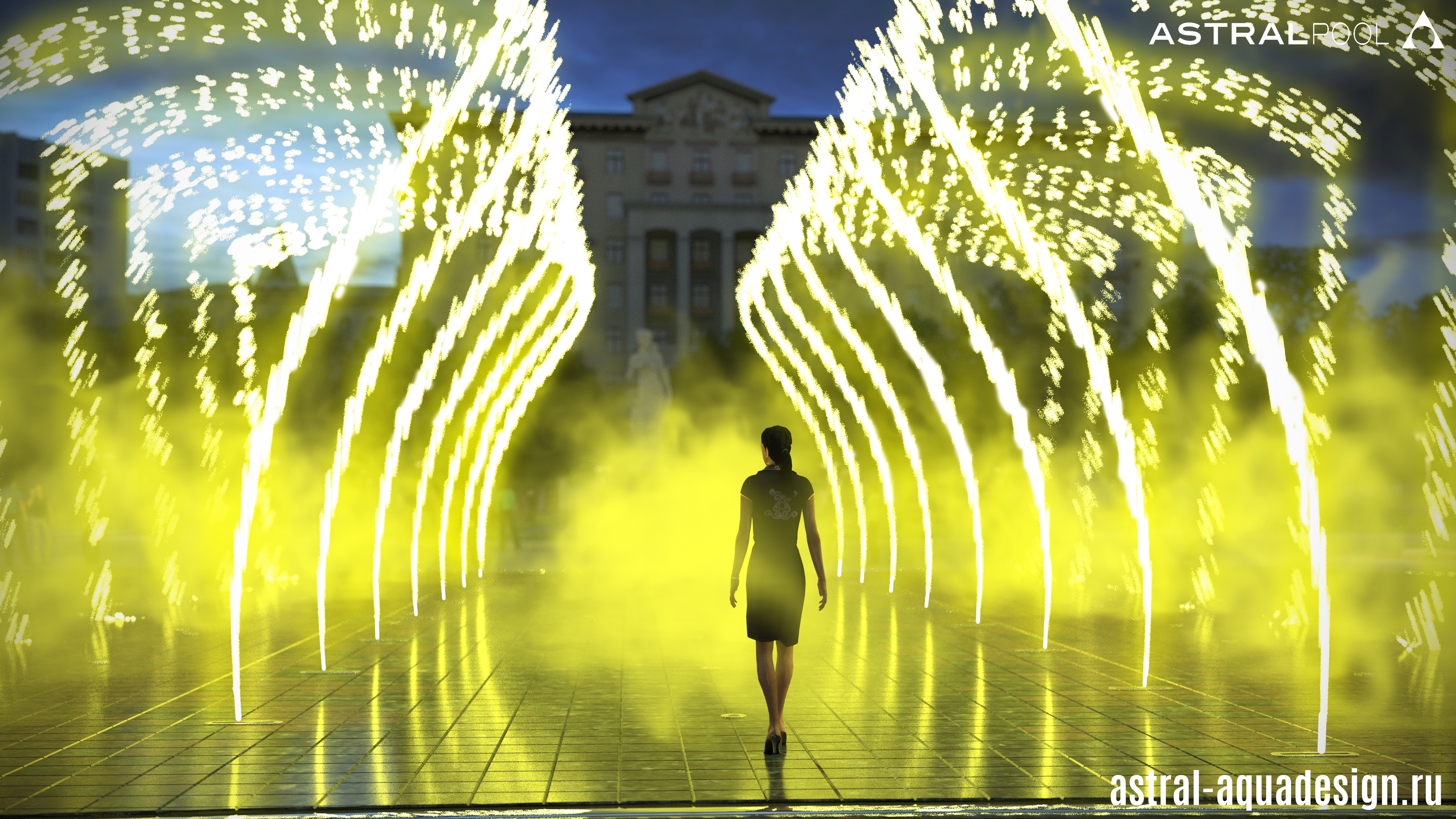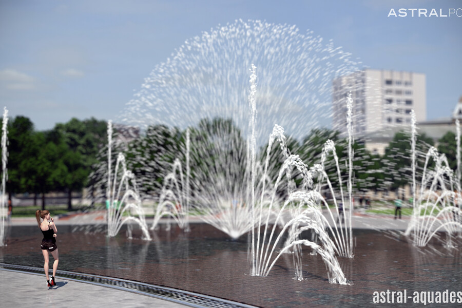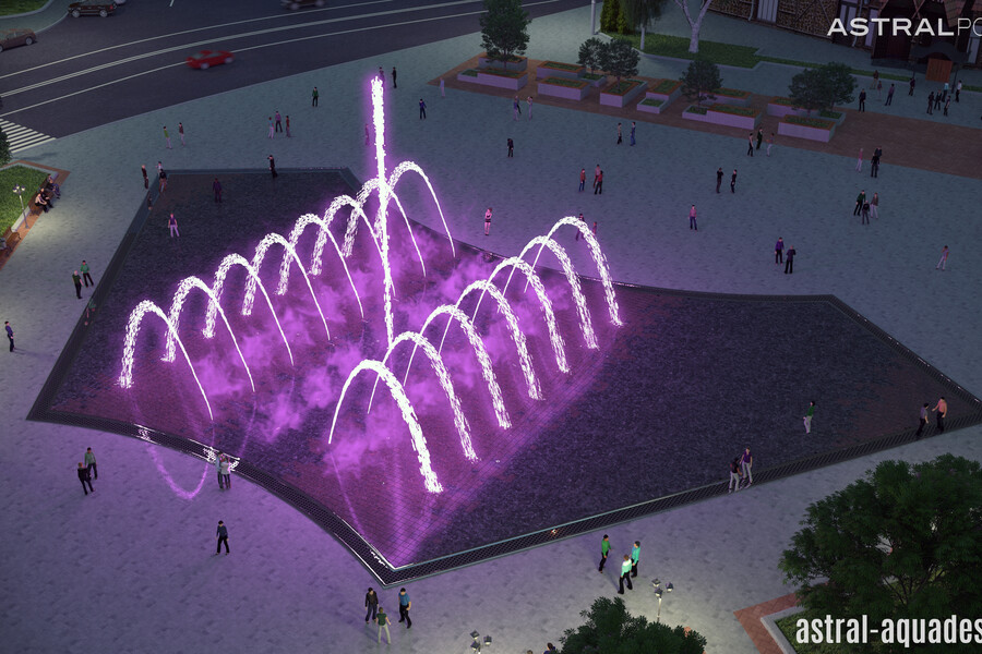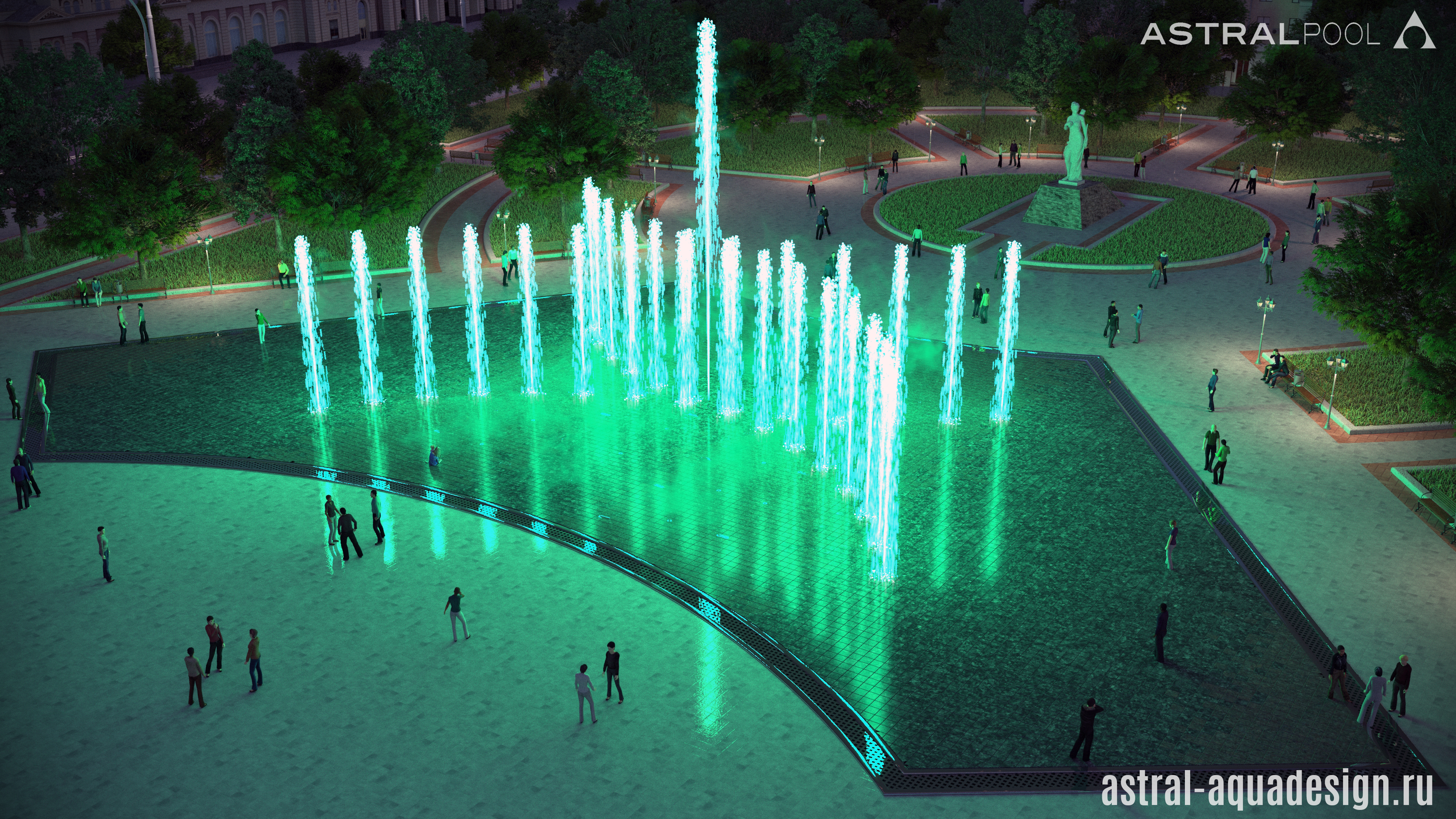 На этот раз, мы хотим представить вам очень интересный проект пешеходного фонтана с качающимися форсунками и туманными насадками. Композицию также дополняют многоструйный насадки и пенные, а также, так всем полюбившийся водный экран. Чаша необычной формы облицована особым нескользящим покрытием имитирующим гранит.