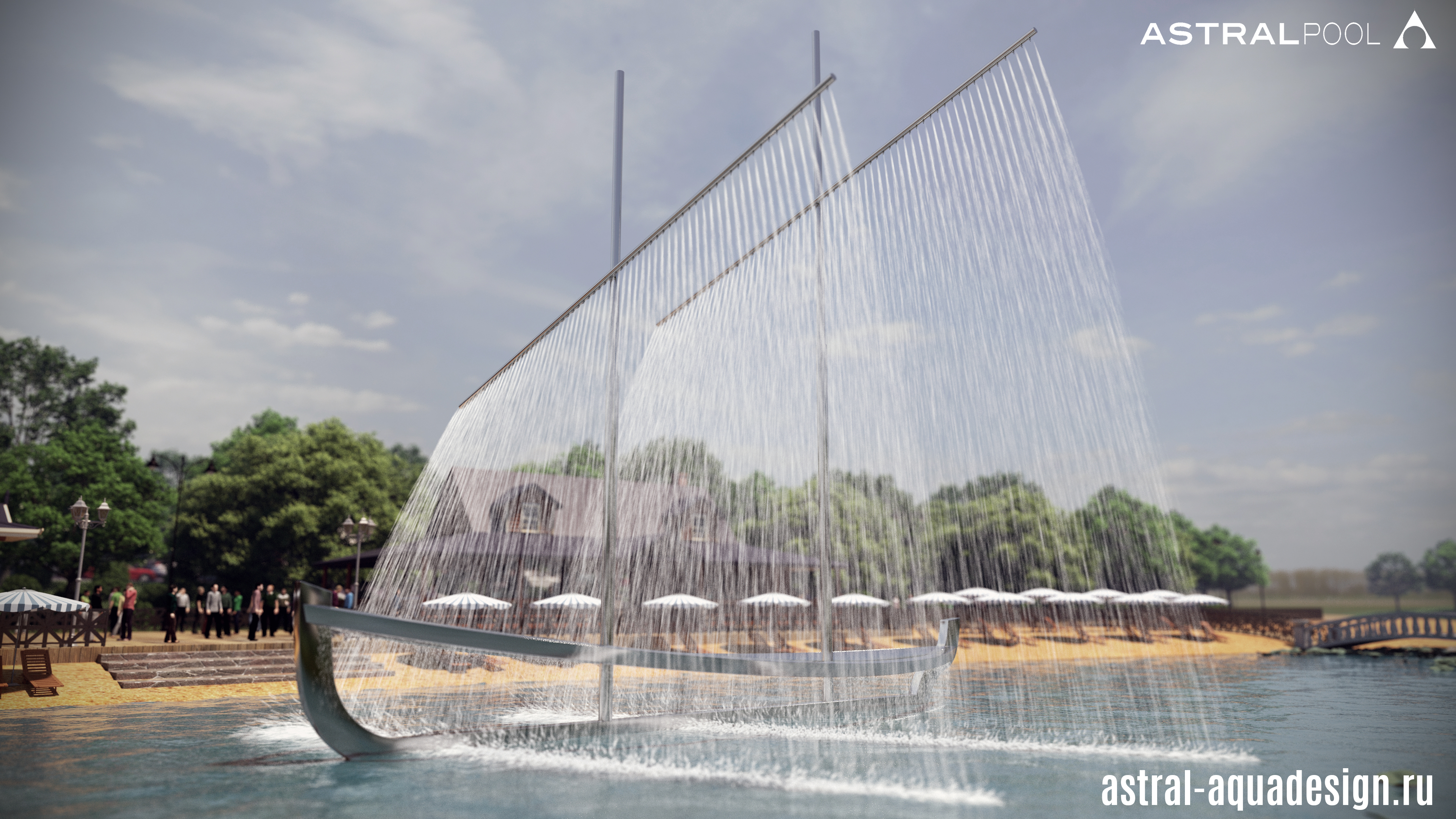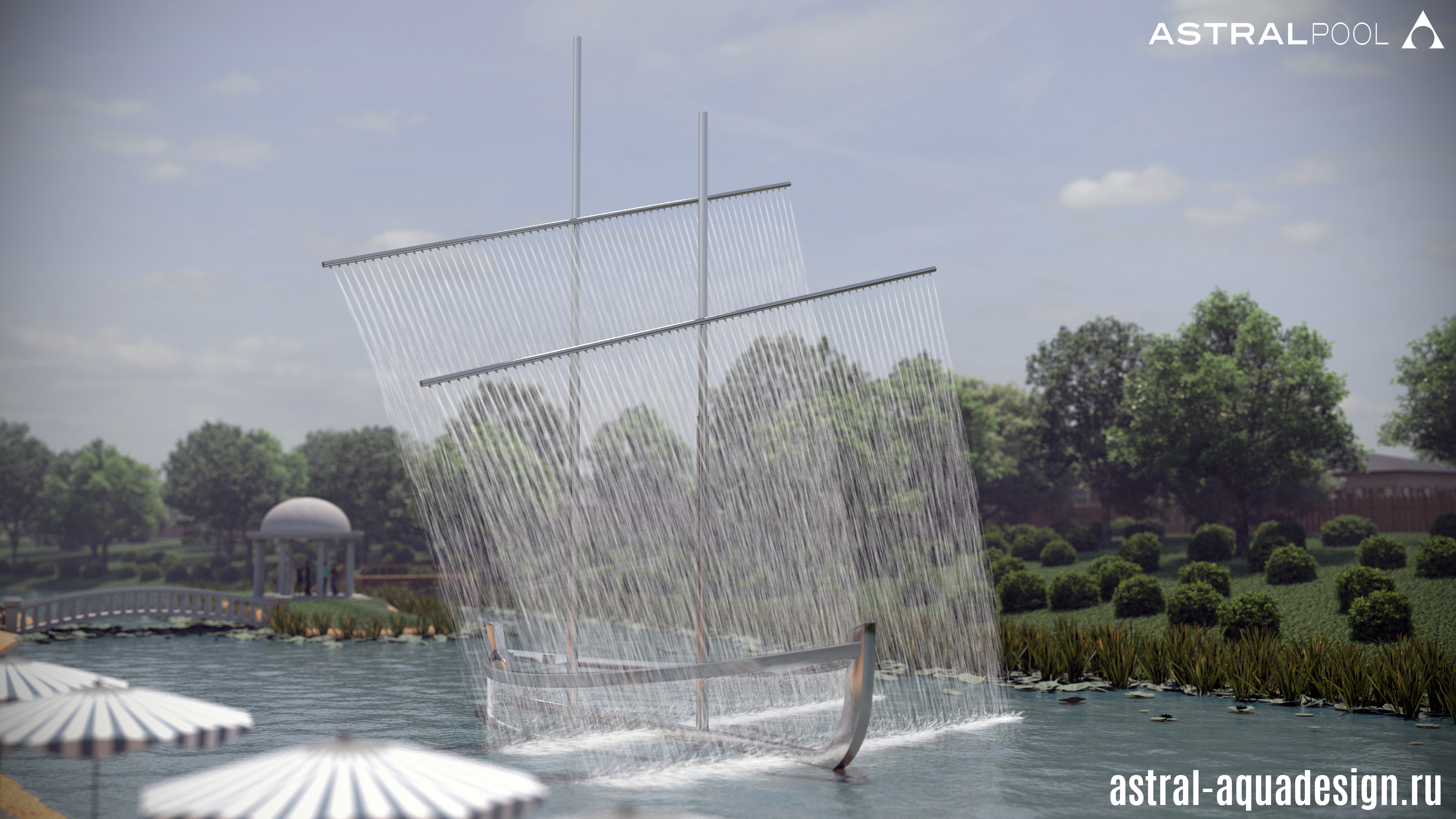 Очень креативный проект плавающего фонтанного комплекса «Корабль» разработали наши специалисты. Изящная композиция, выполненная из полированной нержавеющей стали стилизованная под двухмачтовый корабль эффектно выглядит в любом ландшафте. Две линейных Две линейных насадки создают великолепные паруса. Две линейных насадки создают великолепные паруса. Водные объекты такого типа часто строятся на набережных, но наш проект предполагает установку непосредственно в водоеме, что делает его уникальным.