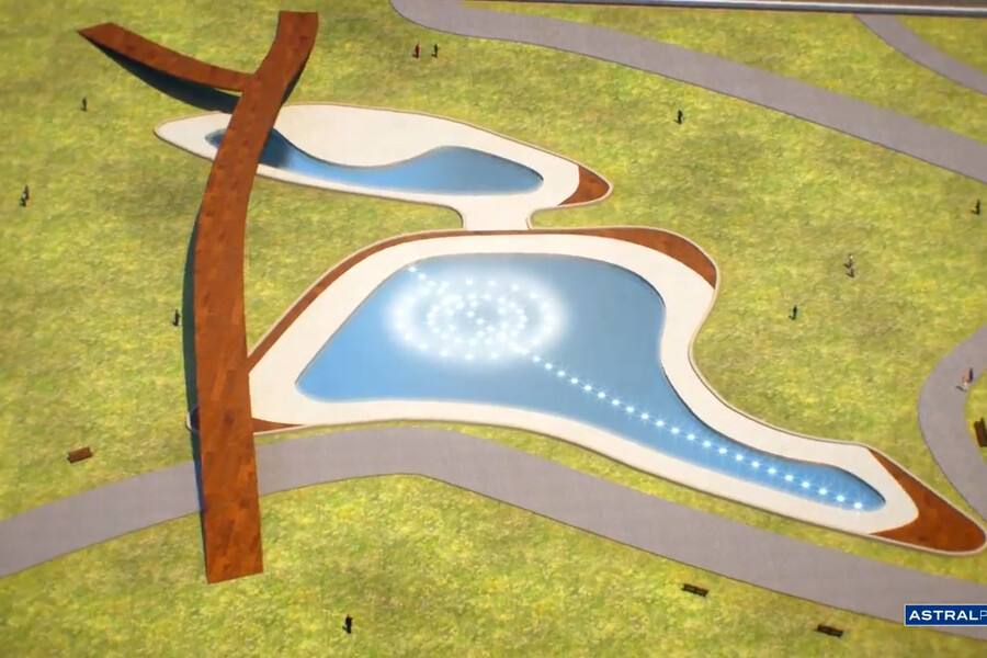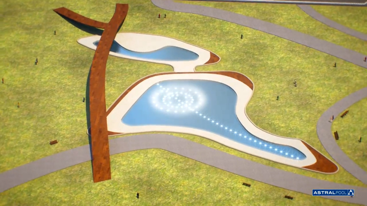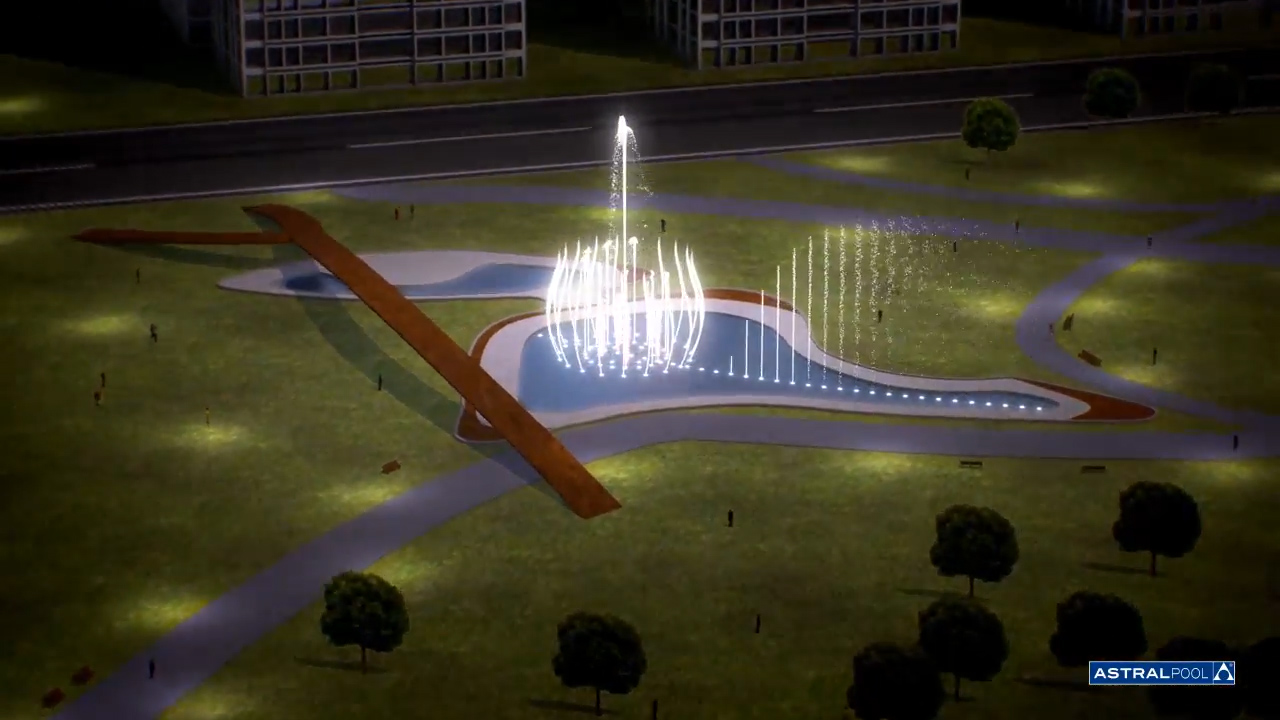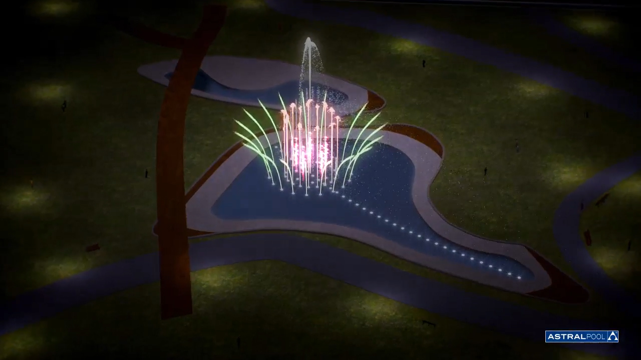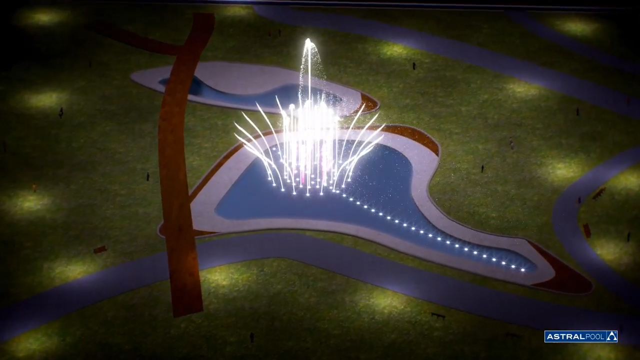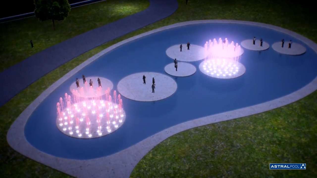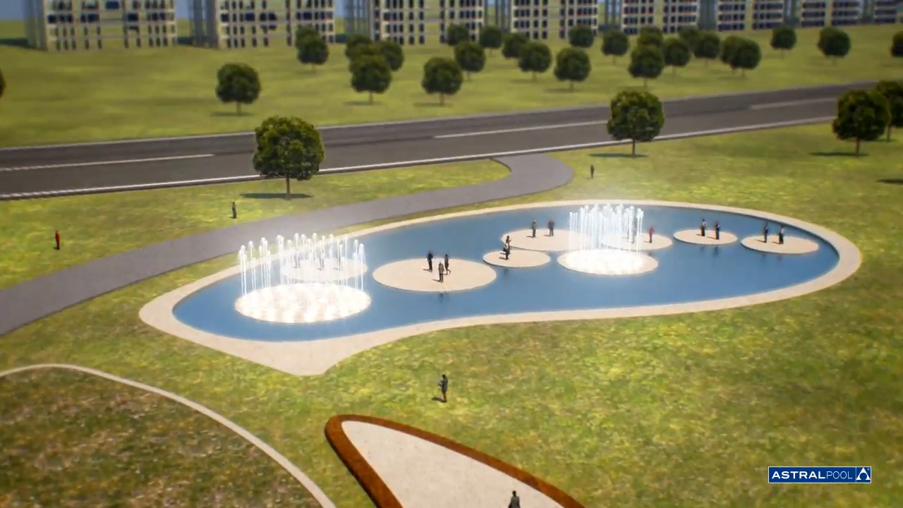 Этот проект включает в себя два водных объекта – водоем и цветомузыкальный фонтан. Его главной особенностью является применение огненных фонтанных насадок. Сочетание воды и огня никого не оставит равнодушным. Основу водной композиции создают качающиеся насадки, именно благодаря им, создается эффектная форма напоминающая раскрывающийся цветок. В центре планируется использование пенной насадки с мощной высокой струей. Дополнительный ряд струй образуют популярный узор «бегущая волна». Дизайнеры также предполагают создание пешеходной зоны рядом с водоемом. Возможно использование двух вариантов прогулочных маршрутов – над водоемом по мосту, либо по поверхности водоема используя специальные площадки.