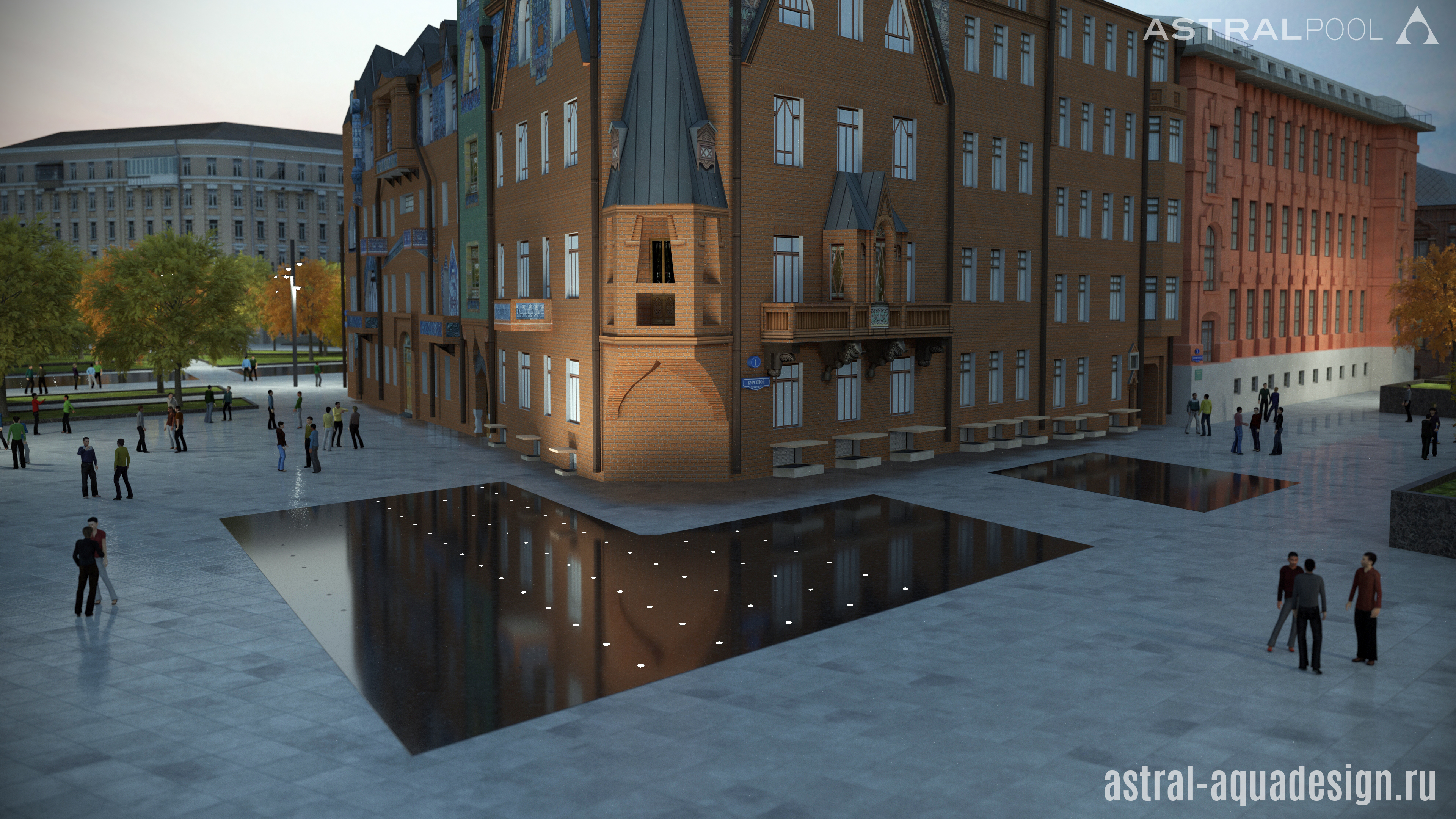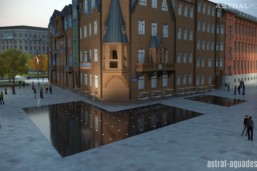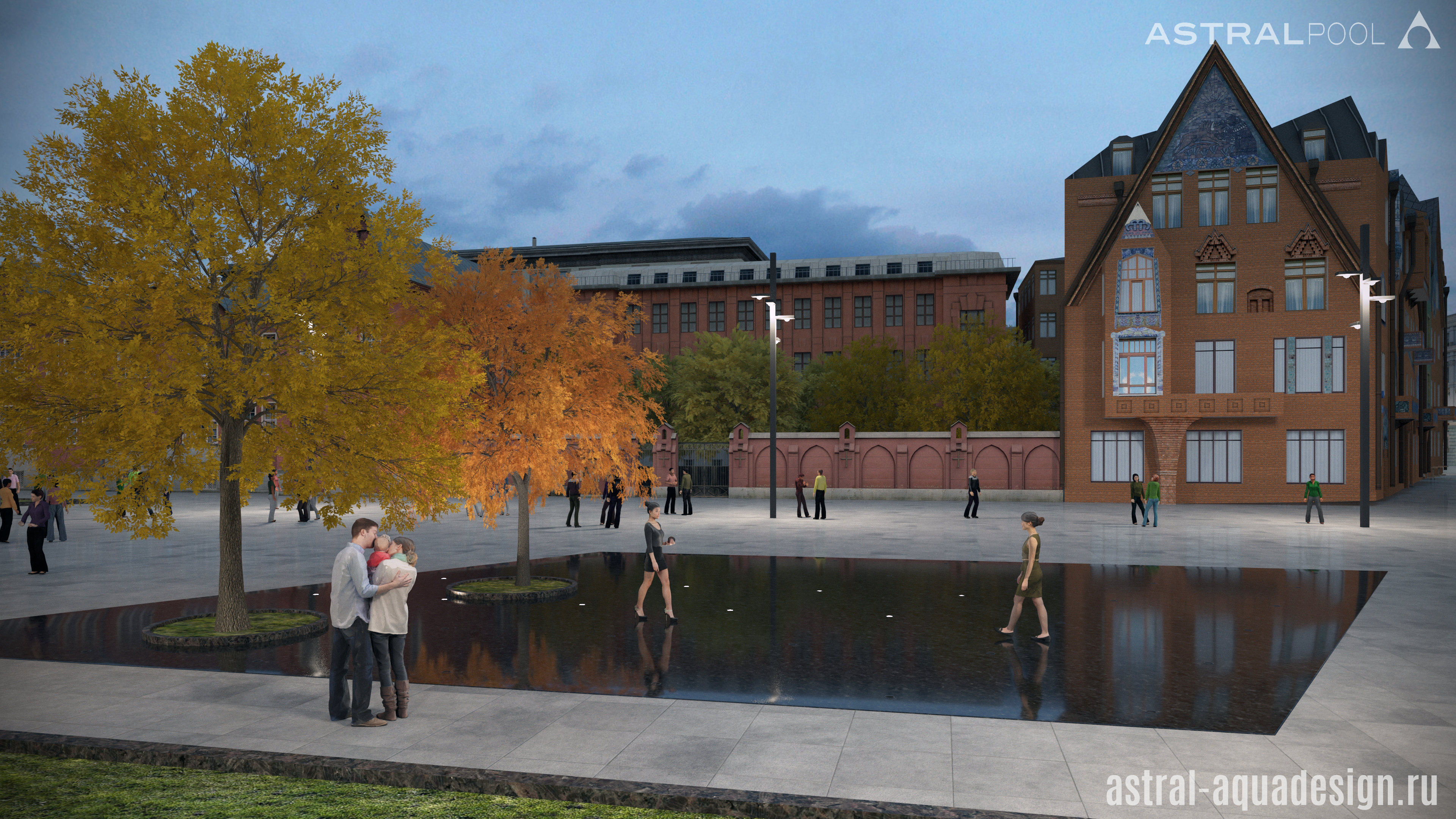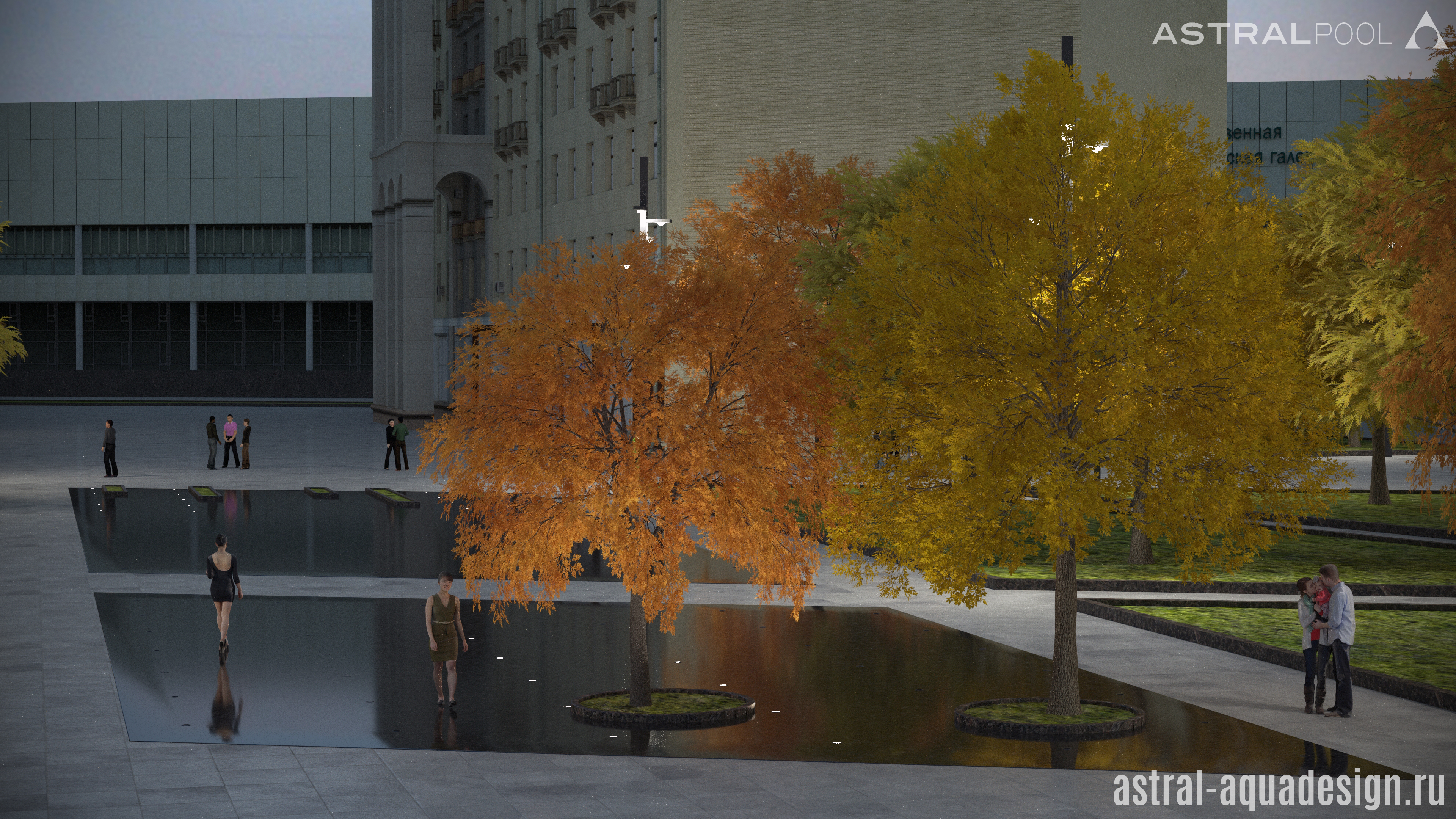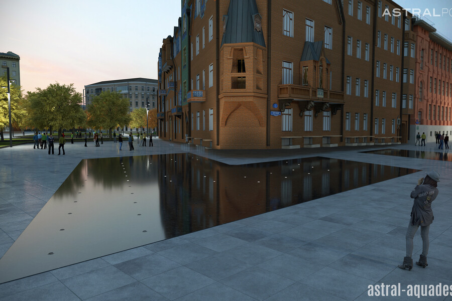 Проект зеркального водоёма был разработан для строительства на территории бизнес-парка в Тюмени. Такие довольно необычные водные объекты стремительно набирают популярность. Обычно их глубина не превышает 20 см, поэтому их иногда называют водоёмами малой глубины. Их основная функция — отражение зданий или окружающего ландшафта. Также они могут использоваться в качестве плескательного водоёма рядом с детской площадкой.