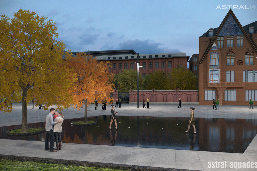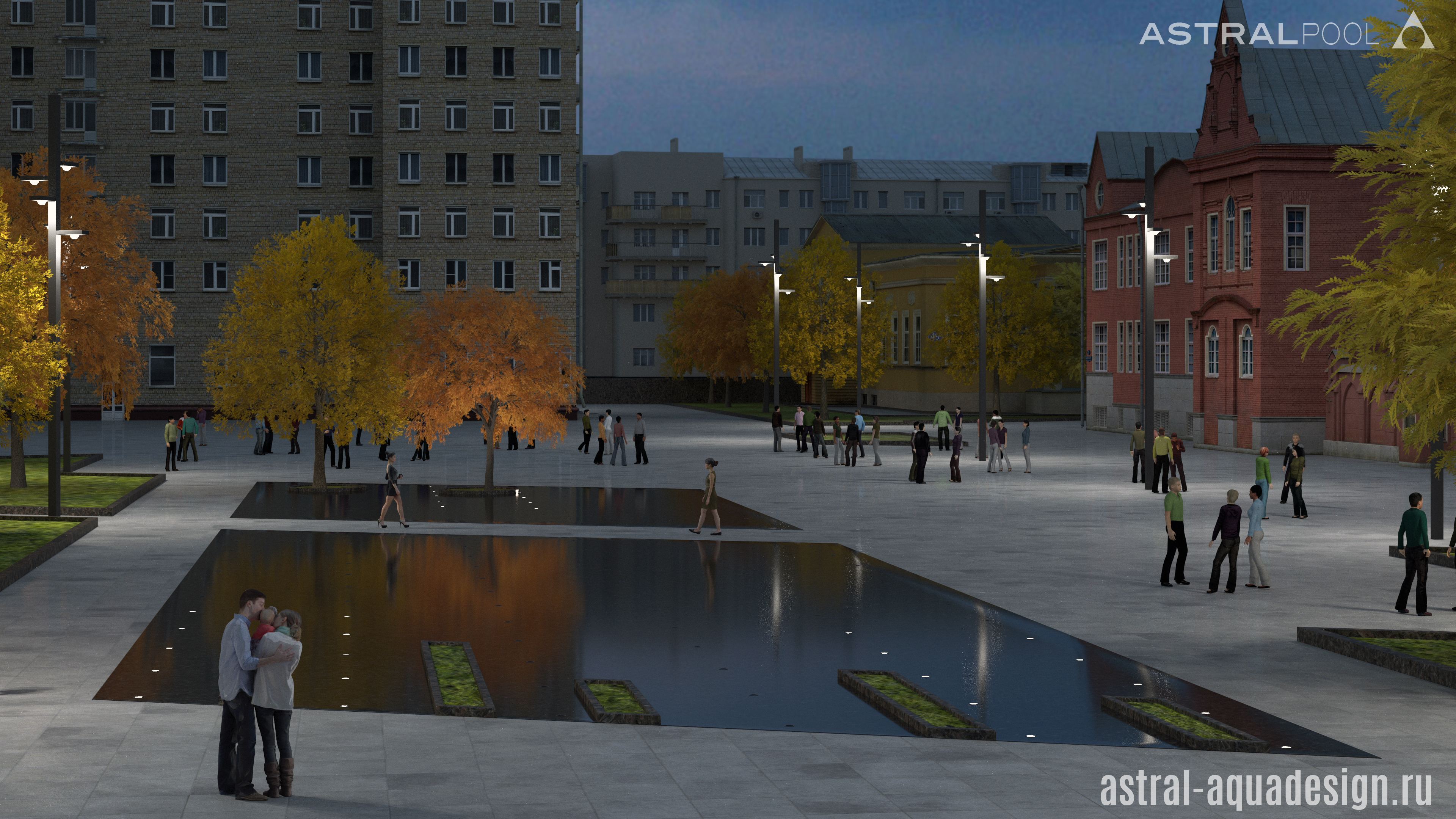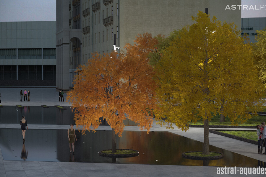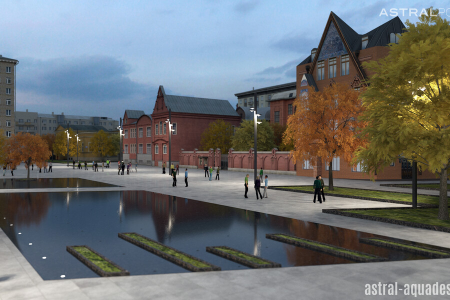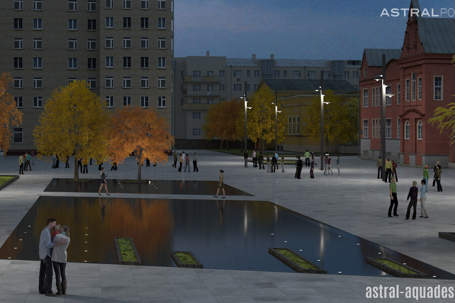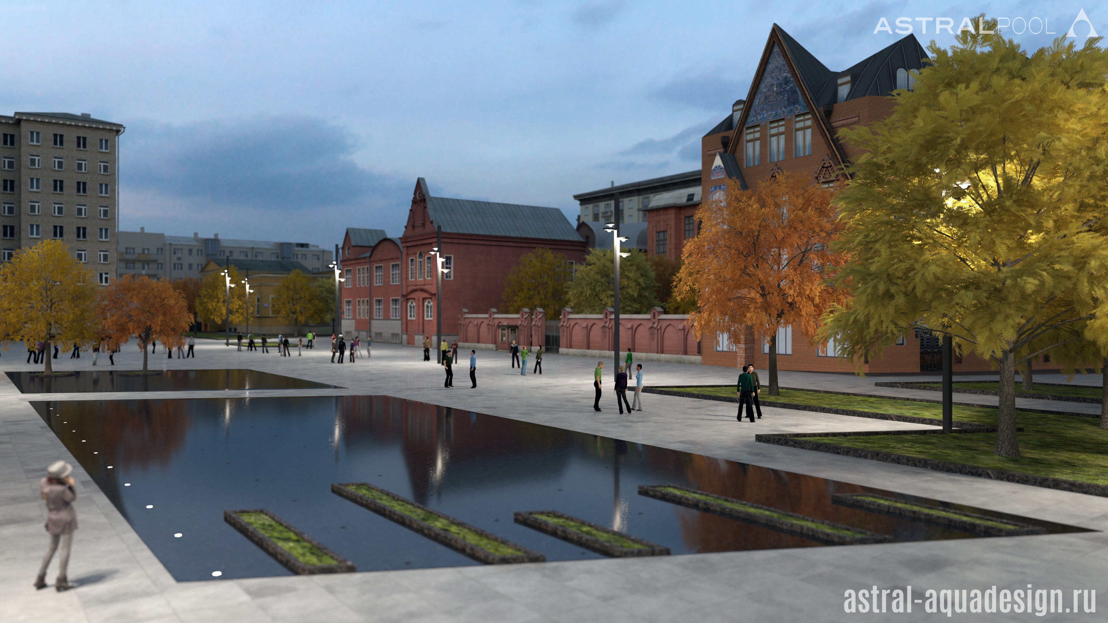 Проект зеркального водоёма был разработан для строительства на территории бизнес-парка в Тюмени. Такие довольно необычные водные объекты стремительно набирают популярность. Обычно их глубина не превышает 20 см, поэтому их иногда называют водоёмами малой глубины. Их основная функция — отражение зданий или окружающего ландшафта. Также они могут использоваться в качестве плескательного водоёма рядом с детской площадкой.