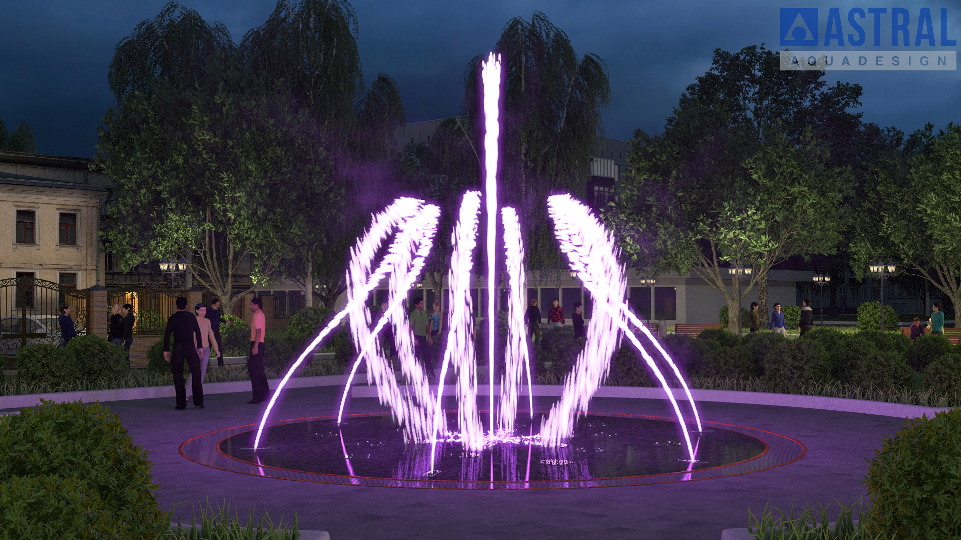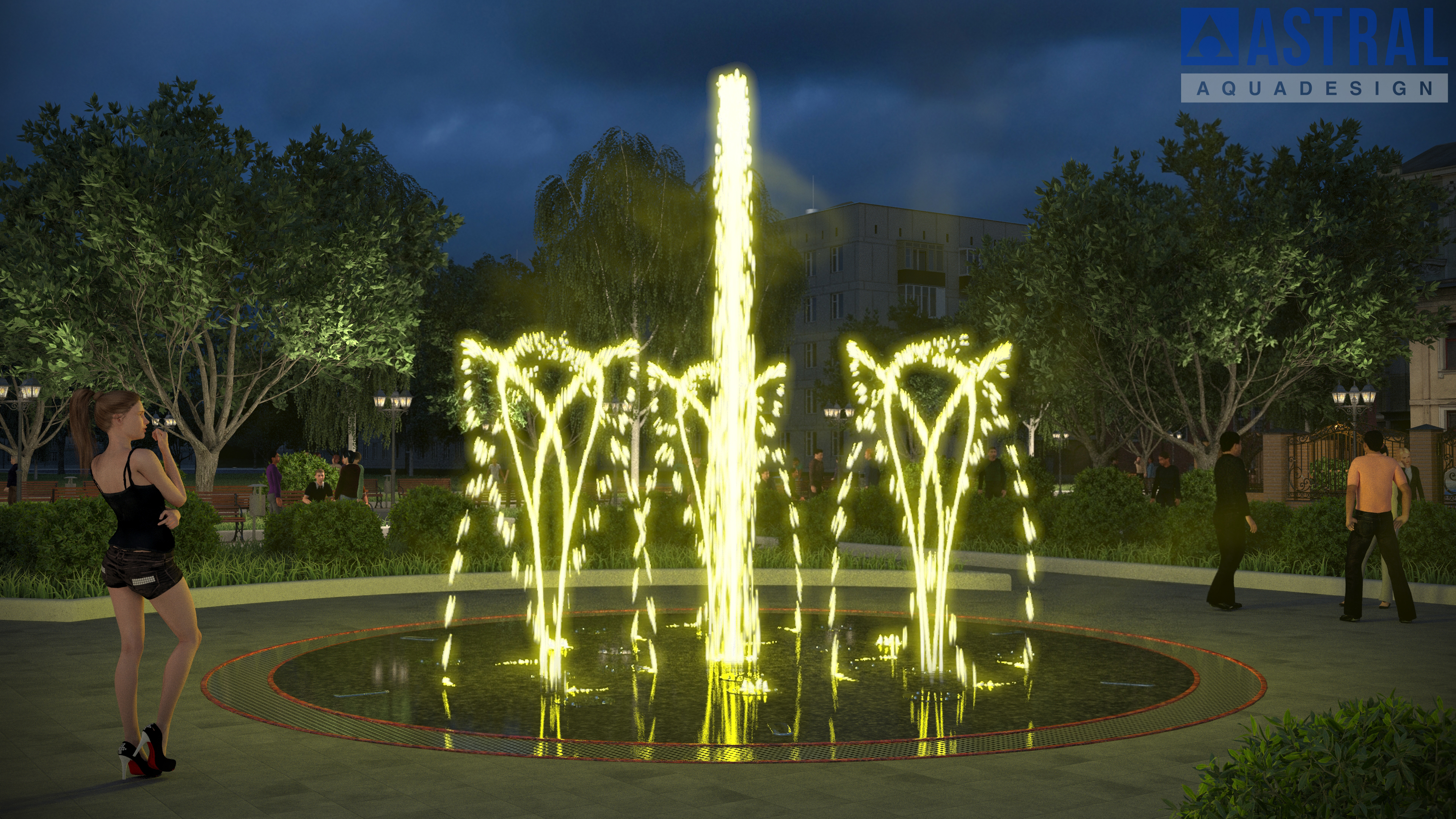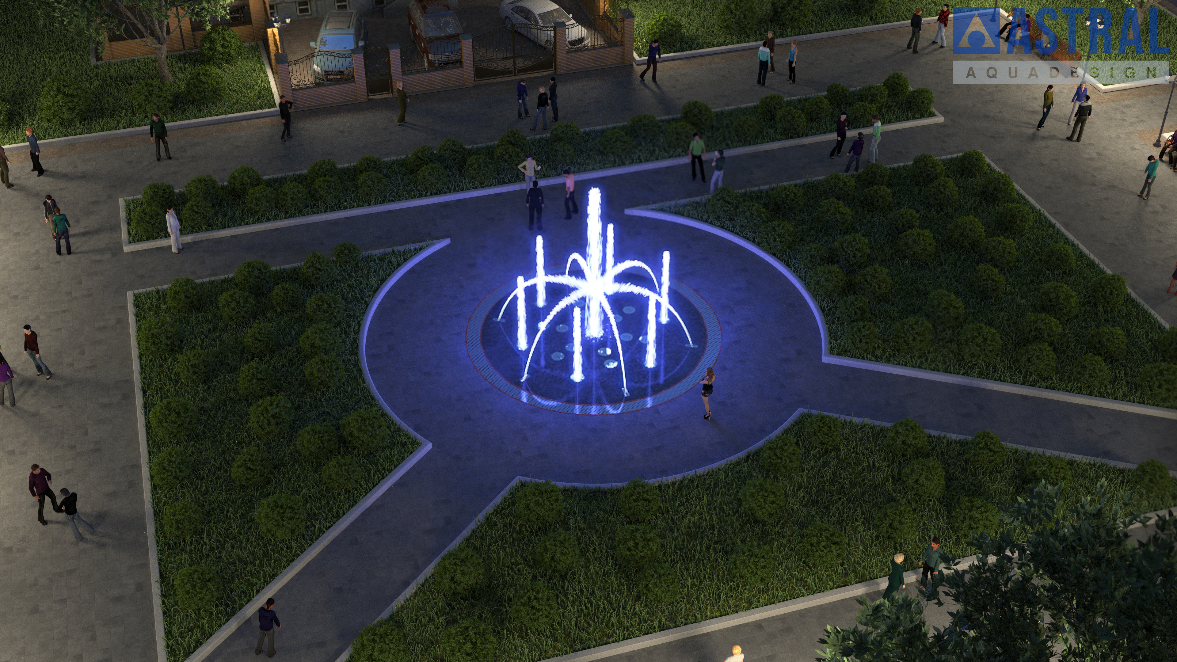 Множество видов насадок создают разнообразную водную композицию. Качающиеся и крутящиеся фонтанные насадки делают картину очень динамичной. Проект также предполагает установку туманных форсунок. Количество форсунок и их расположение рассчитано для чаши диаметром 7,8 метра.