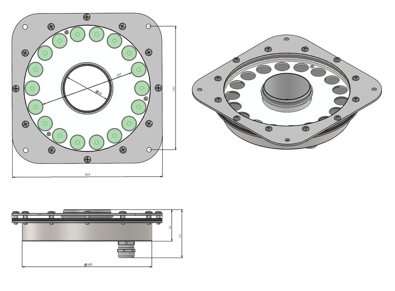 Этот подводный фонтанный прожектор - идеальное решение с точки зрения универсальности и исключительного освещения фонтанных струй. Astral Corona оснащен сверхъяркими мультикристальными диодами высокой мощности, невероятными технологиями и, прежде всего, отверстием диаметром 66 мм посередине корпуса для непосредственного монтажа форсунки в центре светильника. Таким образом, луч света точно следует за потоком воды под любым углом. При относительно невысокой потребляемой мощности, это идеальное соотношение цены и качества, когда речь идет об эффективном и при этом мощном освещении фонтана. Диаметр расстановки светодиодов в светильнике составляет 137 мм.