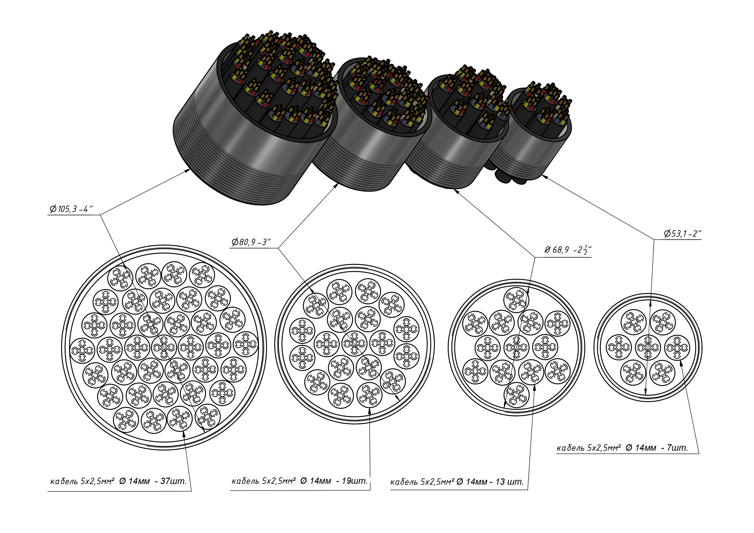 Резьбовые распаячные подводные коробки являются уникальным решением как для водонепроницаемого вывода кабеля из чаши фонтана, так и для подводного соединения нескольких проводов, и все в одном блоке. Корпус изготовлен из высококачественной коррозионностойкой нержавеющей стали AISI 304 и предлагает достаточно места для легкого электрического соединения и прокладка кабелей. Все модели имеют съемную крышку для более легкого доступа. Для бетона требуются закладные резьбовые патрубки соответствующего диаметра и подключения с наружной или внутренней резьбой, которые обеспечат безопасное и герметичное соединение непосредственно на трубы для защиты кабеля. По запросу изготавливаем любые распаячные коробки для фонтанов по диаметрам, длинам, конфигурациям, количеству и сечению кабелей и присоединениям.