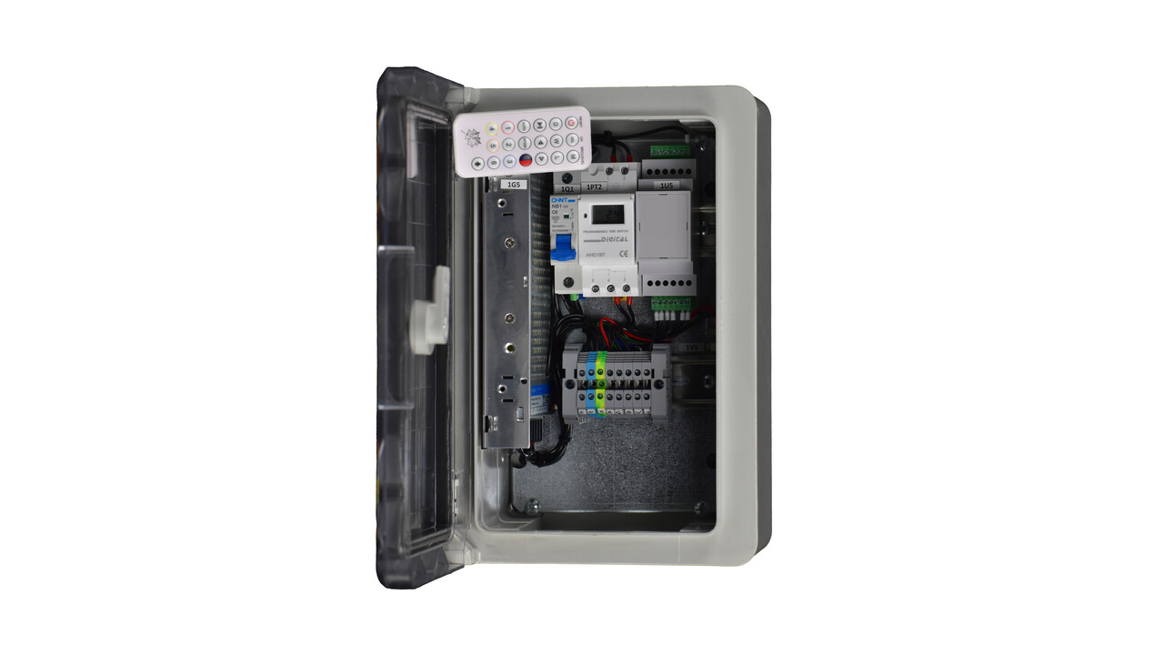 Комплектация шкафа: блок питания 200Вт/12В/DC, контроллер универсальный RGBW/RGB PWM, таймер, автомат, пульт ДУ.