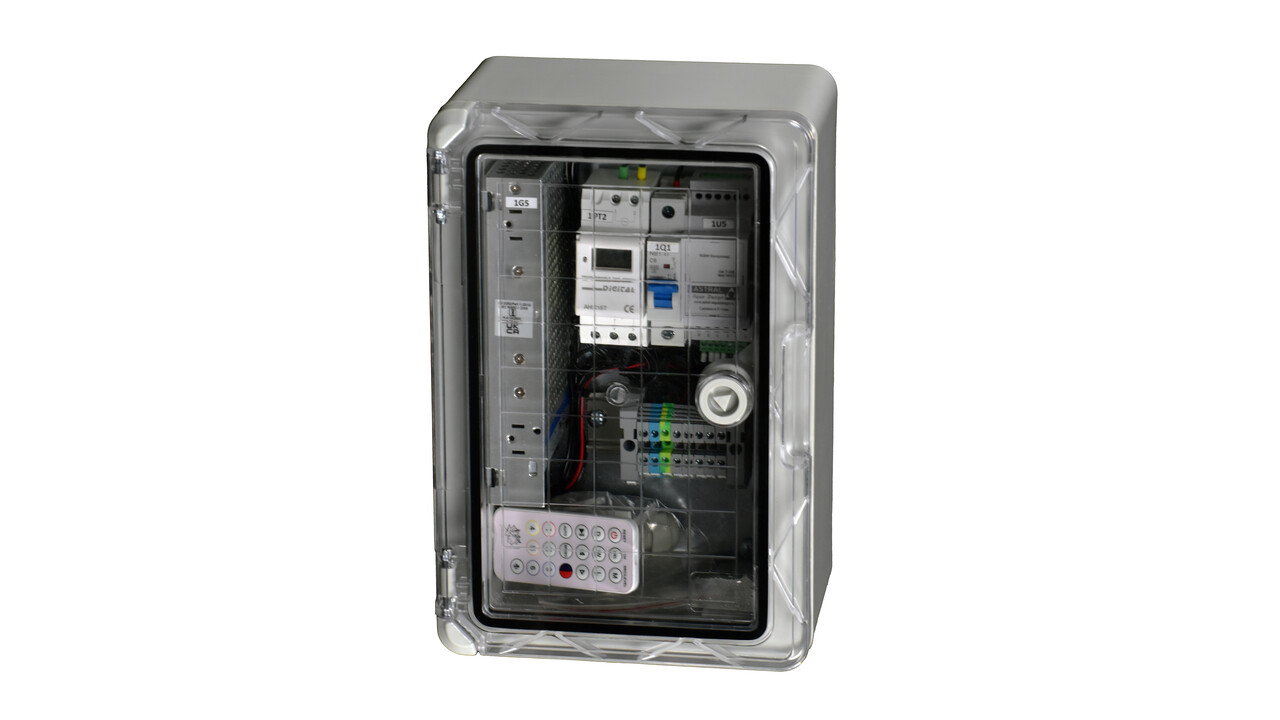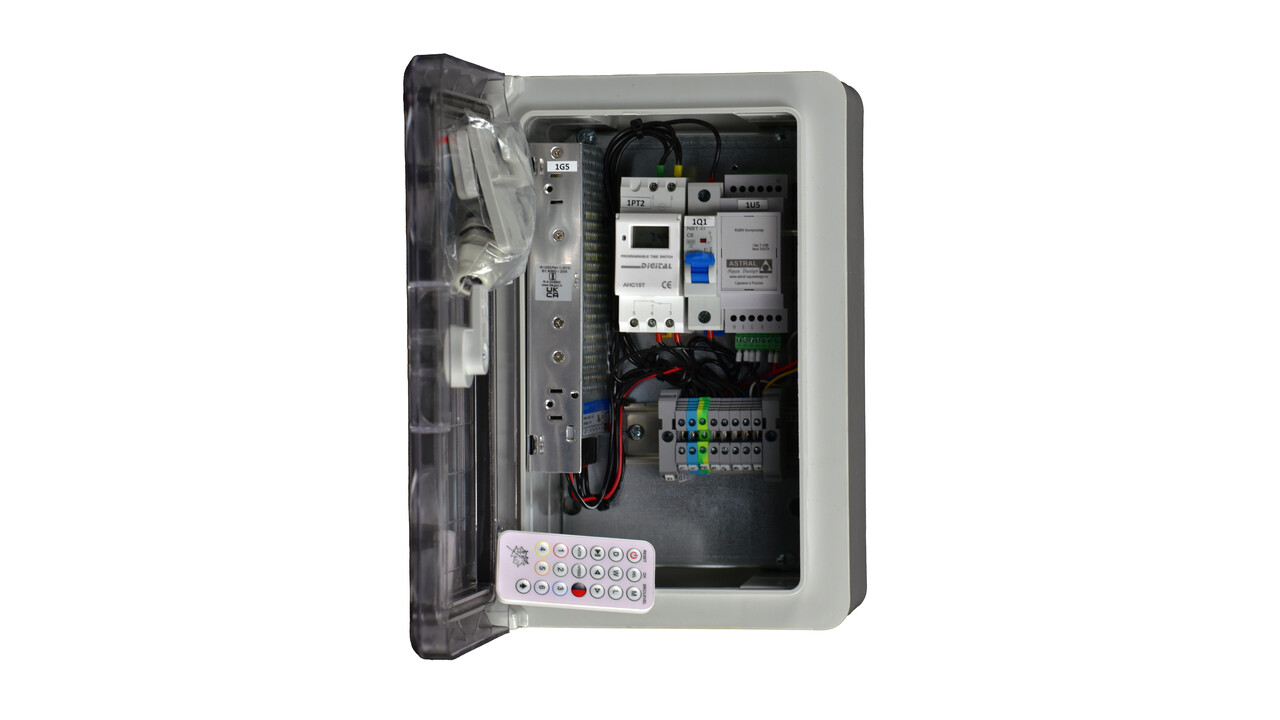 Комплектация шкафа: блок питания 200Вт/24В/DC, контроллер универсальный RGBW/RGB PWM, таймер, автомат, пульт ДУ.
