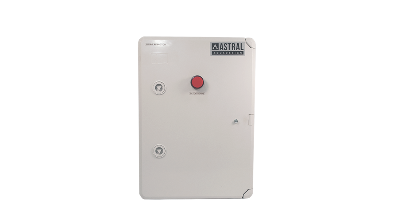 Шкаф управления Aquastop является стандартным изделием для подключения электродного датчика, крана с электроприводом 25Вт/220-24В/AC-DC и образует систему защиты технического помещения от затопления. По сигналу электродного датчика о превышении уровня воды в техническом помещении до критического, реле закрывает кран с электроприводом смонтированном на линии подачи воды в техническое помещение. Одновременно подается сигнал в шкаф управления фонтаном для его отключения, так же работа шкафа Aquastop блокируется. После устранения аварии необходимо выключить шкаф Aquastop и включить заново, реле подаст сигнал на открытие крана с электроприводом и он откроется. Для обеспечения бесперебойной работы рекомендуется использовать электропривод крана со встроенным аккумулятором либо применить UPS для питания шкафа.