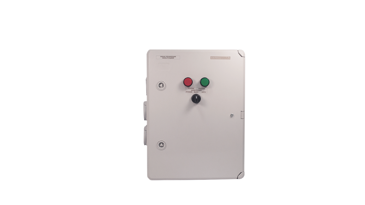 На дверце шкафа расположены сигнальные лампы: авария и работа, 3-х позиционный переключатель: ручной - выкл. - авто.