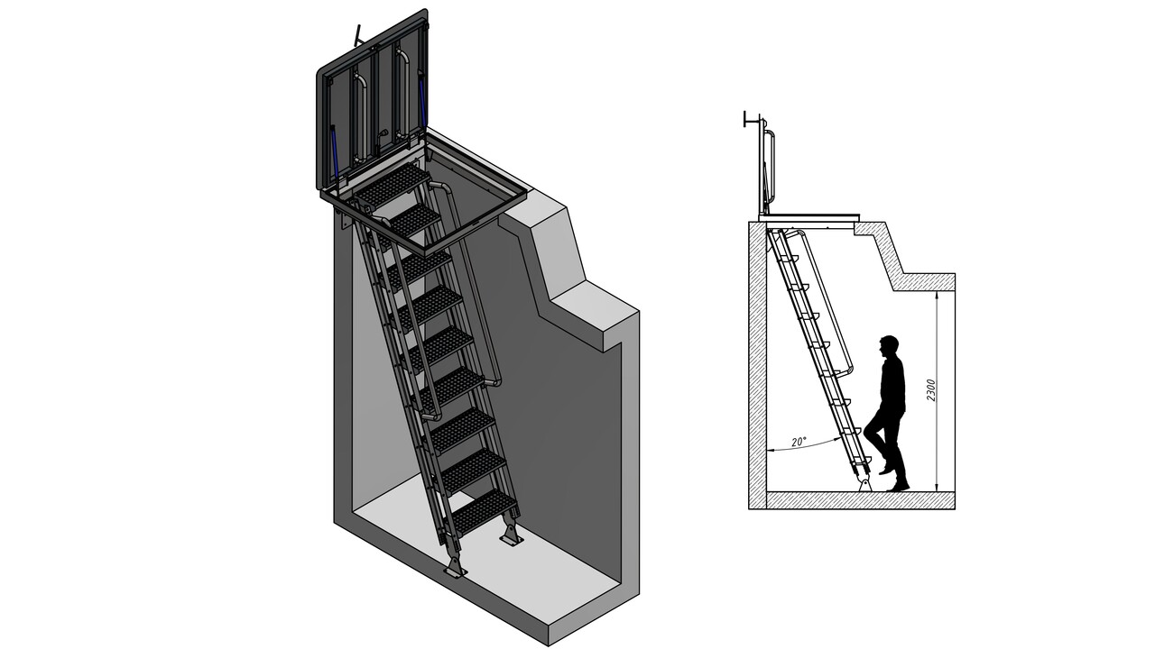 Инженеры нашей компании разработали модельный ряд лестниц для подземного технического помещения фонтана. Лестницы рассчитана на помещение с высотой шахты ль 240 до 390 см. Предусмотрена ширина ступени и наклон, достаточные для безопасного обслуживания фонтана. Лестница снабжена поручнем и устройством для регулировки угла наклона.