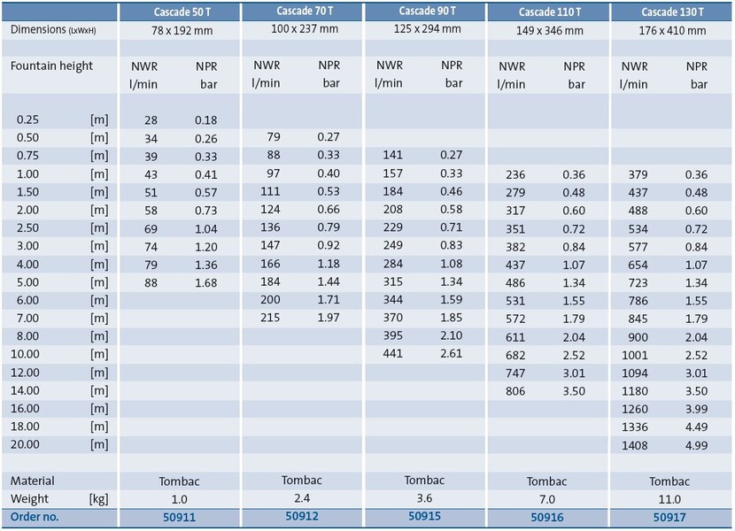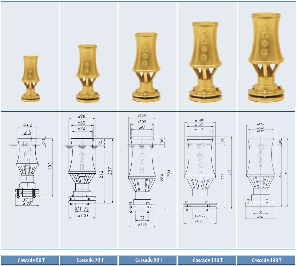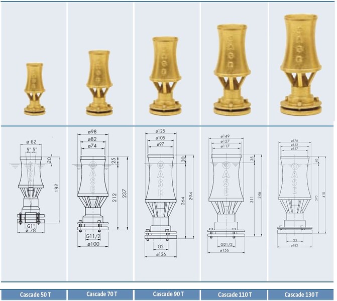 Cascade является одной из наиболее распространенных форсунок, которая активно используется в архитектурных фонтанах. Если она смонтирована согласно рекомендованному уровню воды, указанному производителем, то на выходе генерируется очень красивый конус вспененной воды чем-то напоминающий силуэт новогодней елки. Насадка Cascade укомплектована шаровым соединением для регулировки угла наклона.