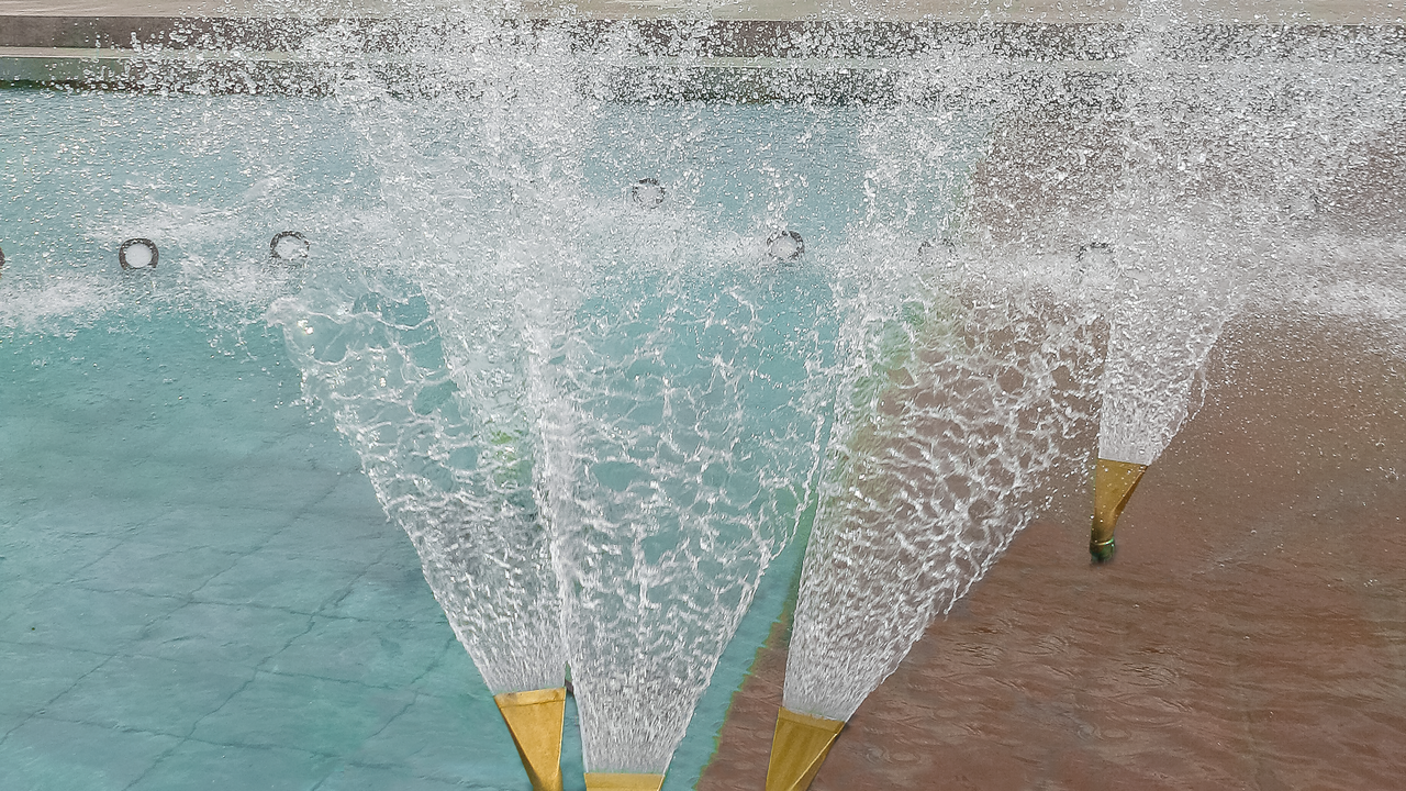 Эта насадка создает узкую пленку воды, которая при выходе из сопла постепенно расширяется по параболической траектории. Fan jet обычно используется в уличных фонтанах и водоемах в сочетании с другими струями.