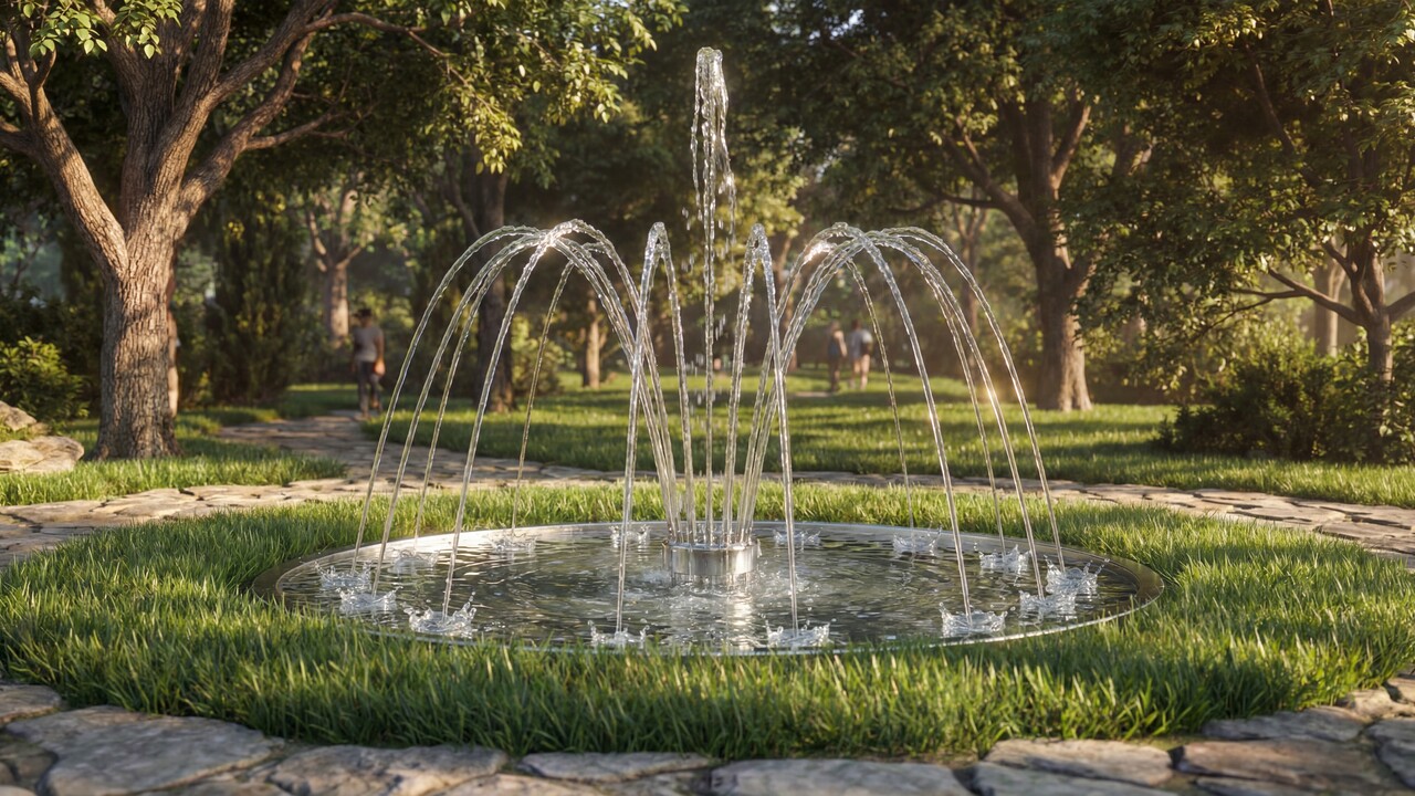 Фонтанная насадка серии Bouquet образует водную картину из центральной вертикальной и «кольца» периферийных струй, что обеспечивает красивый и хорошо видимый с любой стороны эффект. Такая форсунка при монтаже не требует отдельного шарового соединения для установки ее в вертикальном положении, т.к. все сопла имеют собственную регулировку угла наклона. Также за счет этого можно наклонить периферийной «кольцо» из струй в пределах 20º и создать свой индивидуальный рисунок фонтана.