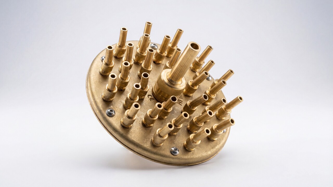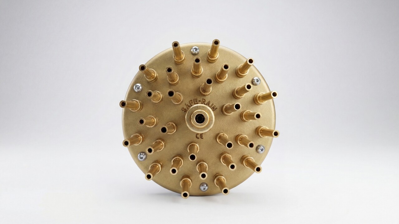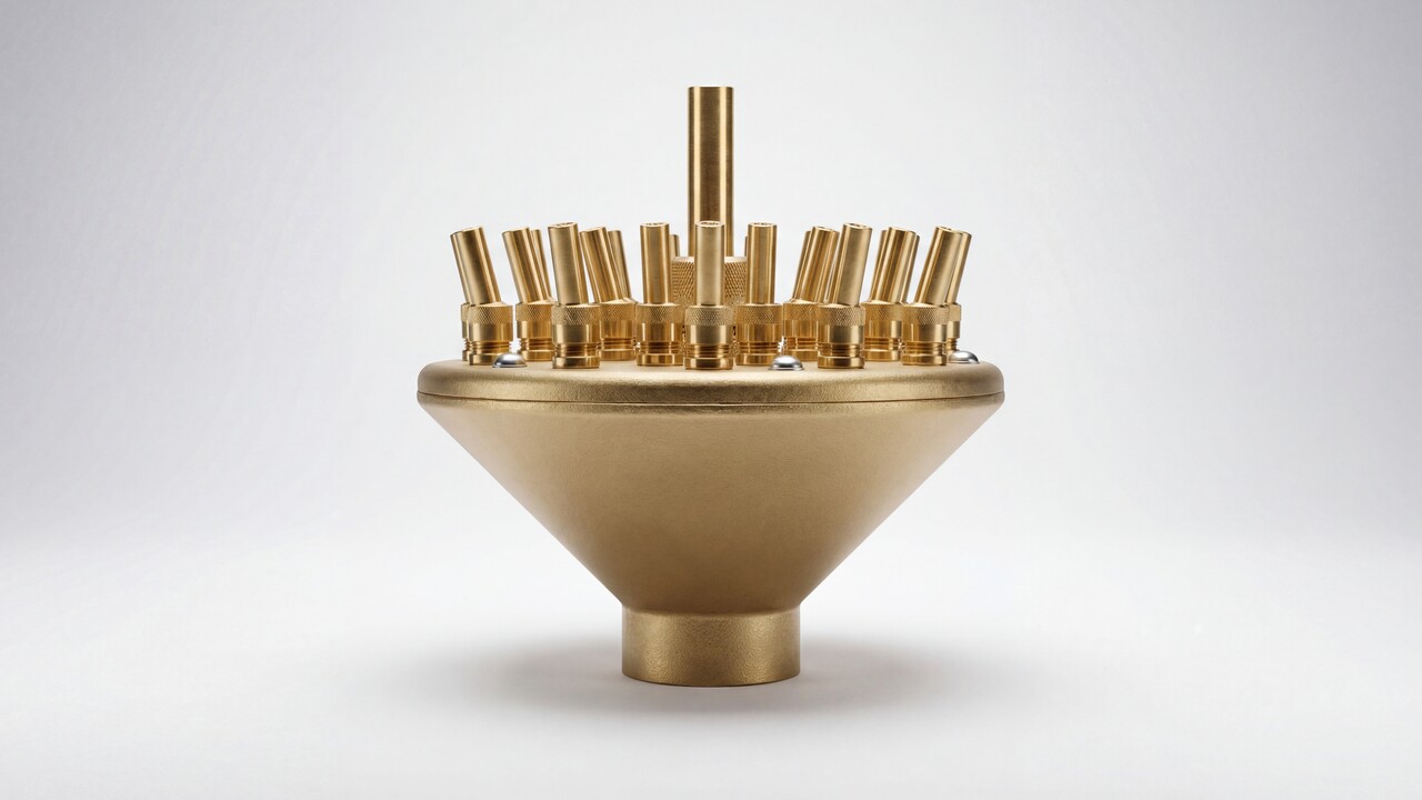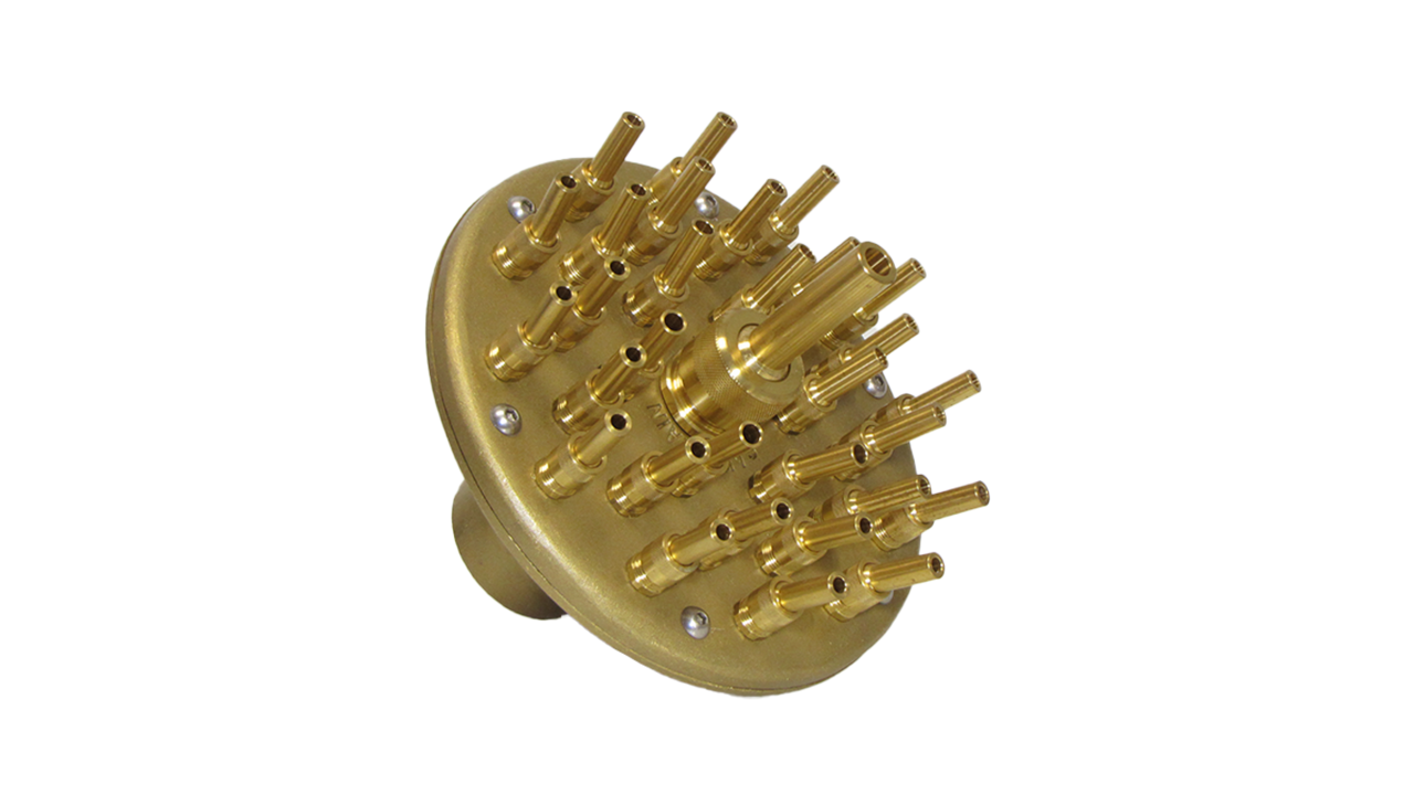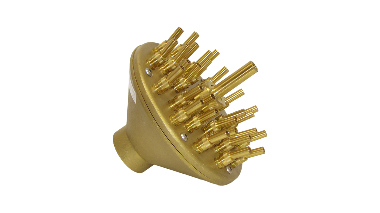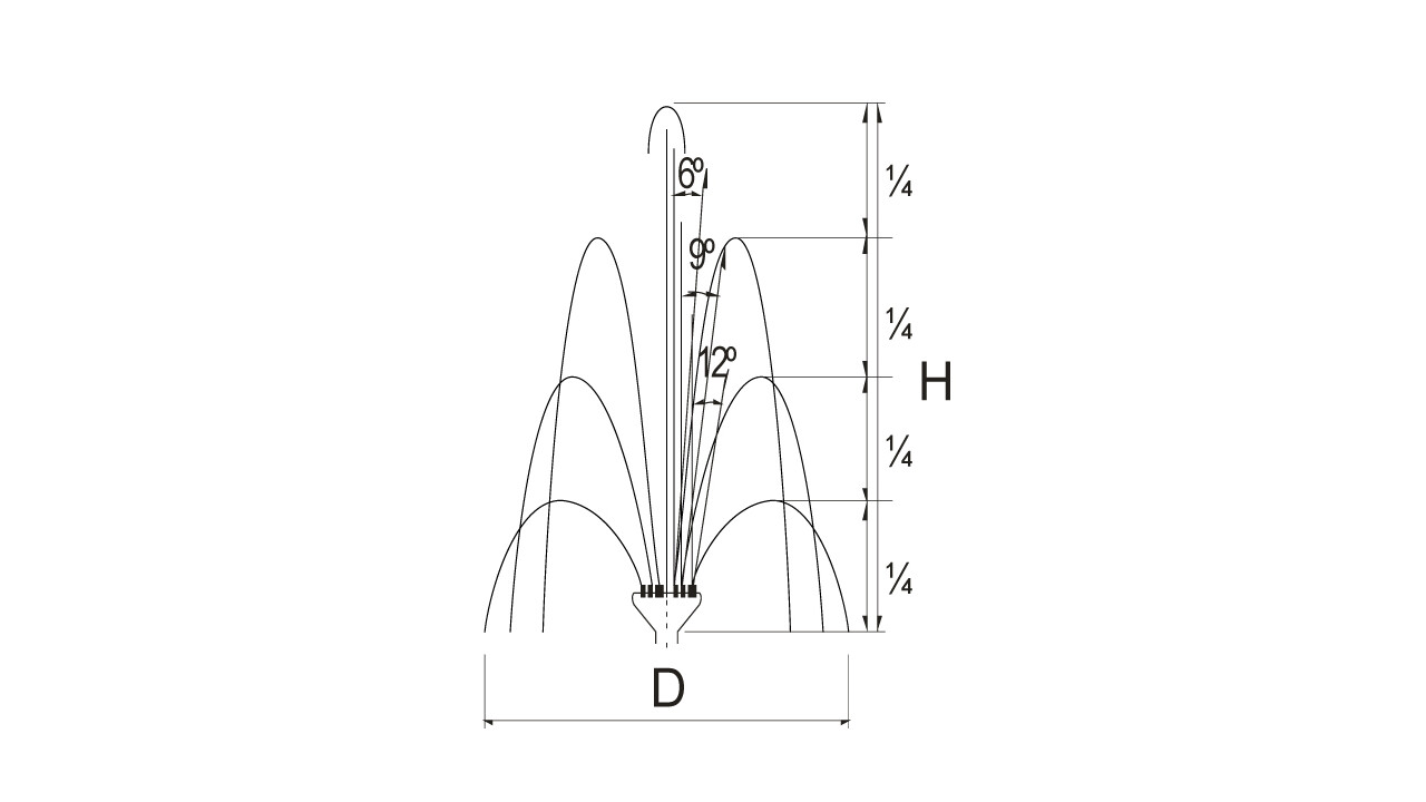 Насадка для фонтана Crown Special состоит из отдельных сопел установленных таким образом, что создается рисунок из струй воды на разной высоте и под разным углом наклона. Конструкция форсунки имеет встроенный распределитель потока для получения эффектной многоуровневой водной картины в виде цветка или букета. Такая форсунка при монтаже не требует отдельного шарового соединения для установки ее в вертикальном положении, т.к. все сопла имеют собственную регулировку угла наклона. За счет этого можно наклонить периферийные сопла, в значимости от модели форсунки, в пределах от 12º до 18º и создать свой индивидуальный рисунок фонтана.