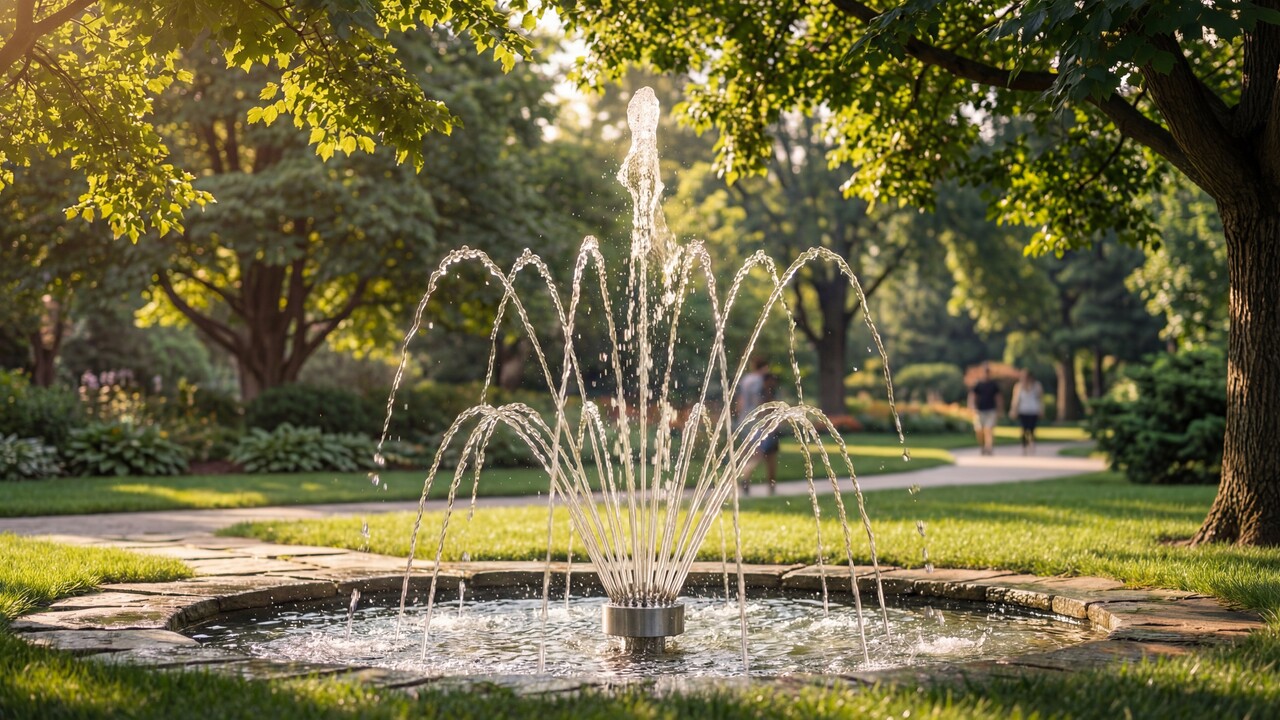 Насадка для фонтана серии Fleur de lis образует водную картину из центральной вертикальной и двух «колец» периферийных струй, что обеспечивает красивый и хорошо видимый с любой стороны эффект водного цветка. Такая форсунка при монтаже не требует отдельного шарового соединения для установки ее в вертикальном положении, т.к. все сопла имеют собственную регулировку угла наклона. Также за счет этого можно наклонить периферийные «кольца» из струй в пределах 20º и создать свой индивидуальный рисунок фонтана.