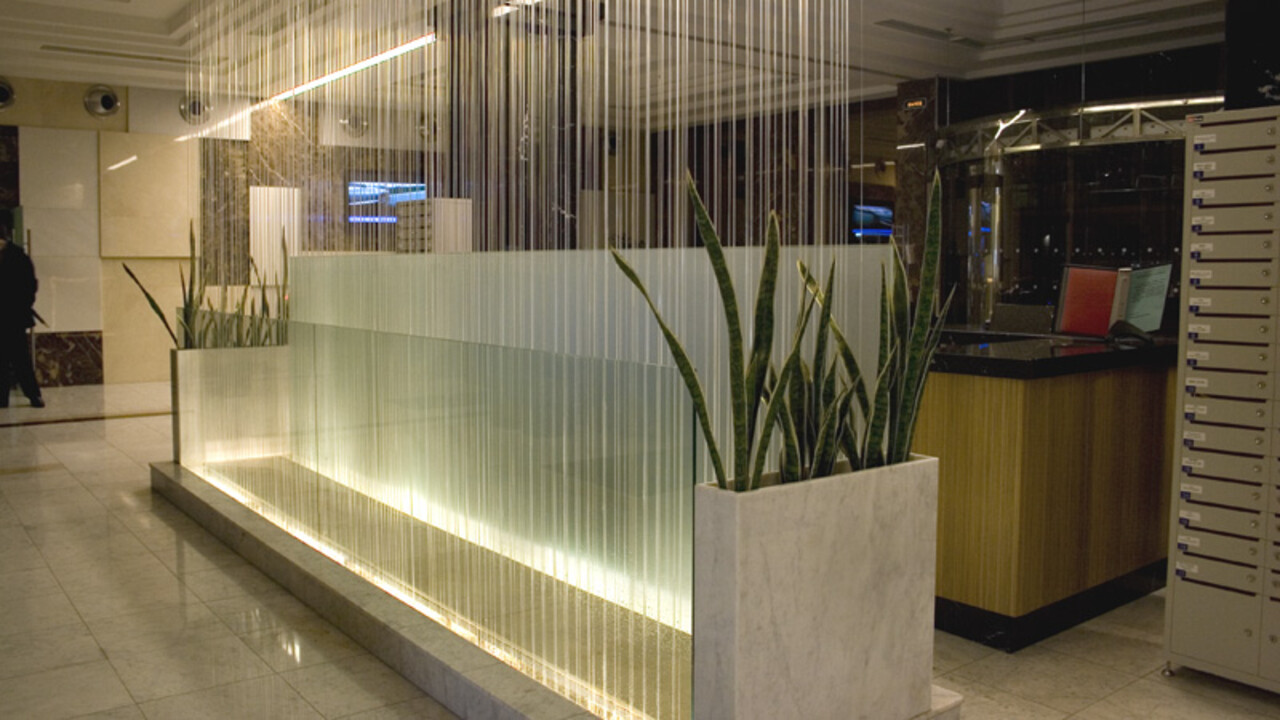 Вода сверху непрерывно течет через форсунку по леске, которую можно установить даже под углом 15º без отрыва капель от нее. На другом конце майларовой лески крепится специальный груз для необходимого натяжения. В дополнение, перед грузом можно поставить каплеуловитель, который препятствует образованию брызг при соударении падающих струй о водную поверхность фонтана. Так называемый «нитевидный водопад» или «водный занавес» часто используется в комнатных декоративных фонтанах, офисных помещениях, торговых центрах для украшения лестниц или лифтовых пространств. Благодаря тому, что фонтан практически бесшумен и не разбрызгивает воду, он очень удобен для декорирования интерьеров. Максимальная высота нитевидного фонтана составляет 6 метров.