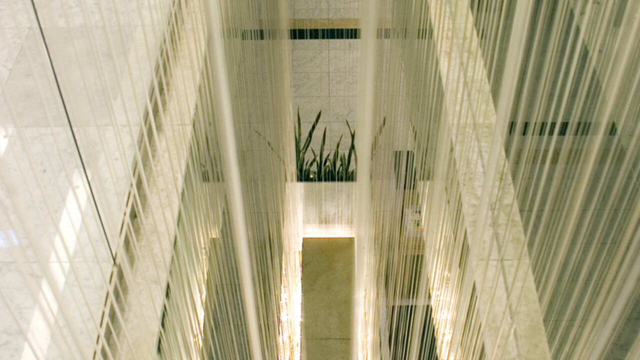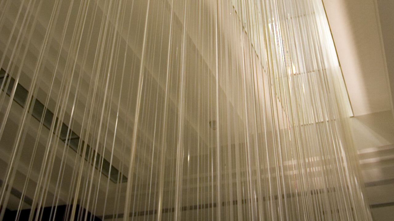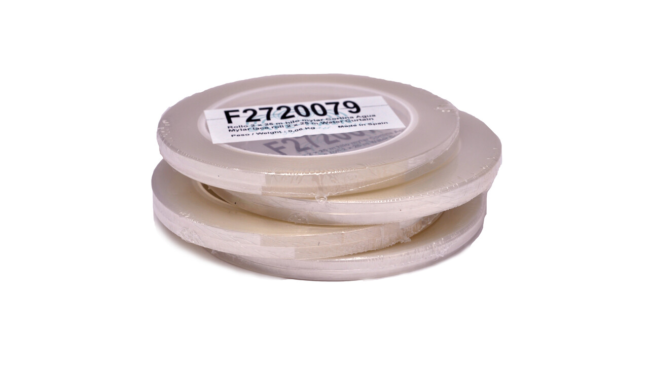 Вода сверху непрерывно течет через форсунку по леске, которую можно установить даже под углом 15º без отрыва капель от нее. На другом конце майларовой лески крепится специальный груз для необходимого натяжения. В дополнение, перед грузом можно поставить каплеуловитель, который препятствует образованию брызг при соударении падающих струй о водную поверхность фонтана. Так называемый «нитевидный водопад» или «водный занавес» часто используется в комнатных декоративных фонтанах, офисных помещениях, торговых центрах для украшения лестниц или лифтовых пространств. Благодаря тому, что фонтан практически бесшумен и не разбрызгивает воду, он очень удобен для декорирования интерьеров. Максимальная высота нитевидного фонтана составляет 6 метров.