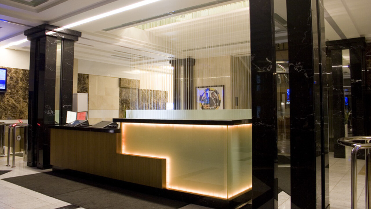 Вода сверху непрерывно течет через форсунку по леске, которую можно установить даже под углом 15º без отрыва капель от нее. На другом конце майларовой лески крепится специальный груз для необходимого натяжения. В дополнение, перед грузом можно поставить каплеуловитель, который препятствует образованию брызг при соударении падающих струй о водную поверхность фонтана. Так называемый «нитевидный водопад» или «водный занавес» часто используется в комнатных декоративных фонтанах, офисных помещениях, торговых центрах для украшения лестниц или лифтовых пространств. Благодаря тому, что фонтан практически бесшумен и не разбрызгивает воду, он очень удобен для декорирования интерьеров. Максимальная высота нитевидного фонтана составляет 6 метров.