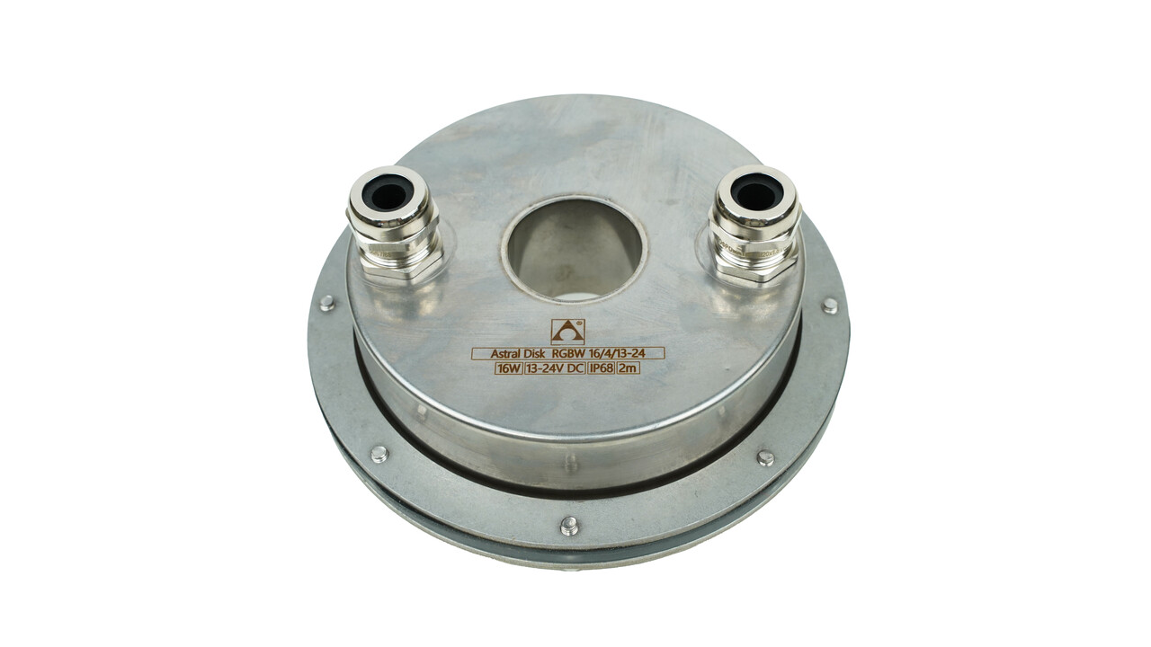 Все модели поставляются с двумя водонепроницаемыми кабельными вводами. Данная конструктивная особенность позволяет при установке кольцевого светильника Astral Disc непосредственно на объекте расключить их между собой, не используя дополнительных клеммных коробок и закладных деталей. Тем самым, сделать монтаж подводной подсветки в фонтане максимально аккуратно и не использовать лишний подводный кабель. Это является уникальным неоспоримым преимуществом наших Astral Disc, по сравнению со светильниками других производителей, где присутствует только один кабельный ввод с уже подключенным кабелем. По запросу на нашем производстве возможно изготовление гирлянд из светильников с желаемой длиной кабеля между прожекторами.