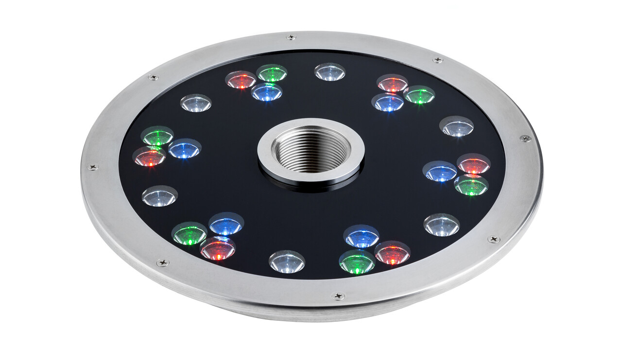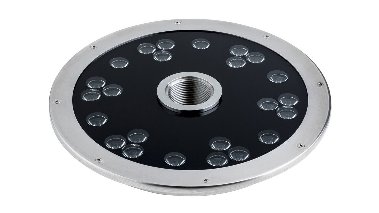 Самый мощный в области фонтаностроения кольцевые светильники Circular 300 нашел широкое применение в больших фонтанах с высотой струй до 20 метров и выше. Достаточно всего одного прожектора Circular 300 для освещения высоких фонтанов. Он имеет 24 ультраярких светодиодов высокой эффективности с линзами 8º. Невероятные технологии позволили получить на выходе мощность 80Вт, а центральное отверстие с внутренней резьбой 1½” сделали этот светильник хитом в области красивых цветомузыкальных фонтанов. Кольцевой тип этих светильников используется для непосредственного монтажа форсунки в середине корпуса Circular 300. Таким образом, луч света точно следует за потоком воды под любым углом.