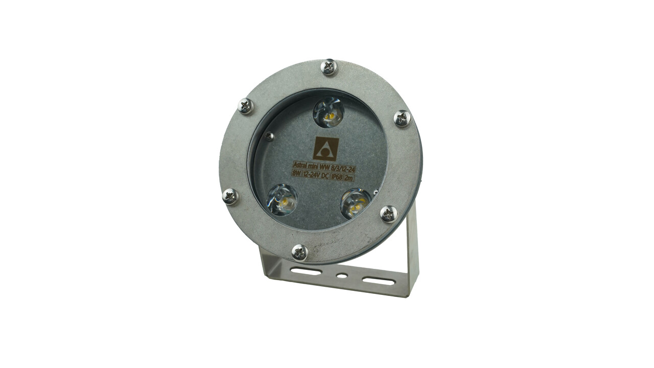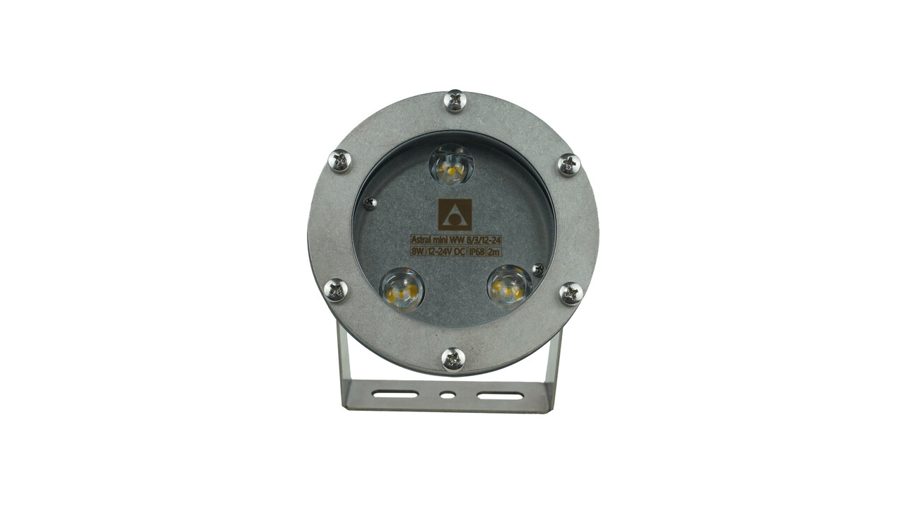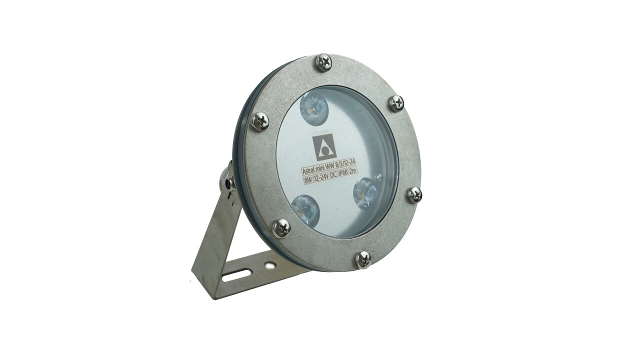 Подводный светильник серии Astral Mini компактный и в тоже время достаточно мощный для подсветки струй фонтана высотой до 3 метров, в зависимости от модификации прожектора. При низком энергопотреблении и высокой яркости Astral Mini - идеальное соотношение цены и качества в сегменте подсветки не только фонтанов, но и водоемов. Светильник обладает невероятной интенсивностью и насыщенностью цвета, а также работает без мерцания. Прожектор сертифицирован и обладает классом защиты IP68. Его корпус выполнен из качественной, ударопрочной и устойчивой к коррозии нержавеющей стали AISI 304.